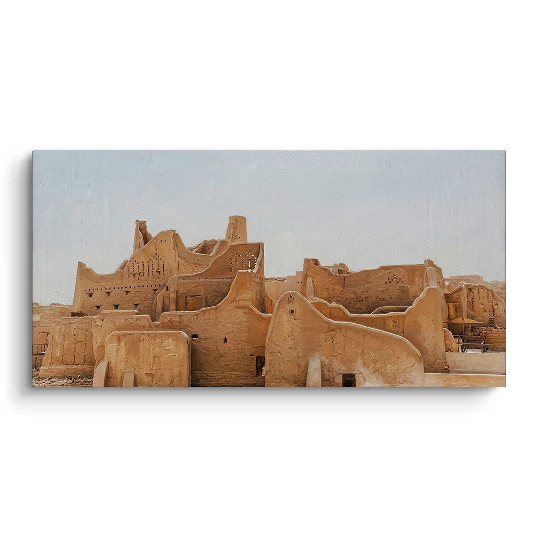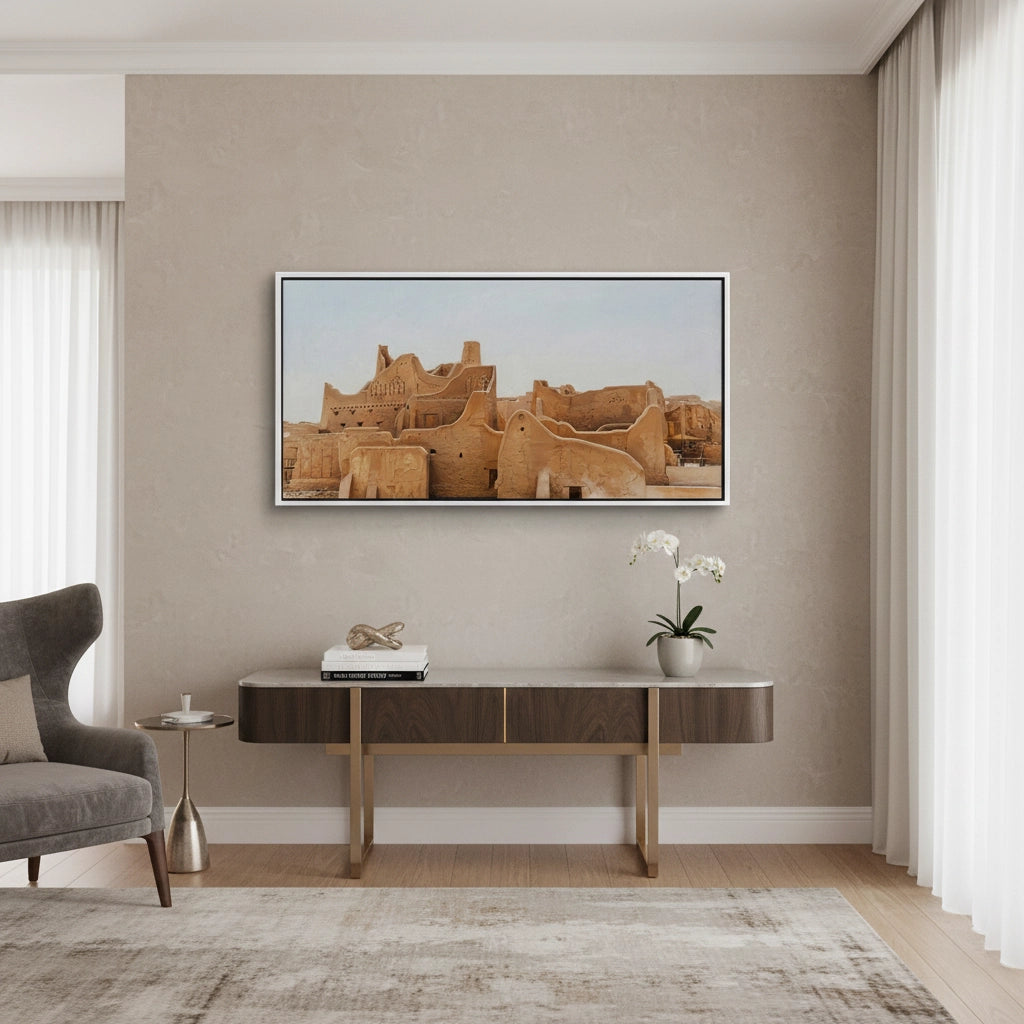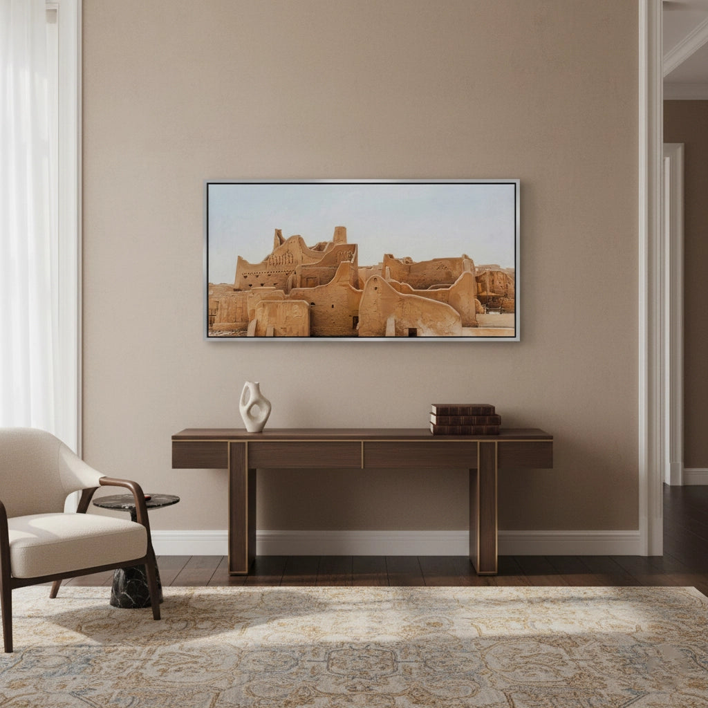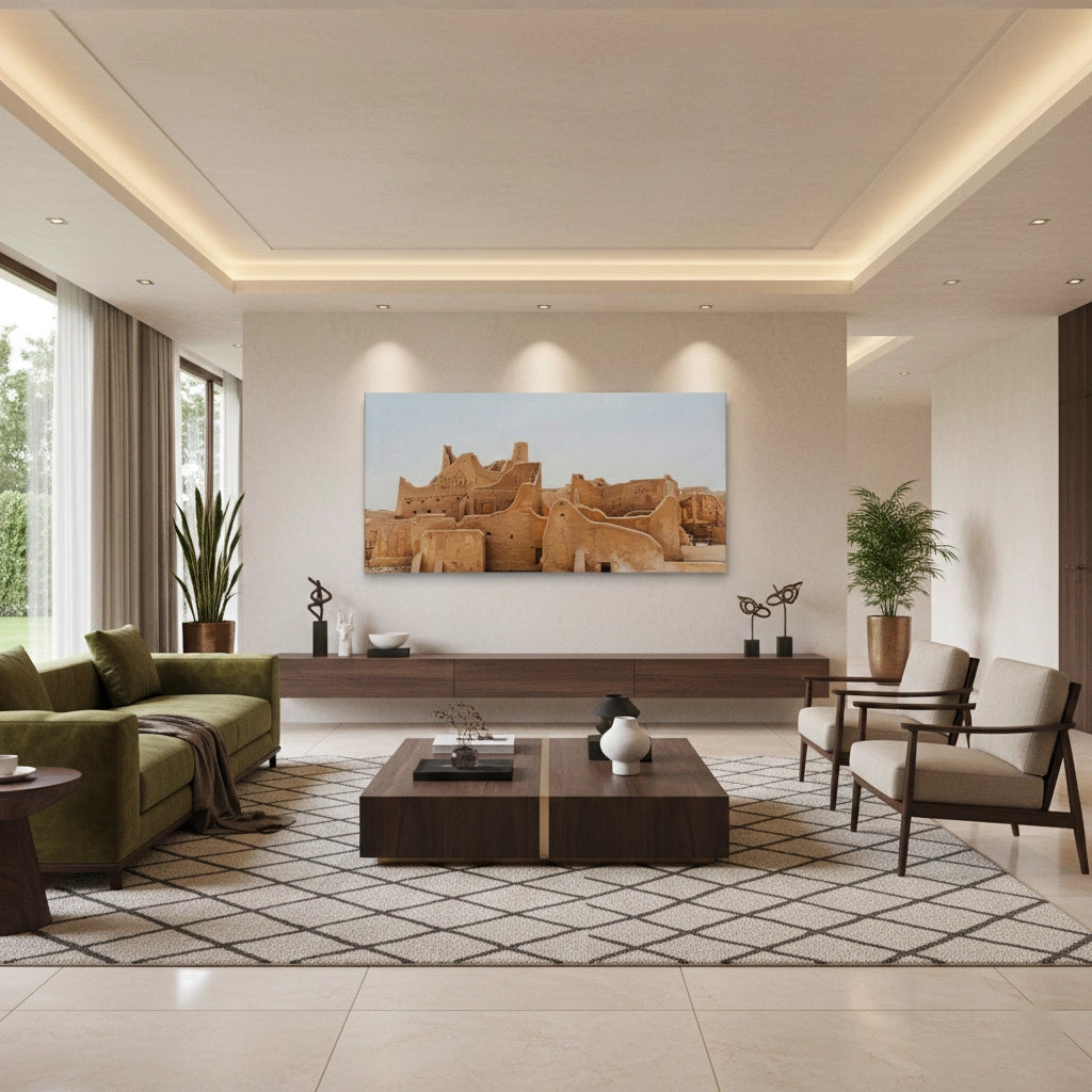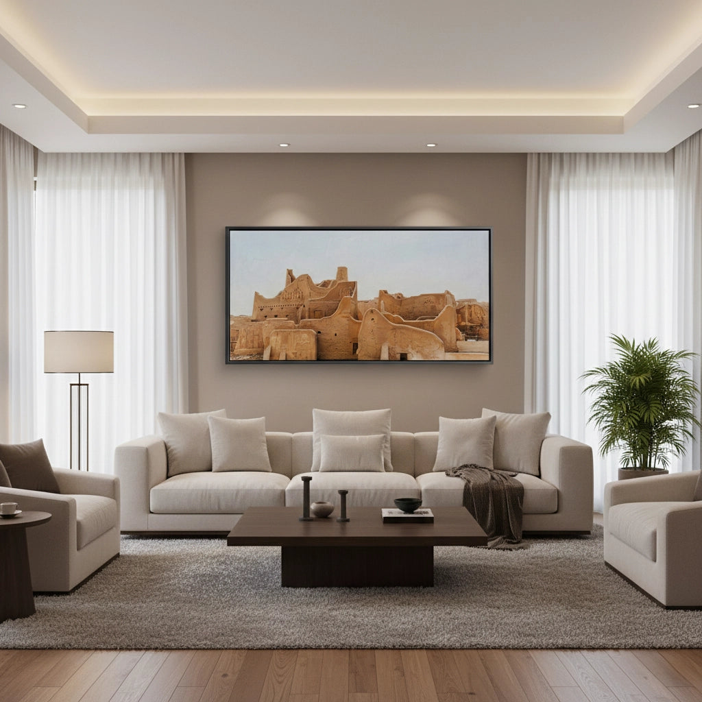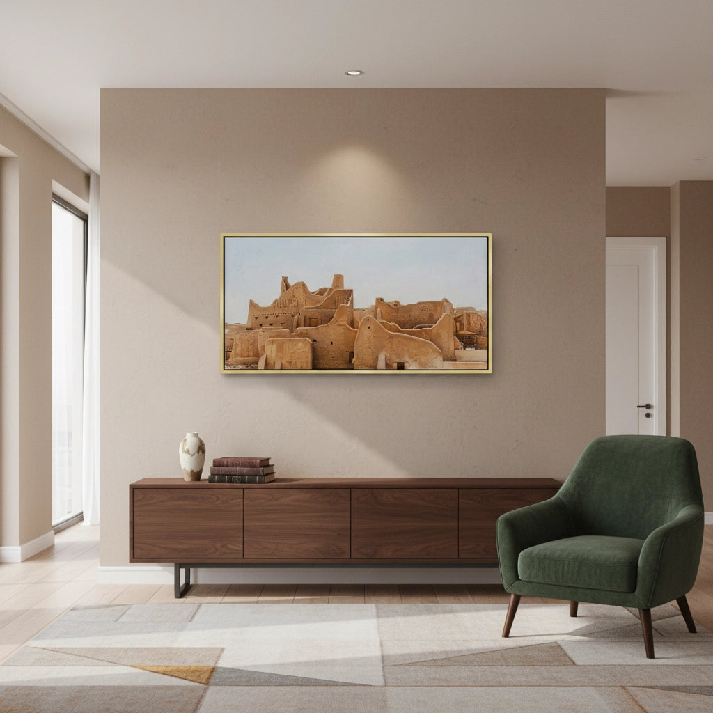 Immerse yourself in the roots of Arabian history with The City of Earth. This evocative photograph captures the historic At-Turaif district in Diriyah, showcasing the iconic Najdi mud-brick architecture and its organic, flowing silhouettes. The warm, earthy tones of sun-dried clay tell a story of resilience and timeless heritage. Finished with our signature premium vertical texture, this art print offers a rich tactile experience that brings the rugged beauty of the "City of Earth" into your modern space. An exceptional statement piece for a heritage-themed lounge, a high-end study, or a luxury residence in Dubai or Riyadh.