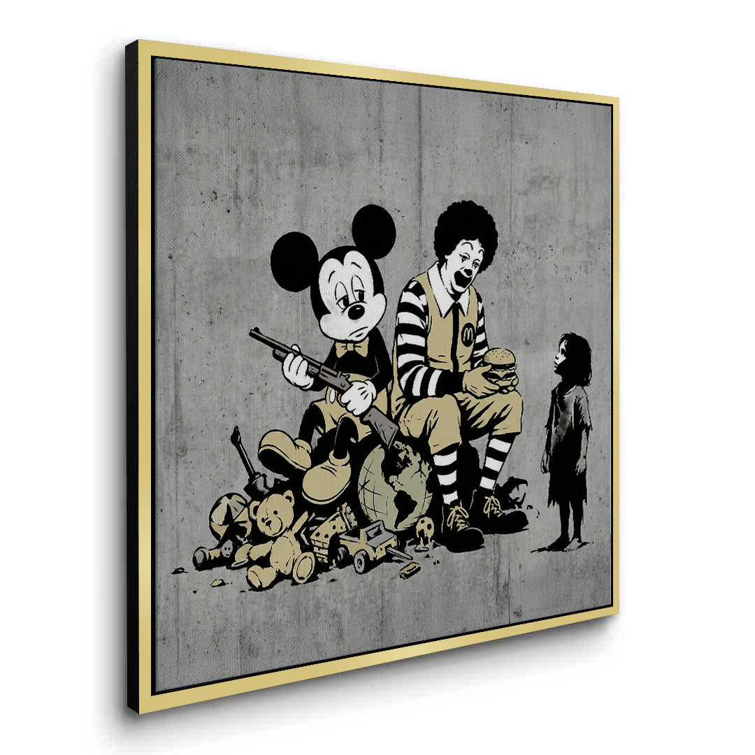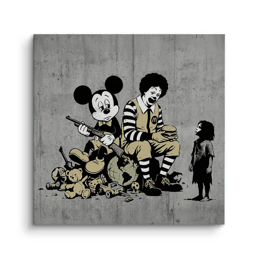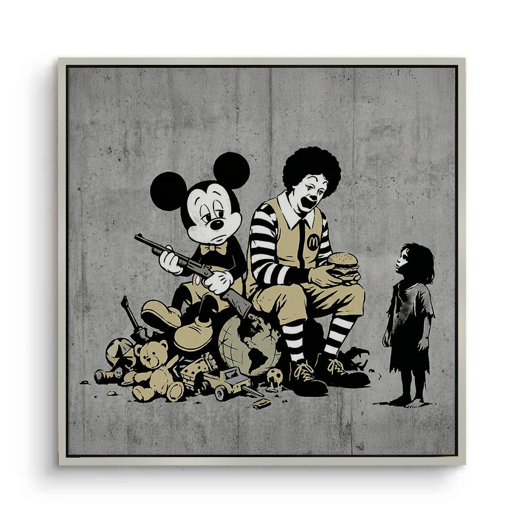 Make a powerful social statement with The Cost of Consumption from Jasmine Art’s Banksy series. This provocative street-art piece features iconic pop-culture figures in a thought-provoking composition that critiques modern consumerism. Its bold stencil style and striking vintage yellow accents bring an edgy, intellectual energy to any contemporary space. Finished with our signature premium vertical texture, this print offers exceptional tactile depth and a high-end gallery finish. A perfect conversation starter for a modern office, a creative studio, or an urban-style apartment in Dubai.