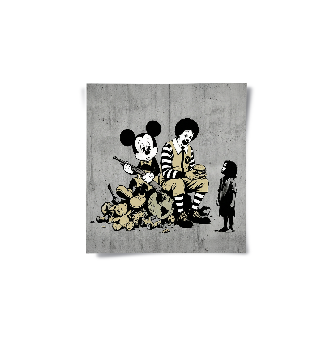 Make a powerful social statement with The Cost of Consumption from Jasmine Art’s Banksy series. This provocative street-art piece features iconic pop-culture figures in a thought-provoking composition that critiques modern consumerism. Its bold stencil style and striking vintage yellow accents bring an edgy, intellectual energy to any contemporary space. Finished with our signature premium vertical texture, this print offers exceptional tactile depth and a high-end gallery finish. A perfect conversation starter for a modern office, a creative studio, or an urban-style apartment in Dubai.