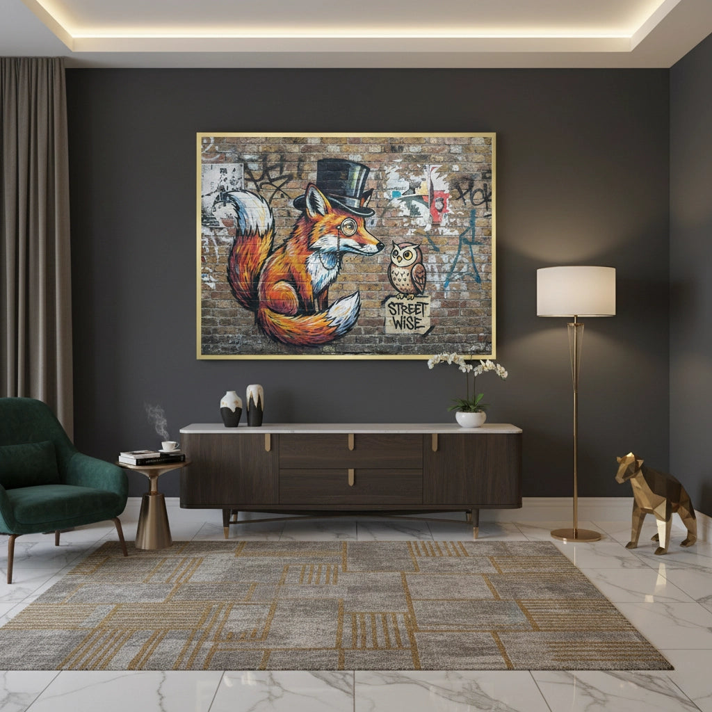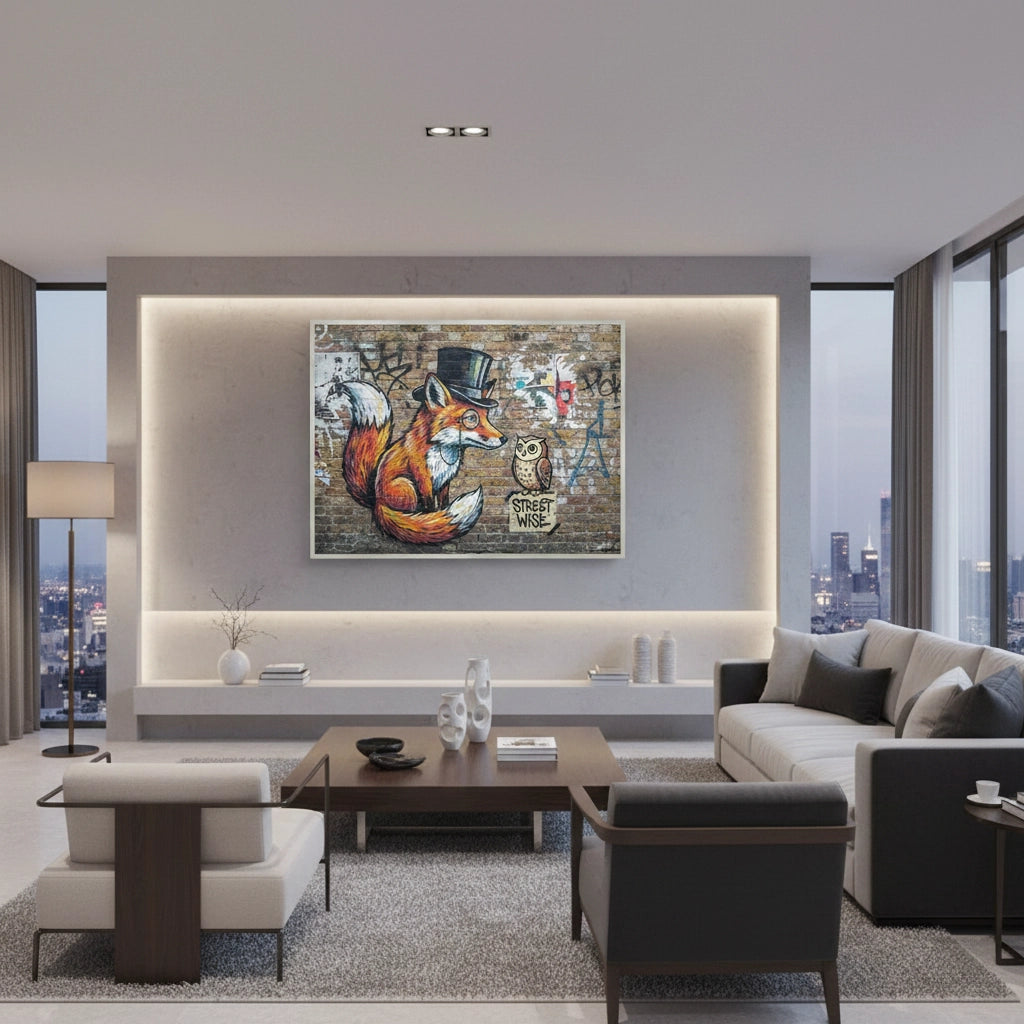 Add a touch of urban wit to your walls with The Dapper Fox and Owl from Jasmine Art’s Banksy series. This vibrant street-art piece features a sophisticated fox in a top hat and monocle alongside a "Street Wise" owl, set against a realistic distressed brick backdrop. The bold use of color splatters and detailed illustration brings an edgy yet refined energy to any space. Finished with our signature premium vertical texture, this print offers exceptional tactile depth and a high-end gallery finish. A perfect quirky addition for a modern study, a creative living room, or a trendy cafe in Dubai.