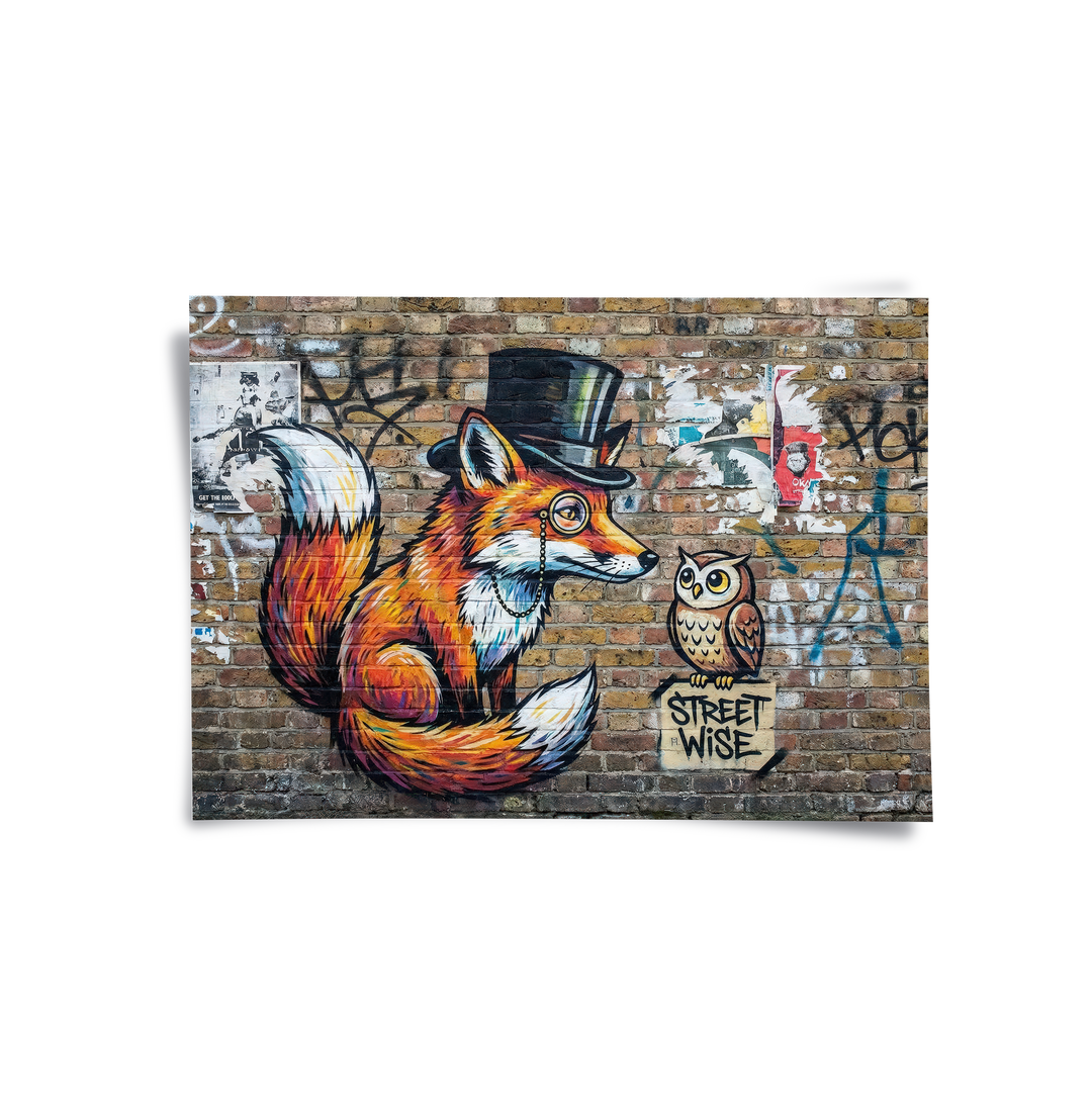Add a touch of urban wit to your walls with The Dapper Fox and Owl from Jasmine Art’s Banksy series. This vibrant street-art piece features a sophisticated fox in a top hat and monocle alongside a "Street Wise" owl, set against a realistic distressed brick backdrop. The bold use of color splatters and detailed illustration brings an edgy yet refined energy to any space. Finished with our signature premium vertical texture, this print offers exceptional tactile depth and a high-end gallery finish. A perfect quirky addition for a modern study, a creative living room, or a trendy cafe in Dubai.