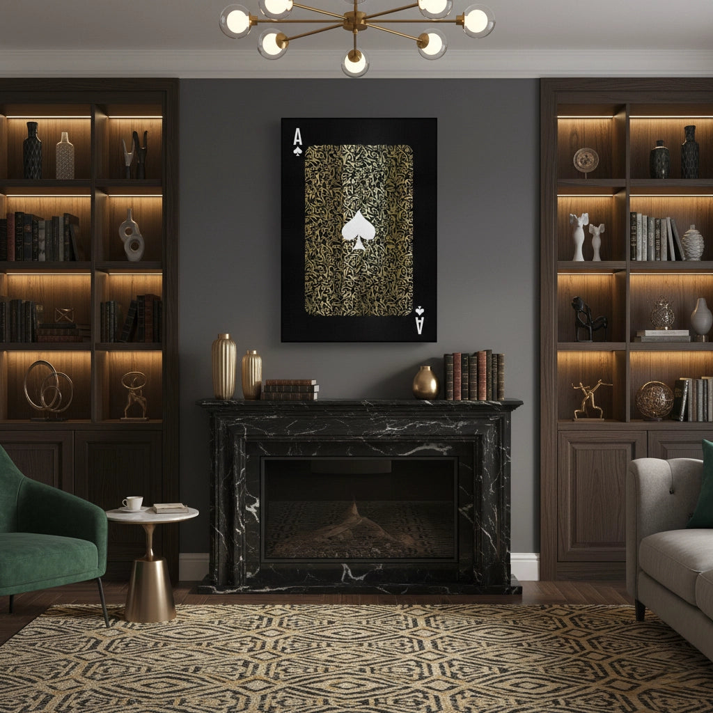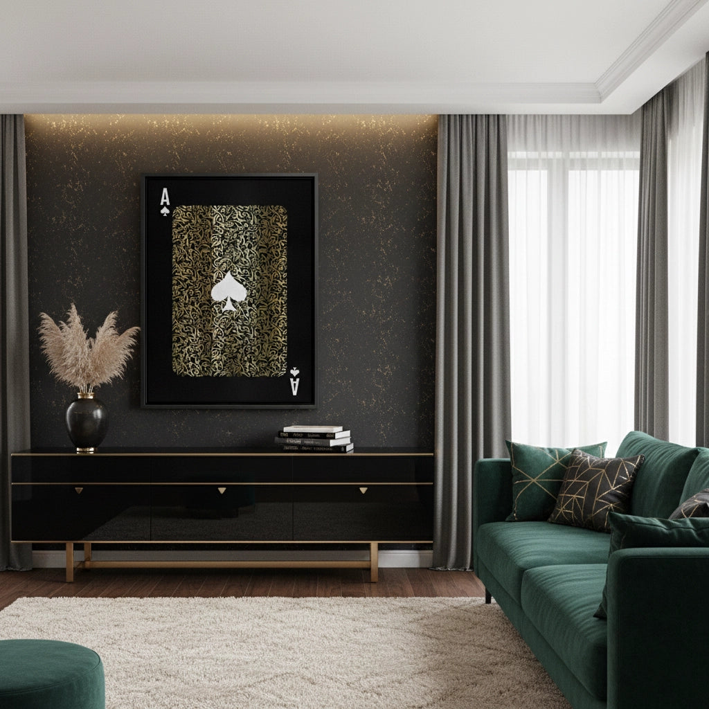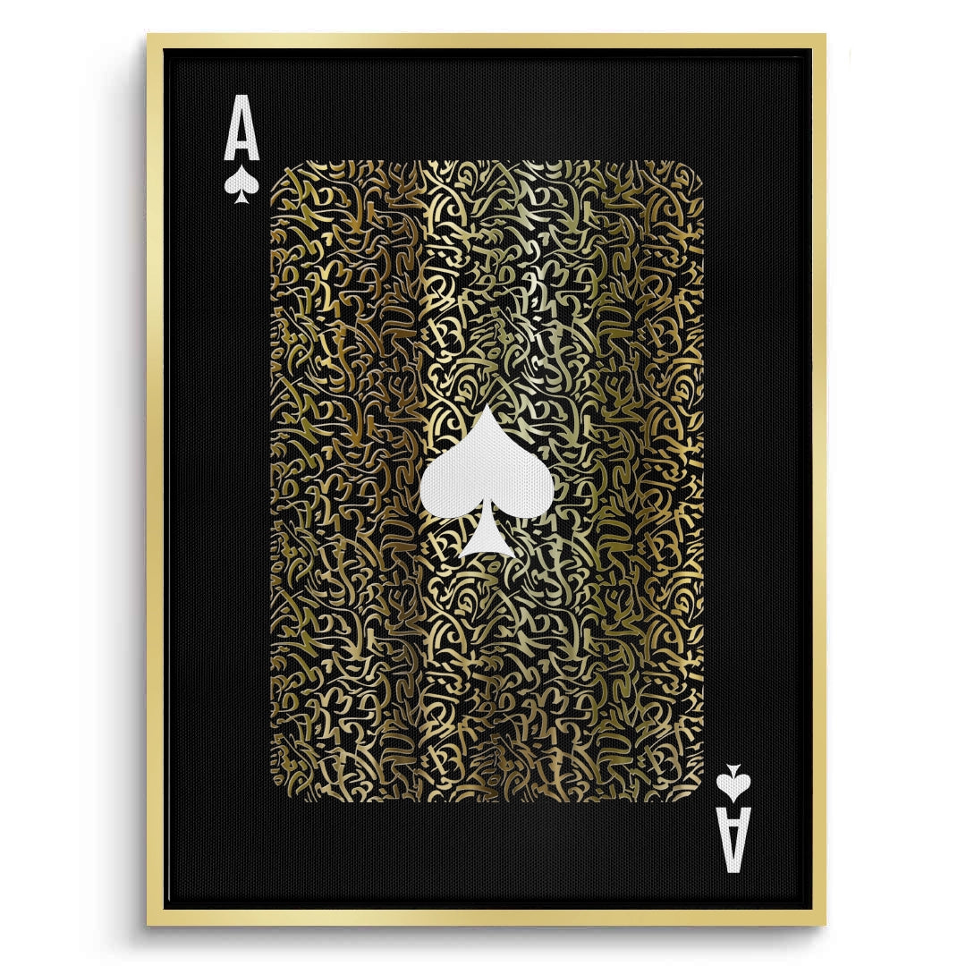 The commanding Emperor's Spade - Gold Calligra-Card print is a statement of power and prestige. This high-impact piece transforms the iconic Ace of Spades playing card motif into a work of art. The card's body is intricately detailed with a rich, brocade-like pattern of dense metallic gold Arabic calligraphy, set against a deep black, pinstriped background. The central white spade symbol and the corner 'A's provide a bold, dramatic contrast. Ideal for adding a masculine, bold, and modern luxury accent to a games room or bachelor pad in Dubai.
