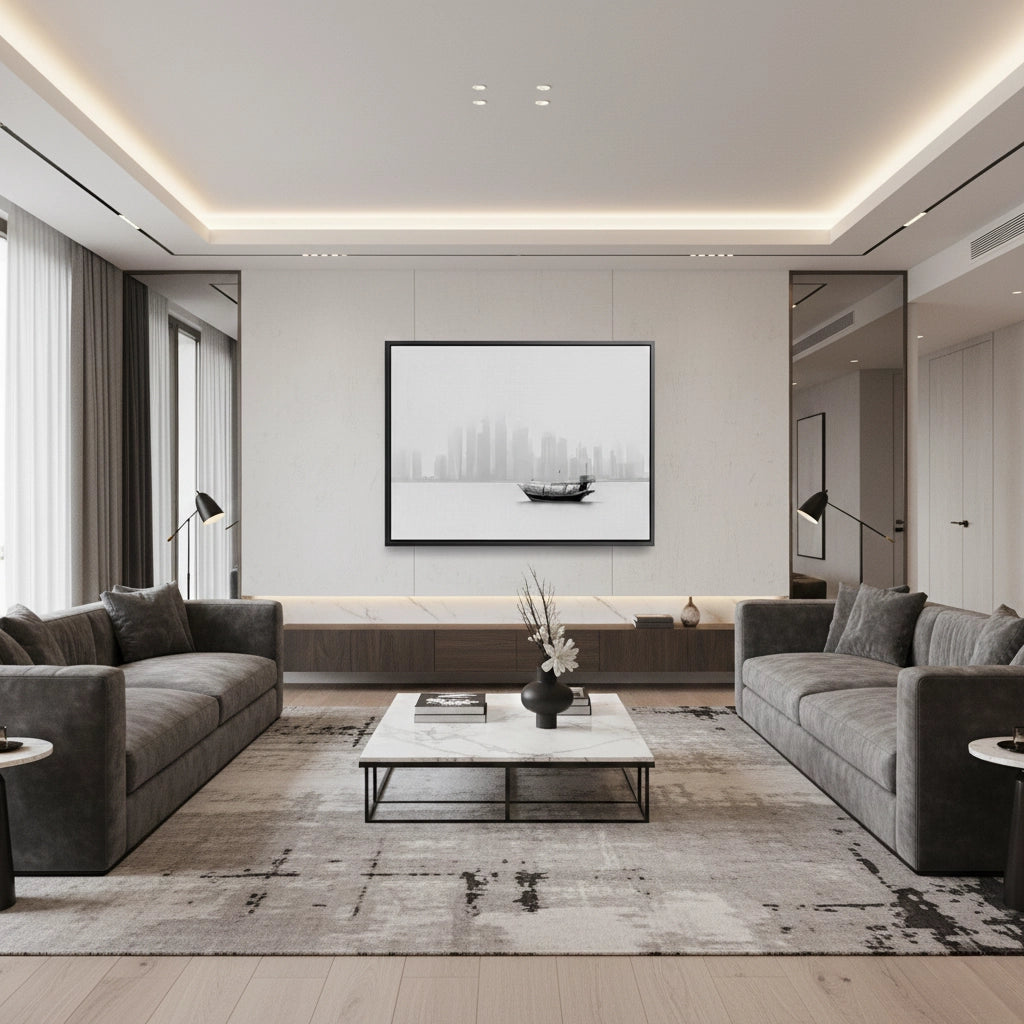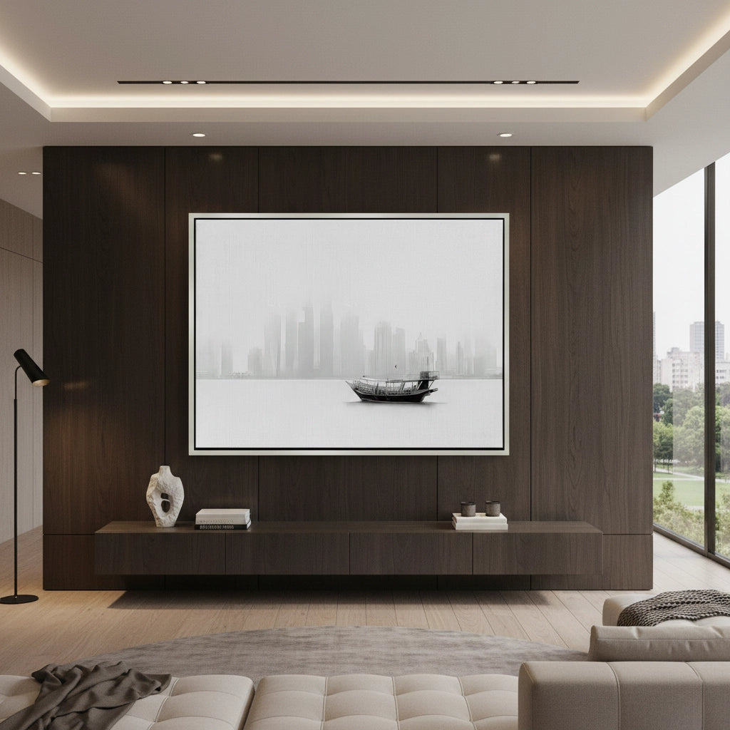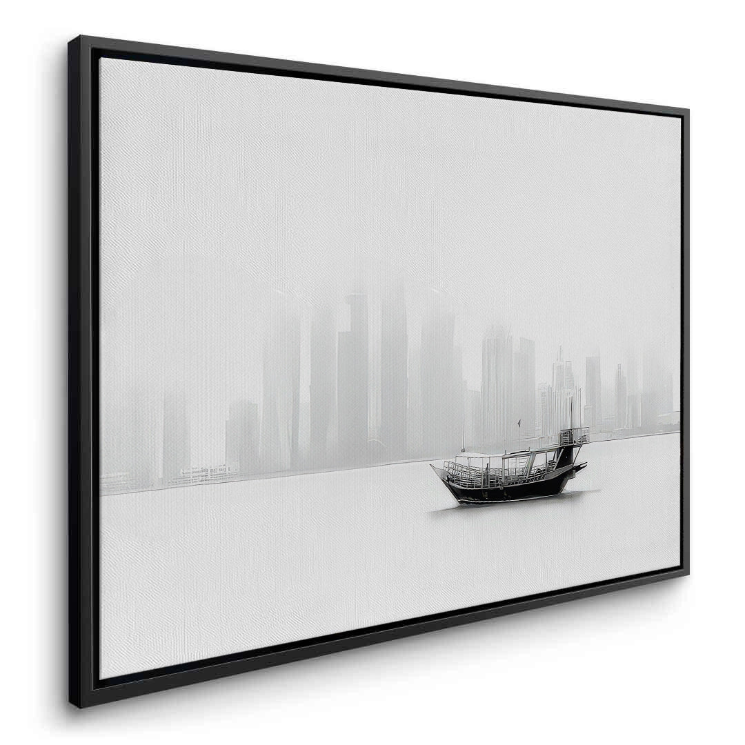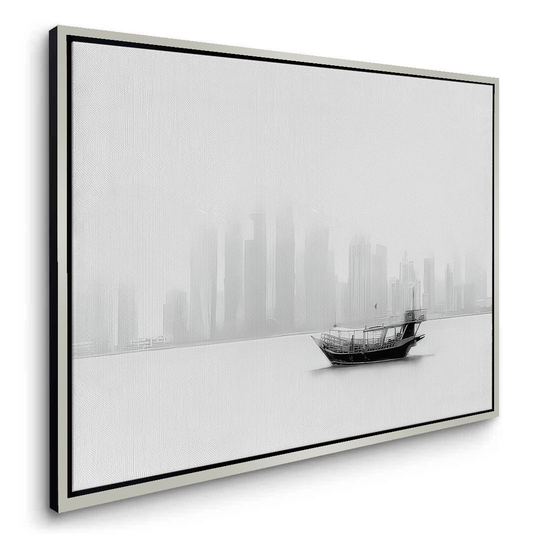Experience the ethereal beauty of the Arabian Gulf with The Foggy Dhow art print. This captivating black and white photograph captures a traditional dhow boat floating peacefully before the fog-shrouded skyline of Doha, Qatar. The minimalist composition and soft monochrome tones bridge the gap between ancient heritage and futuristic architecture. Finished with our signature premium vertical texture, this print offers a high-end tactile finish that adds depth to the atmospheric scene. A perfect statement piece for a minimalist office, a serene bedroom, or a luxury lounge in Dubai.