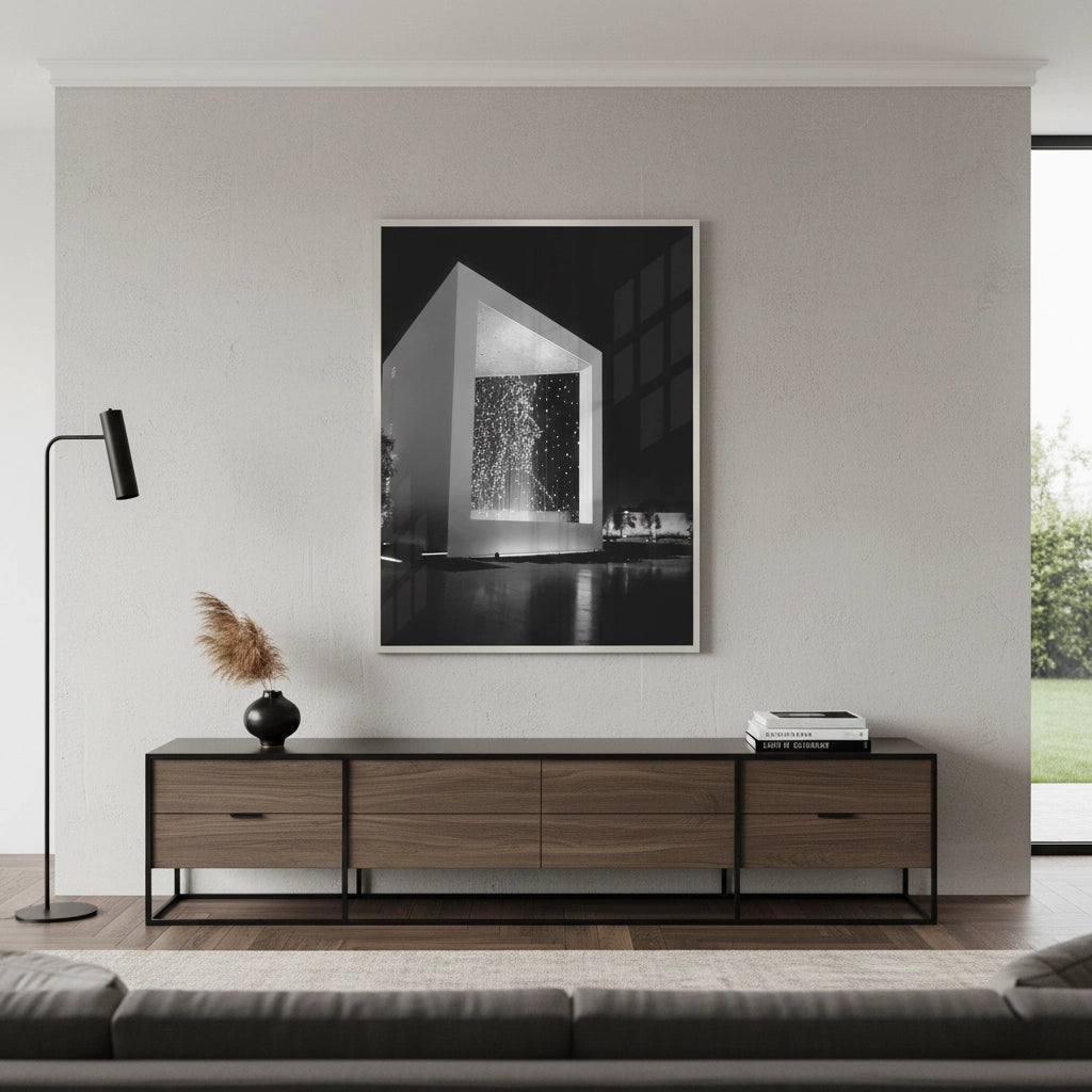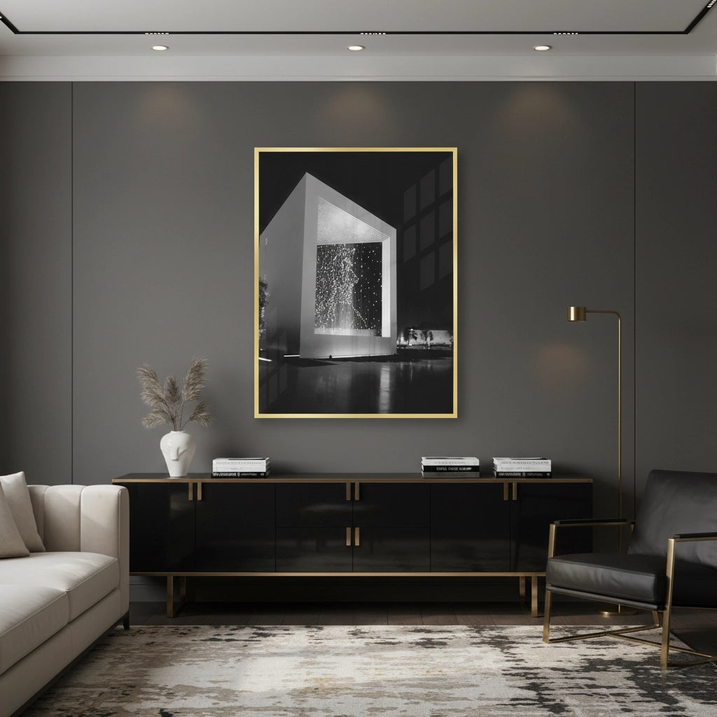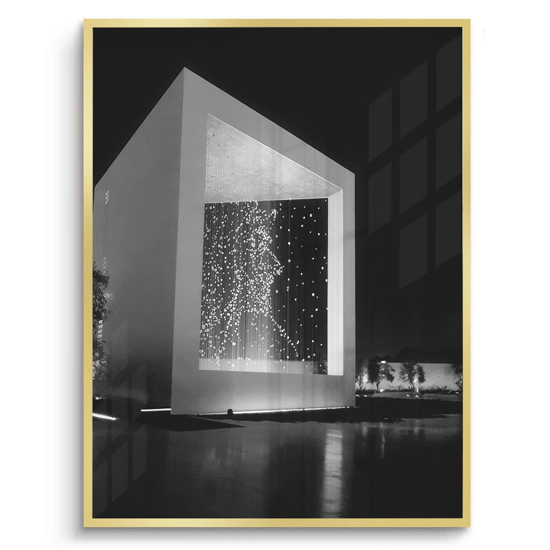 Honor the enduring legacy of the UAE’s founding father with The Founder’s Memorial art print. This powerful black and white photograph captures the celestial beauty of "The Constellation," where suspended light points form a radiant portrait of Sheikh Zayed bin Sultan Al Nahyan. The stark contrast between the monumental pavilion and the ethereal glow of the stars creates a deeply moving atmosphere. Finished with our signature premium vertical texture, this piece provides a high-end gallery finish that adds depth to every light and shadow. A profound and sophisticated addition to a luxury lounge, executive office, or heritage-inspired home in Abu Dhabi or Dubai.