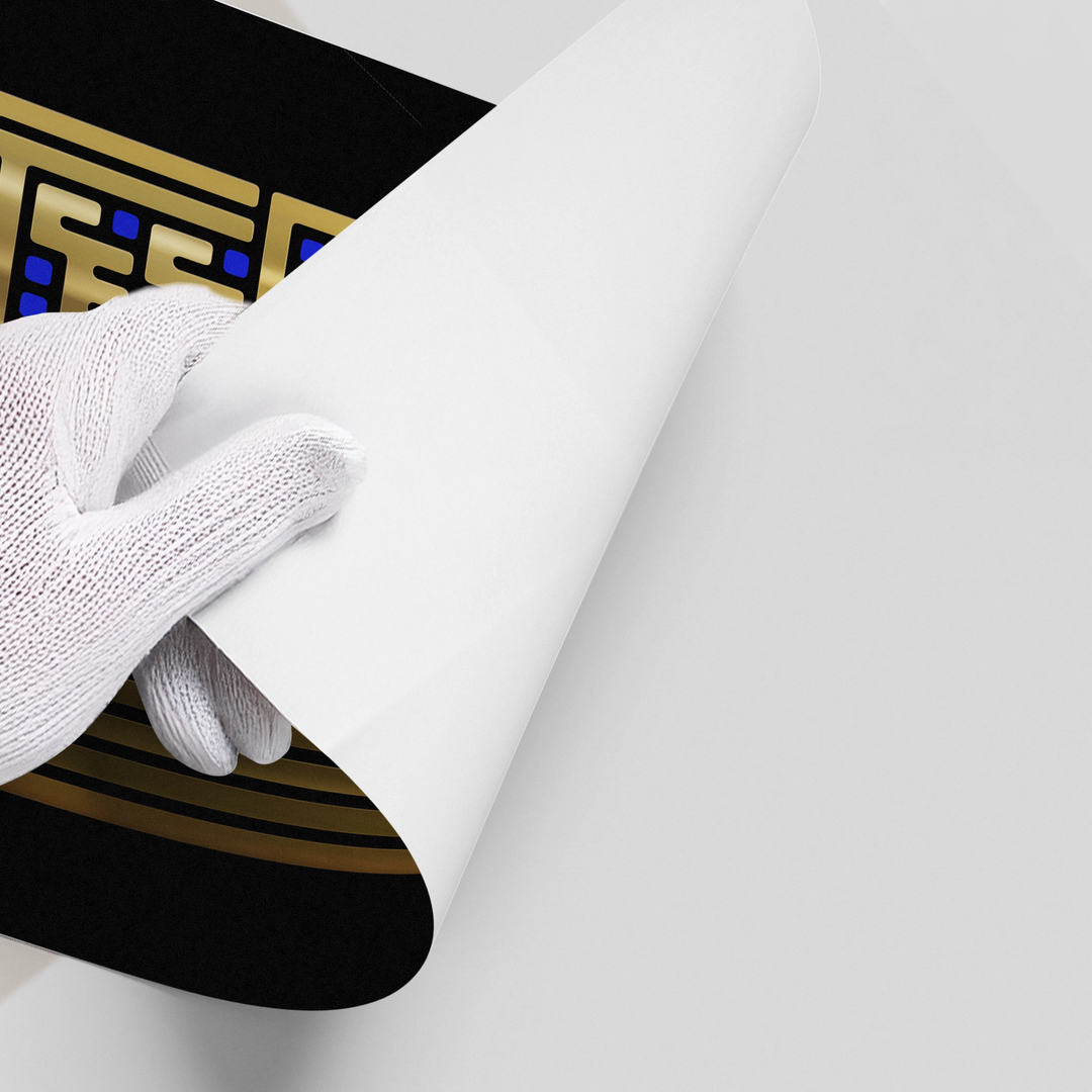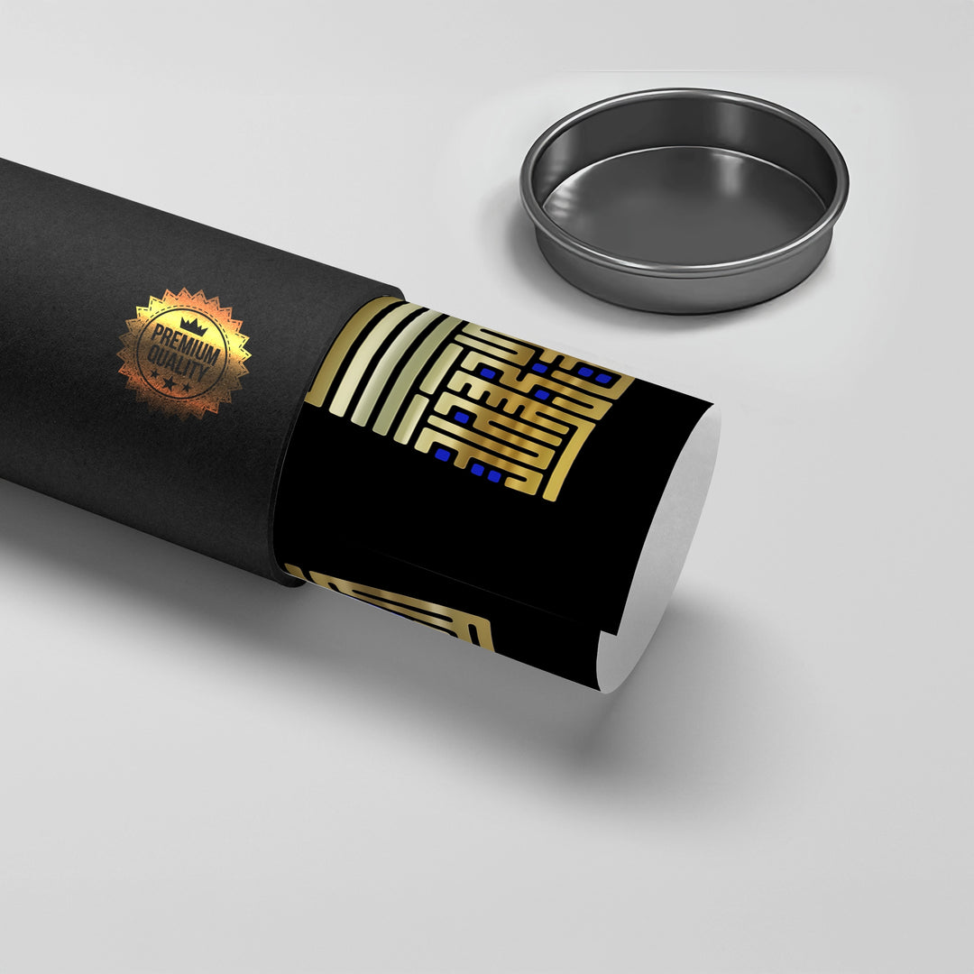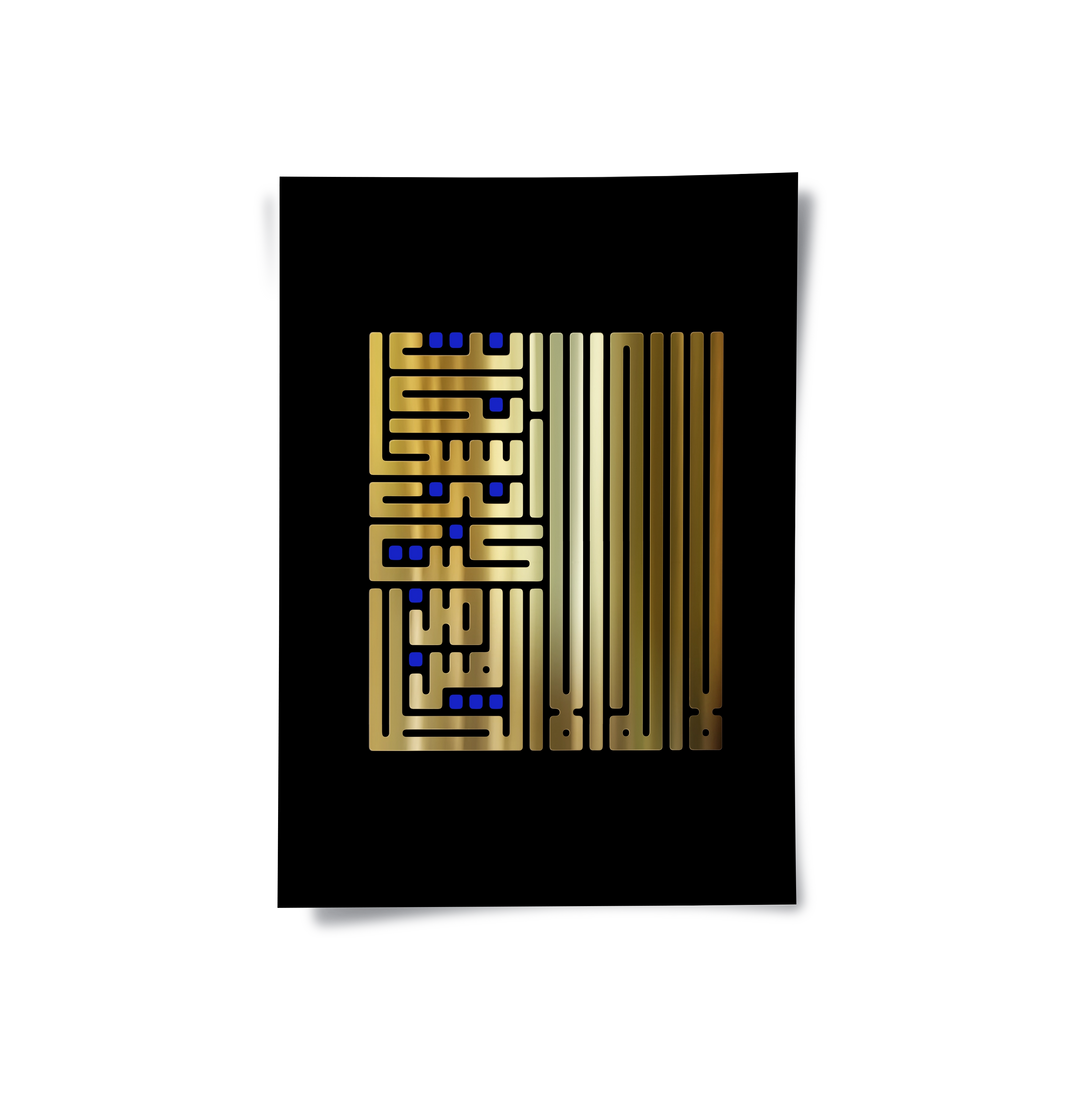 The commanding Geometric Kufic - Gold Bismillah print is a perfect blend of ancient scripture and modern geometry. The foundational phrase Bismillah Al-Rahman Al-Raheem is powerfully rendered in luminous metallic gold Square Kufic calligraphy, forming a highly structured, vertical composition. The design is beautifully contrasted by sleek vertical gold bars and subtle blue accents, all set against a deep black, textured background. This piece offers a minimalist yet opulent spiritual statement. Ideal for adding sophisticated, contemporary Islamic elegance to any luxury interior in Dubai.