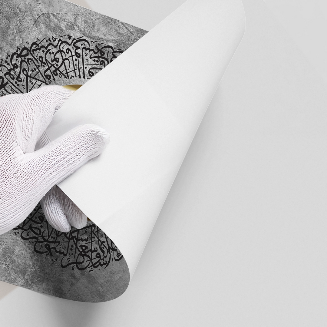 The profound Golden Circle of Protection print is a luxurious blend of sacred text and modern design. It features dense, intricate Arabic calligraphy (likely Ayat al-Kursi, the Verse of the Throne) forming a perfect black ring. The powerful script encircles a highly reflective metallic gold disc, symbolizing spiritual light and divine protection. Set against a textured, modern grey canvas, this piece makes a deeply meaningful, sophisticated, and contemporary statement. Ideal for adding spiritual elegance and protection to any modern home or office in Dubai.