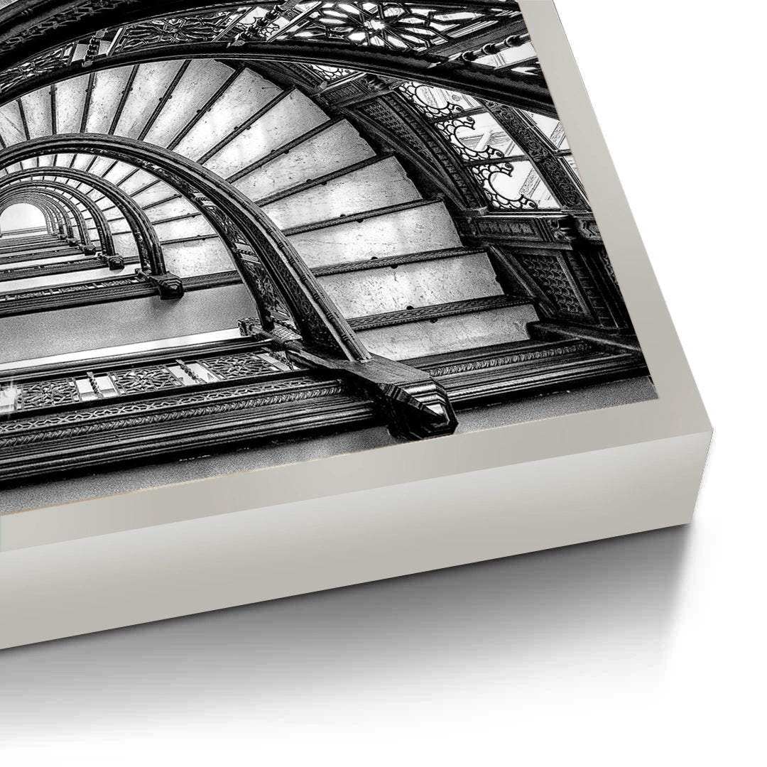 Immerse yourself in the captivating symmetry of The Grand Helix. This dramatic black and white art print captures the breathtaking perspective of an ornate spiral staircase, highlighting its intricate wrought-iron craftsmanship and rhythmic geometric patterns. The monochrome palette enhances the interplay of light and shadow, creating a powerful visual statement of architectural depth. Finished with our signature premium vertical texture, this piece brings a sense of timeless grandeur and sophistication to any interior. It is an ideal masterpiece for a luxury lobby, a formal study, or a high-ceiling living space in Dubai.
