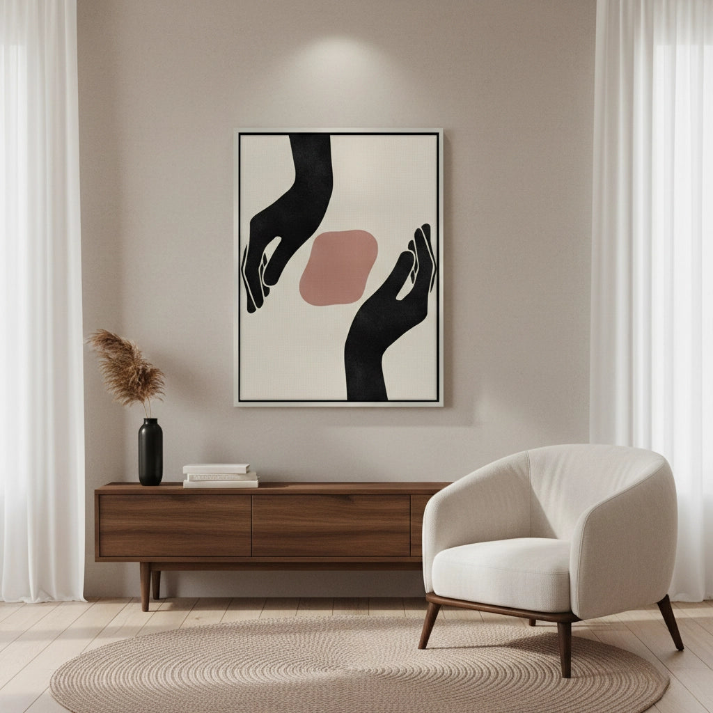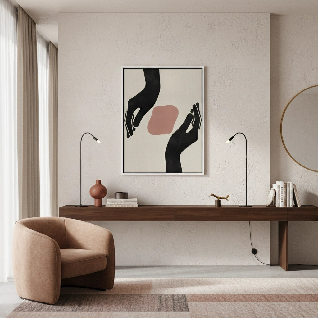 Celebrate the beauty of care and connection with The Guardian from Jasmine Art’s Bohemian collection. This minimalist masterpiece features elegant black hand silhouettes cradling a soft dusty rose organic shape, symbolizing protection and peace. The serene palette and fluid lines bring a touch of contemporary Boho-chic elegance to your home. Finished with our signature premium vertical-ribbed texture, this print offers exceptional tactile depth and a high-end gallery finish. A meaningful statement piece for a peaceful bedroom, a modern nursery, or a tranquil living room in Dubai.