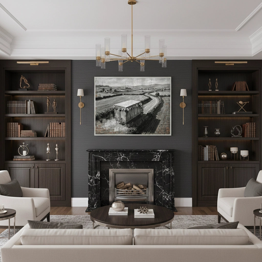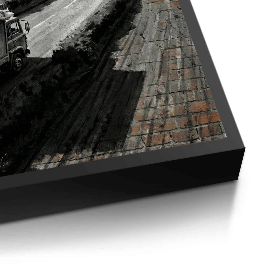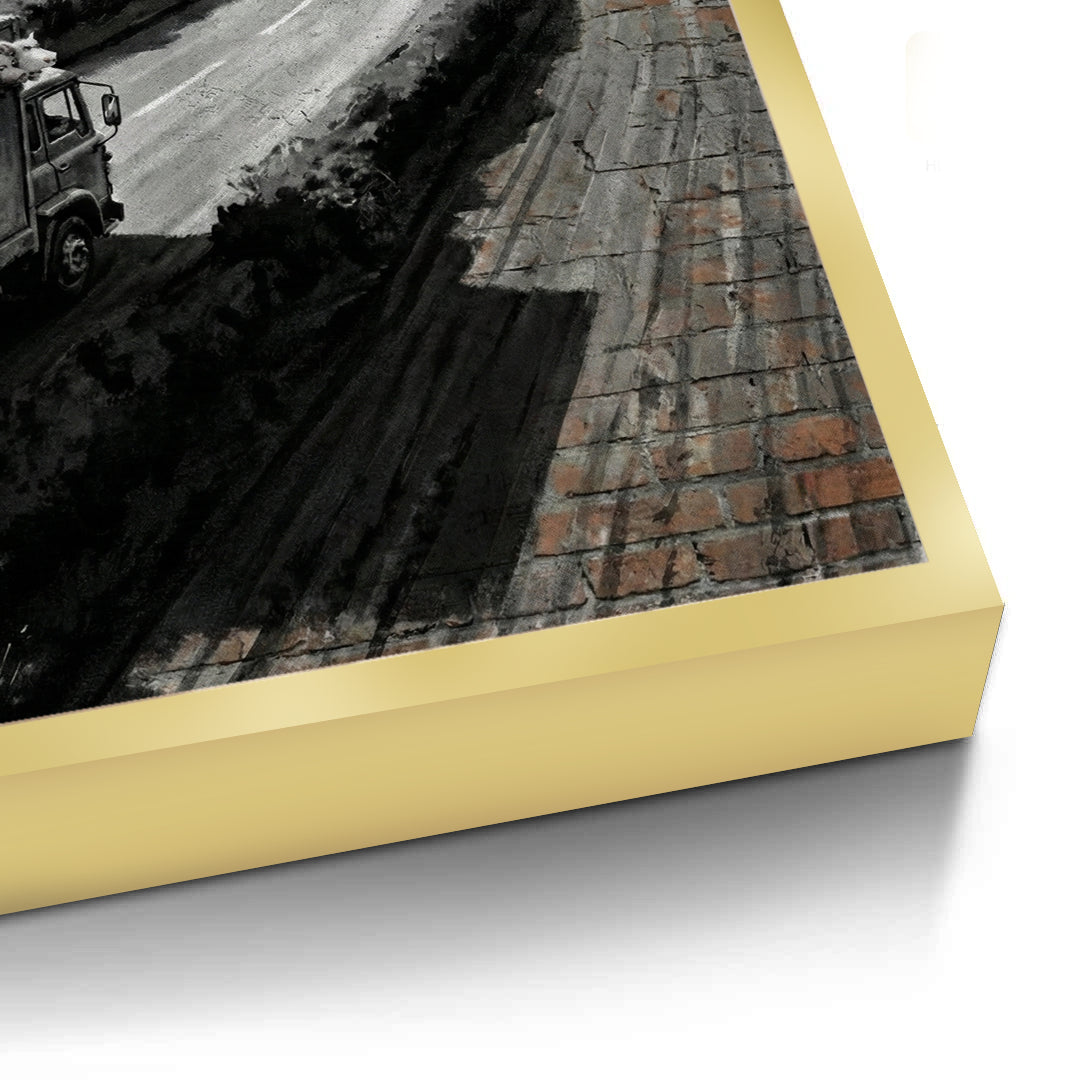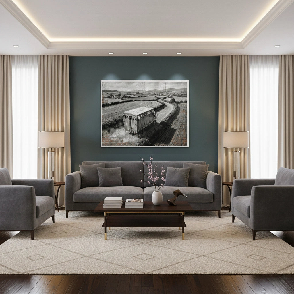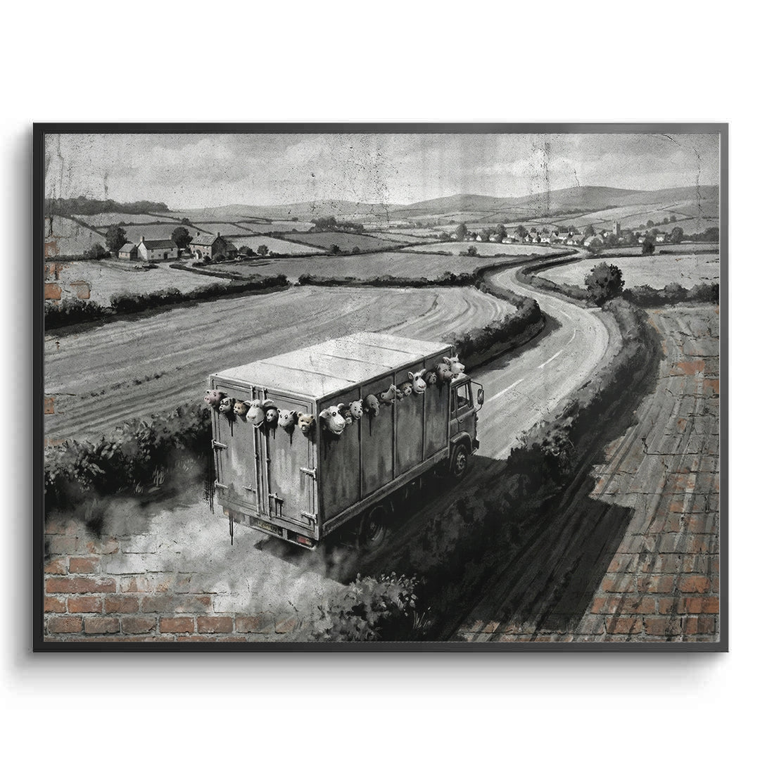 Make a powerful statement with The Journey Home from Jasmine Art’s Banksy series. This hauntingly beautiful piece features a truck carrying silent witnesses through a serene countryside, offering a profound commentary on animal rights and industrial society. The detailed monochromatic composition and cinematic depth create a compelling visual narrative for any modern space. Finished with our signature premium vertical texture, this print provides exceptional tactile depth and a high-end gallery finish. A bold, intellectual centerpiece for a modern living room, a creative studio, or a professional office in Dubai.