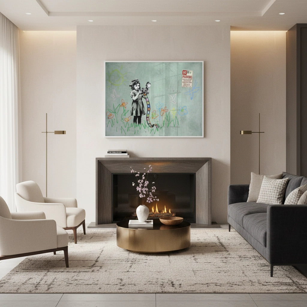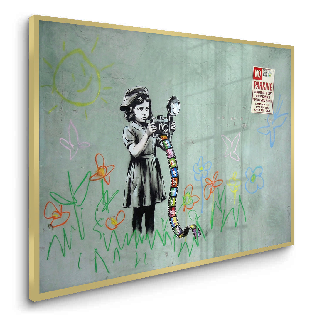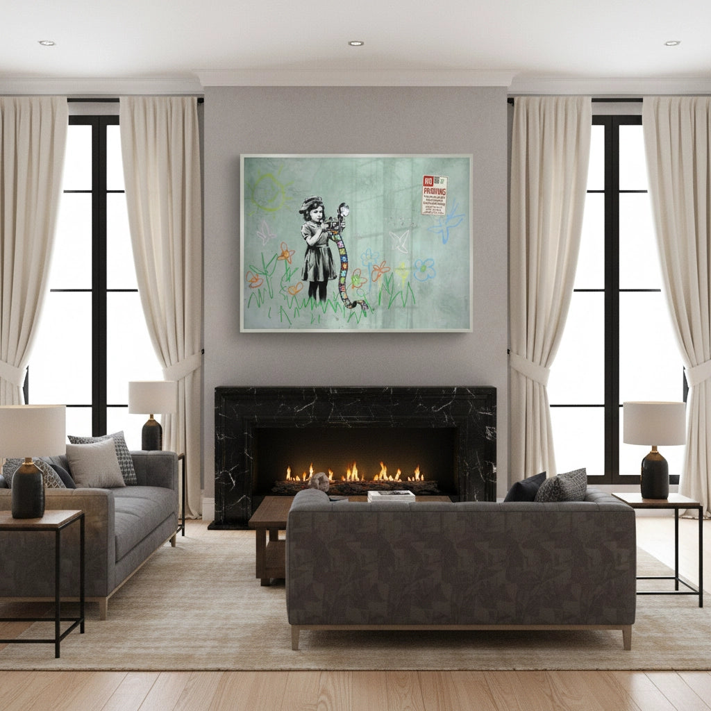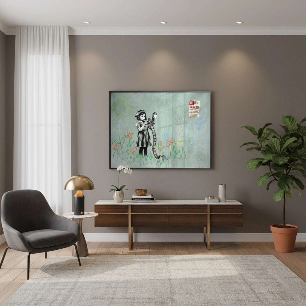 Capture the magic of imagination with The Little Photographer from Jasmine Art’s Banksy collection. This evocative piece features a monochromatic stencil of a young girl with a vintage camera, revealing a world of colorful film against a gritty urban backdrop filled with playful chalk doodles. The contrast between the rigid "No Parking" sign and the child’s creative freedom makes for a powerful social statement. Finished with our signature premium vertical texture, this print elevates street-style graffiti into a high-end gallery masterpiece. A charming and intellectual addition for a creative studio, hallway, or modern living room in Dubai.