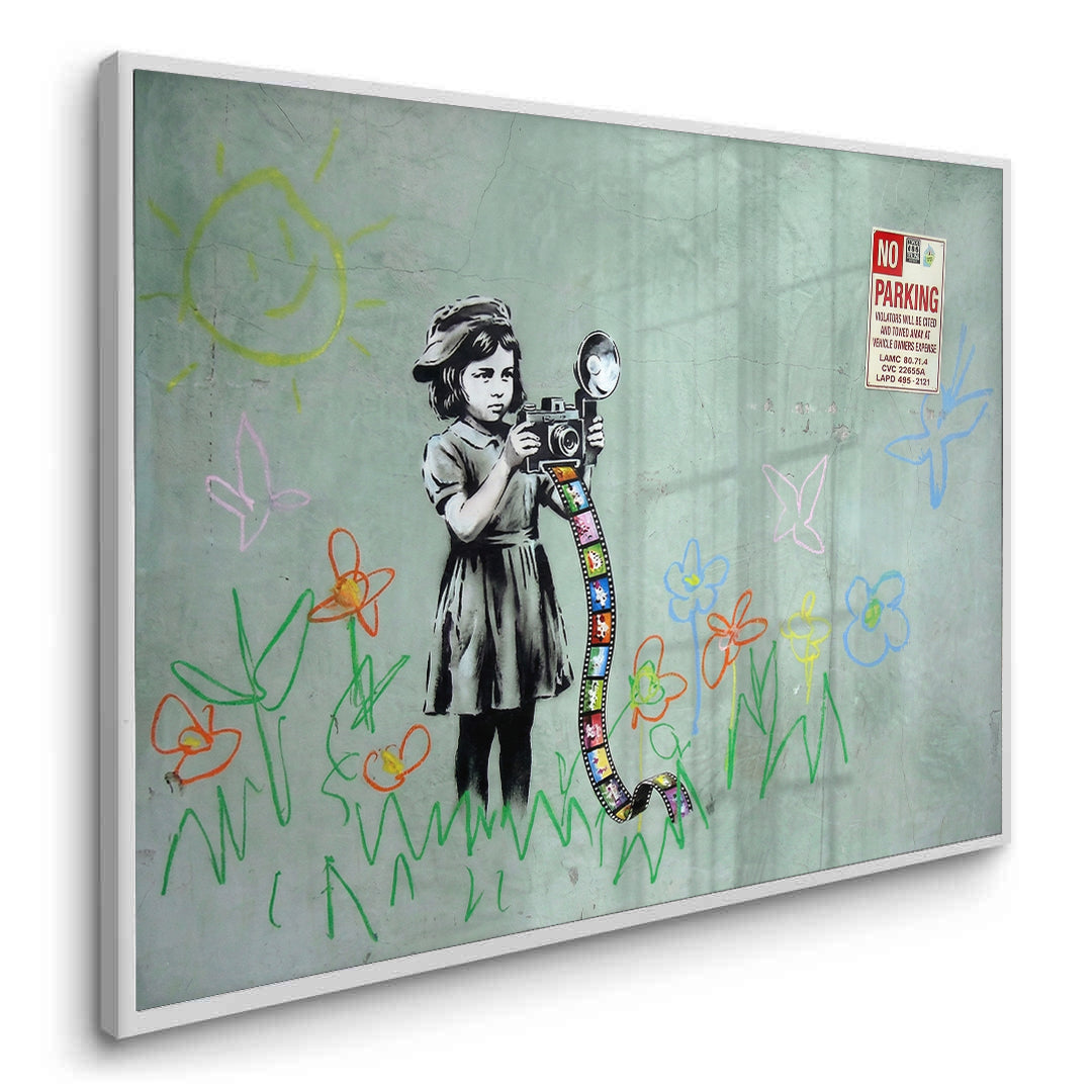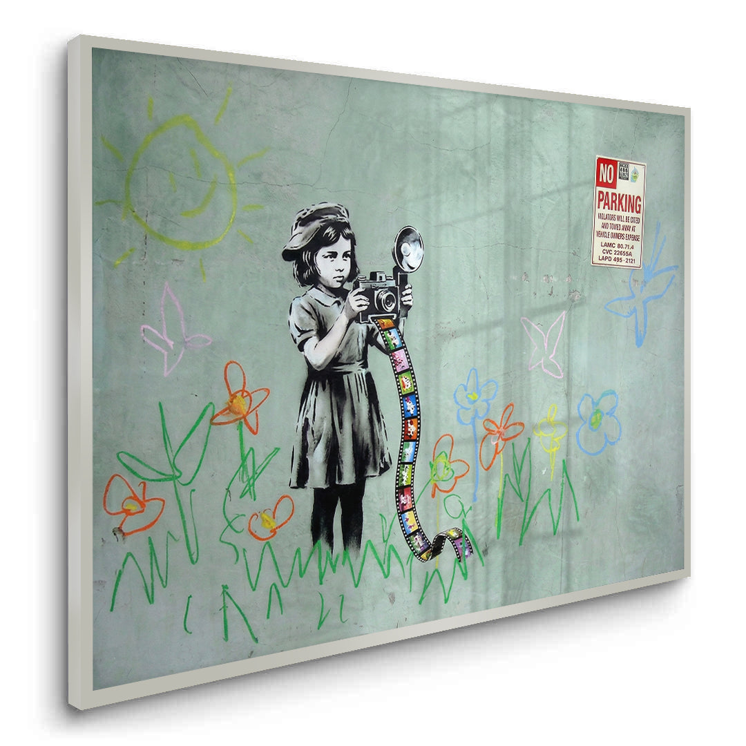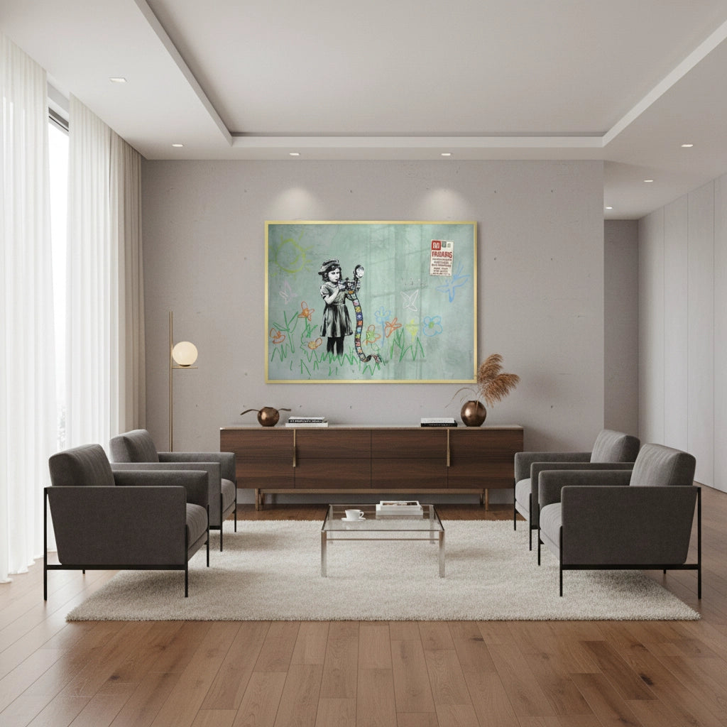Capture the magic of imagination with The Little Photographer from Jasmine Art’s Banksy collection. This evocative piece features a monochromatic stencil of a young girl with a vintage camera, revealing a world of colorful film against a gritty urban backdrop filled with playful chalk doodles. The contrast between the rigid "No Parking" sign and the child’s creative freedom makes for a powerful social statement. Finished with our signature premium vertical texture, this print elevates street-style graffiti into a high-end gallery masterpiece. A charming and intellectual addition for a creative studio, hallway, or modern living room in Dubai.