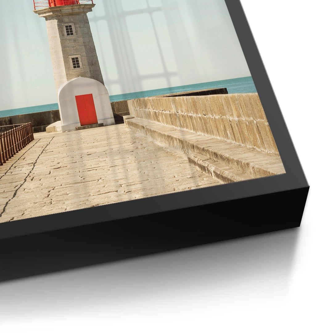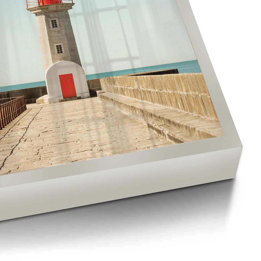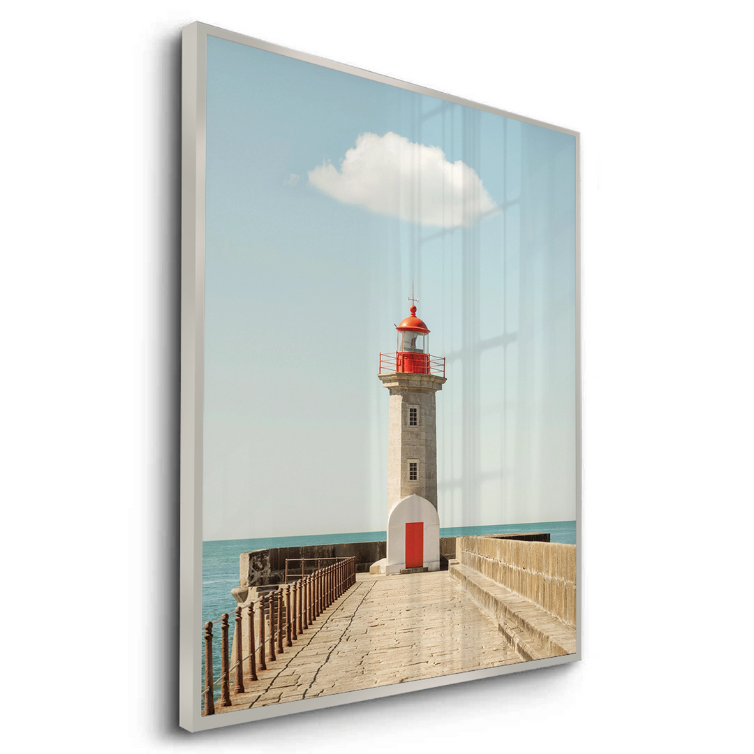 Discover the serene beauty of maritime architecture with The Lone Sentinel art print. This striking piece features a stately stone lighthouse with a vibrant red lantern, standing watch at the end of a weathered stone pier. The minimalist composition, highlighted by a single floating cloud in a clear blue sky, evokes a sense of peaceful solitude and timeless guidance. Finished with our signature premium vertical texture, this print offers a high-end tactile finish that adds depth to the coastal landscape. It is a perfect addition to a modern bedroom, a tranquil study, or a beach-inspired interior in Dubai.