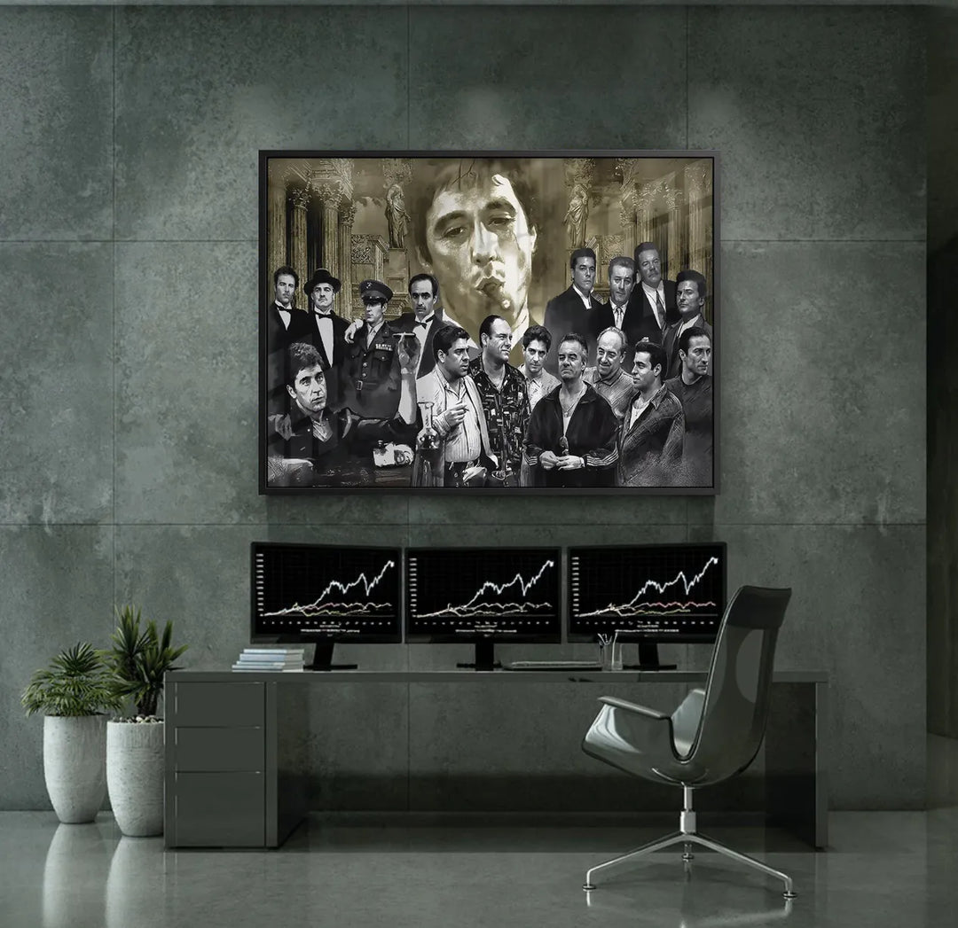 An artwork that embodies power, mystery, and timeless charisma. With dark undertones and striking contrasts, it reflects the bold aura of legends who ruled with influence and style. The composition carries a cinematic feel, blending strength, elegance, and intrigue into one statement piece.
