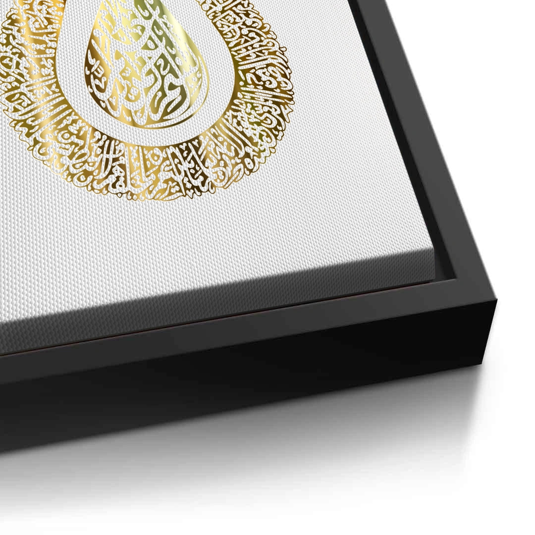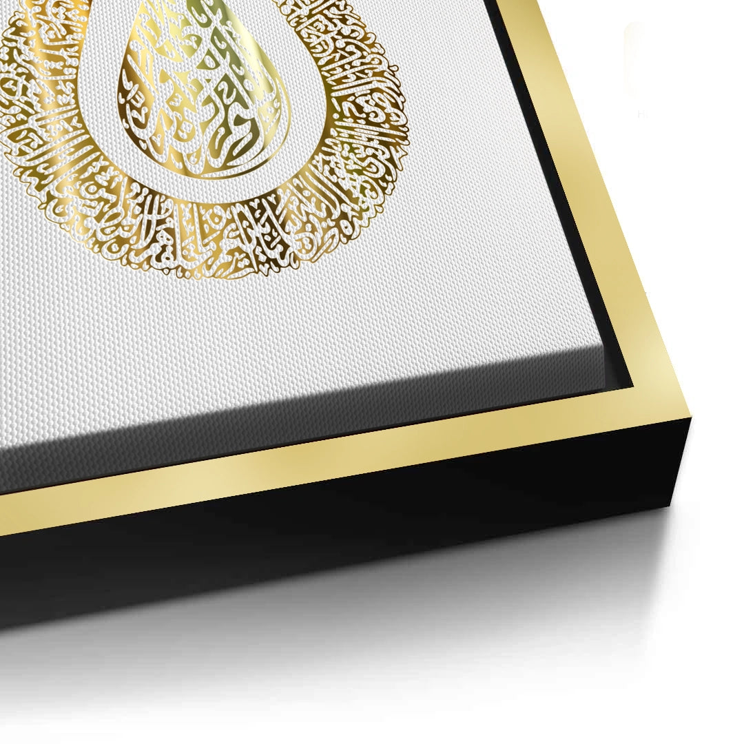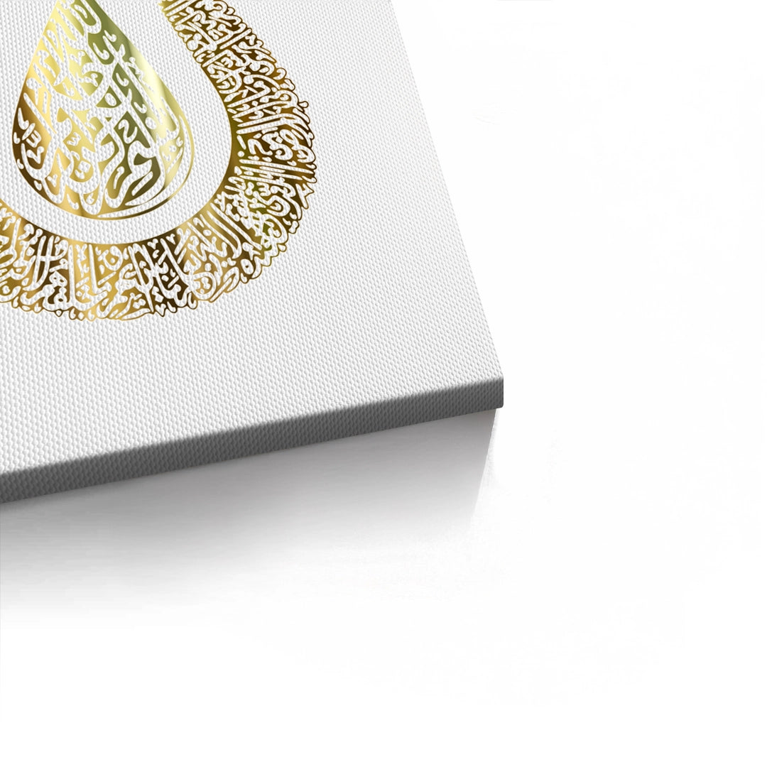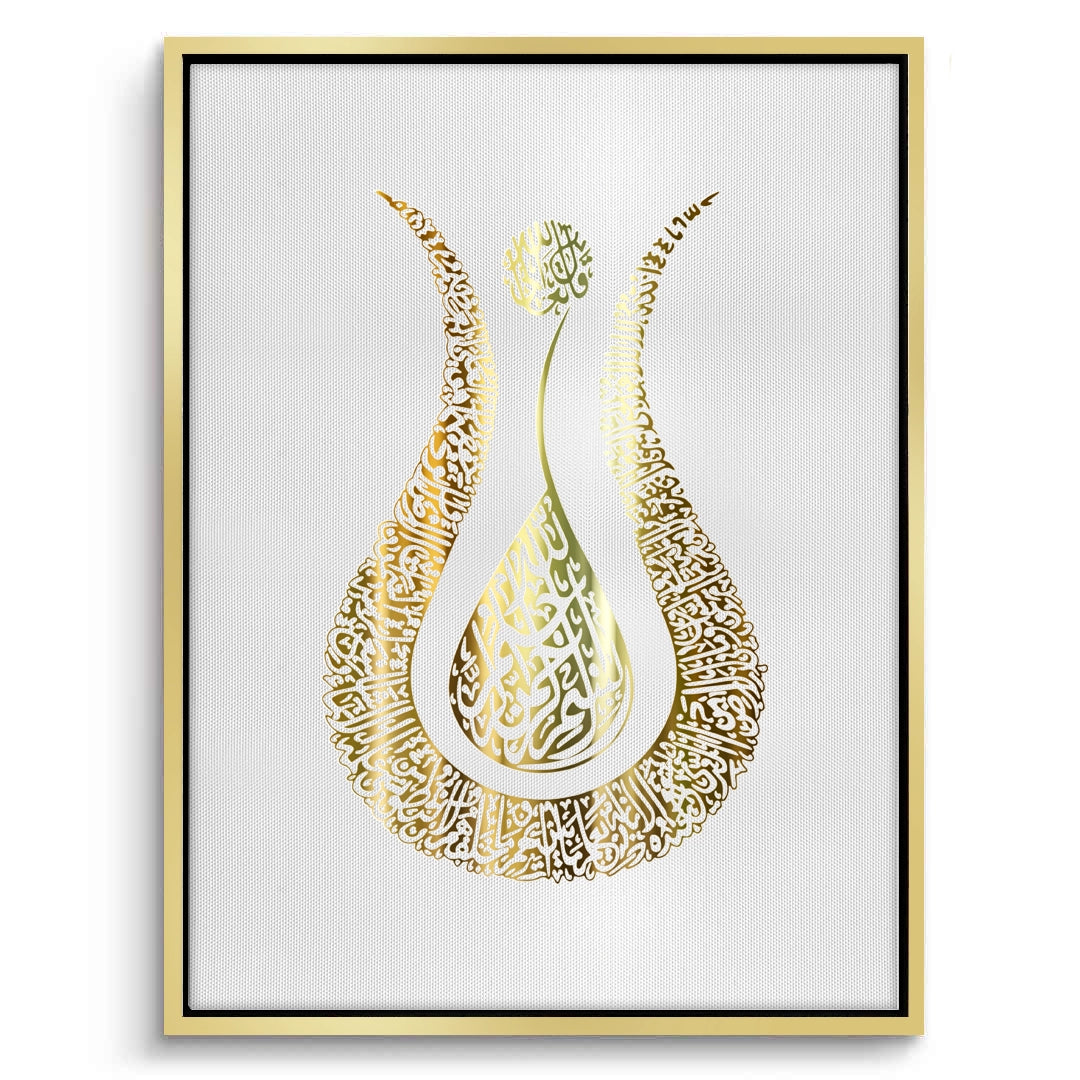 The exquisite Majestic Tulip - Gold Calligraphy of Divine Love print is a rich visual representation of spiritual beauty. The artwork is shaped into the elegant silhouette of the Tulip (Lale), a profound symbol of Divine Love (Muhabbat) and God's Oneness in Islamic tradition. The entire form is meticulously filled with dense, intricate metallic gold Arabic calligraphy, giving it a luminous, ornate texture. Set against a pure white, textured background, this piece is a sophisticated blend of symbolism and luxury. Ideal for adding an elegant, spiritual, and traditionally rich accent to a contemporary home in Dubai.