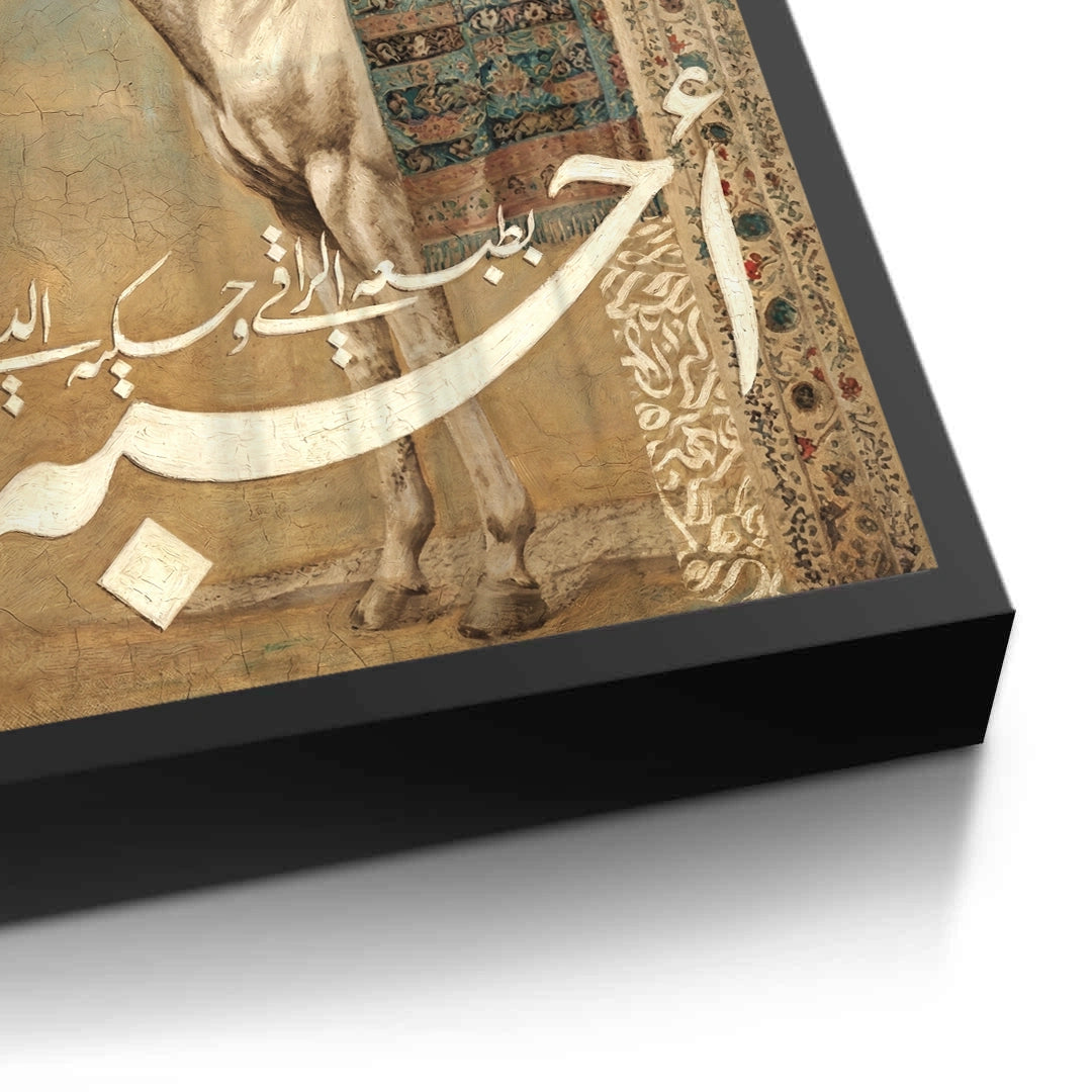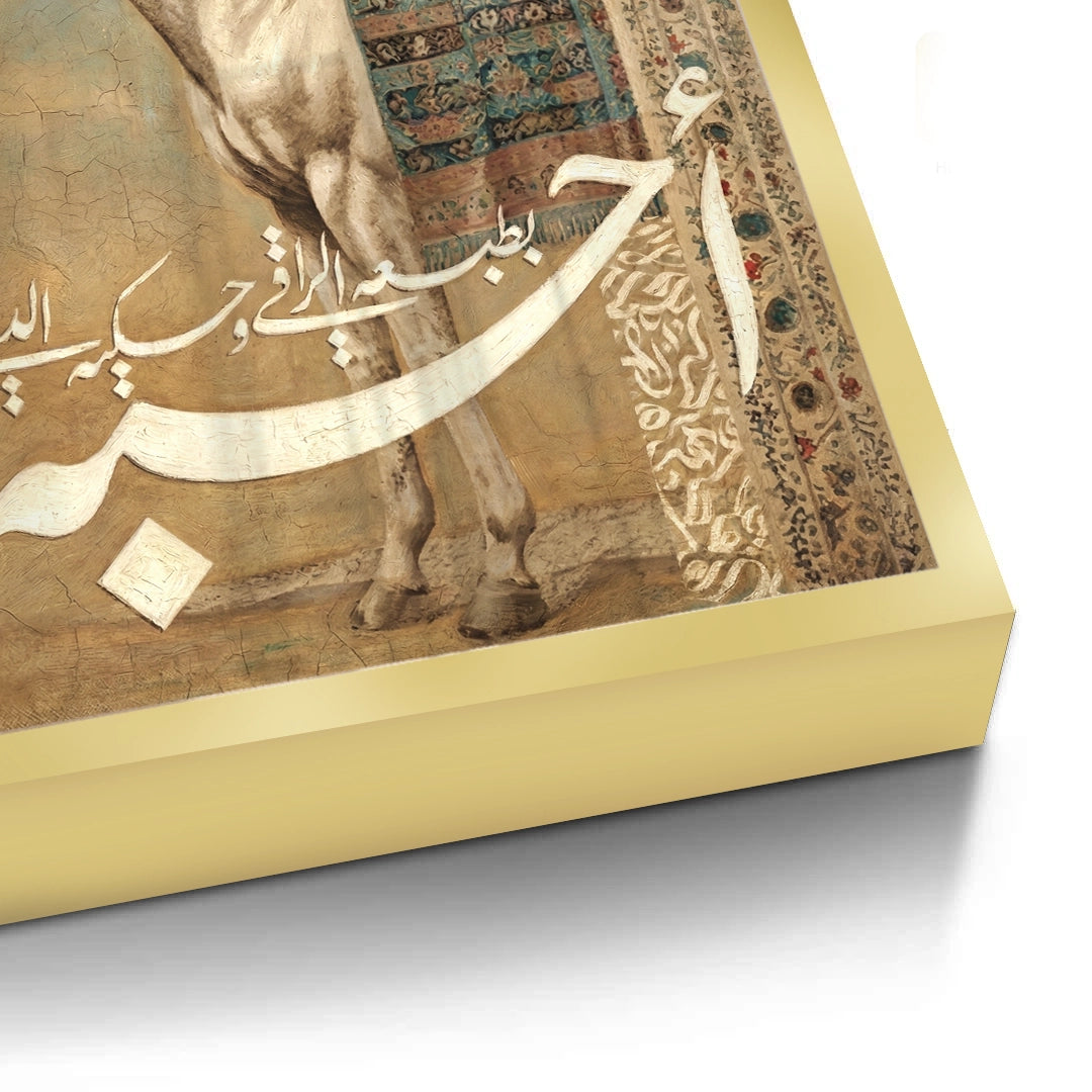The profound Noble One - Muhammad (ﷺ) Gold Calligraphy print is a striking tribute to the beloved Prophet (ﷺ). The piece features the name Muhammad (محمد) rendered in dense, powerful metallic gold Arabic script, occupying the central canvas in a fluid and majestic form. Above, the protective Bismillah Al-Rahman Al-Raheem completes the divine composition. Set against a deep, elegant black background, this artwork offers a powerful, spiritually enriching, and highly luxurious focal point. Ideal for contemplative spaces and upscale homes in Dubai.