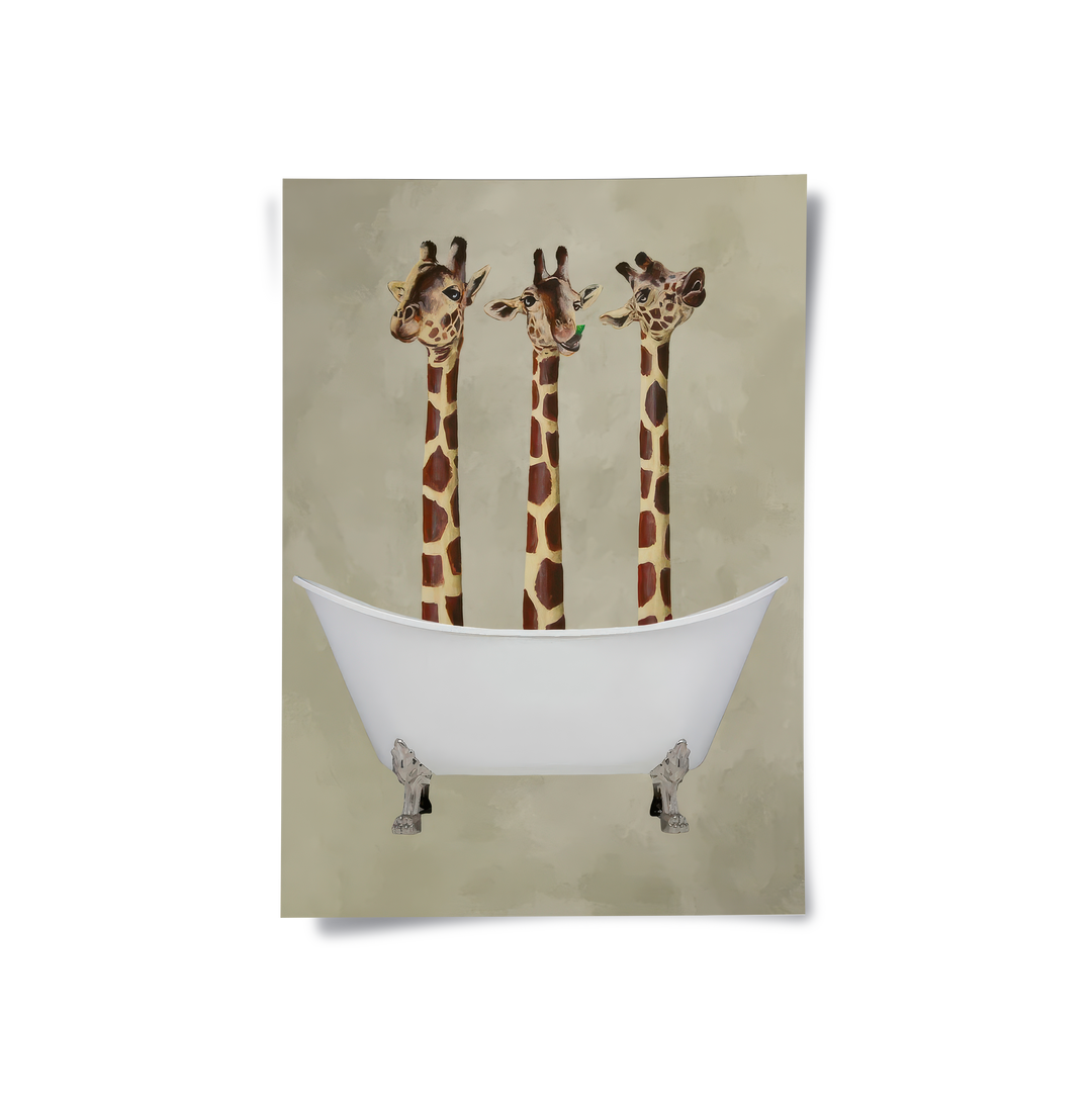 The delightfully quirky Three Giraffes Bathing print is guaranteed to bring a smile and a touch of fun to any child's room. This imaginative artwork features the hilarious scene of three friendly giraffes taking a communal bath in a vintage tub. The whimsical concept and charming animal portraits make this a standout piece. It is perfect for adding a playful, humorous, and memorable touch to a nursery, playroom, or bathroom décor in Dubai.