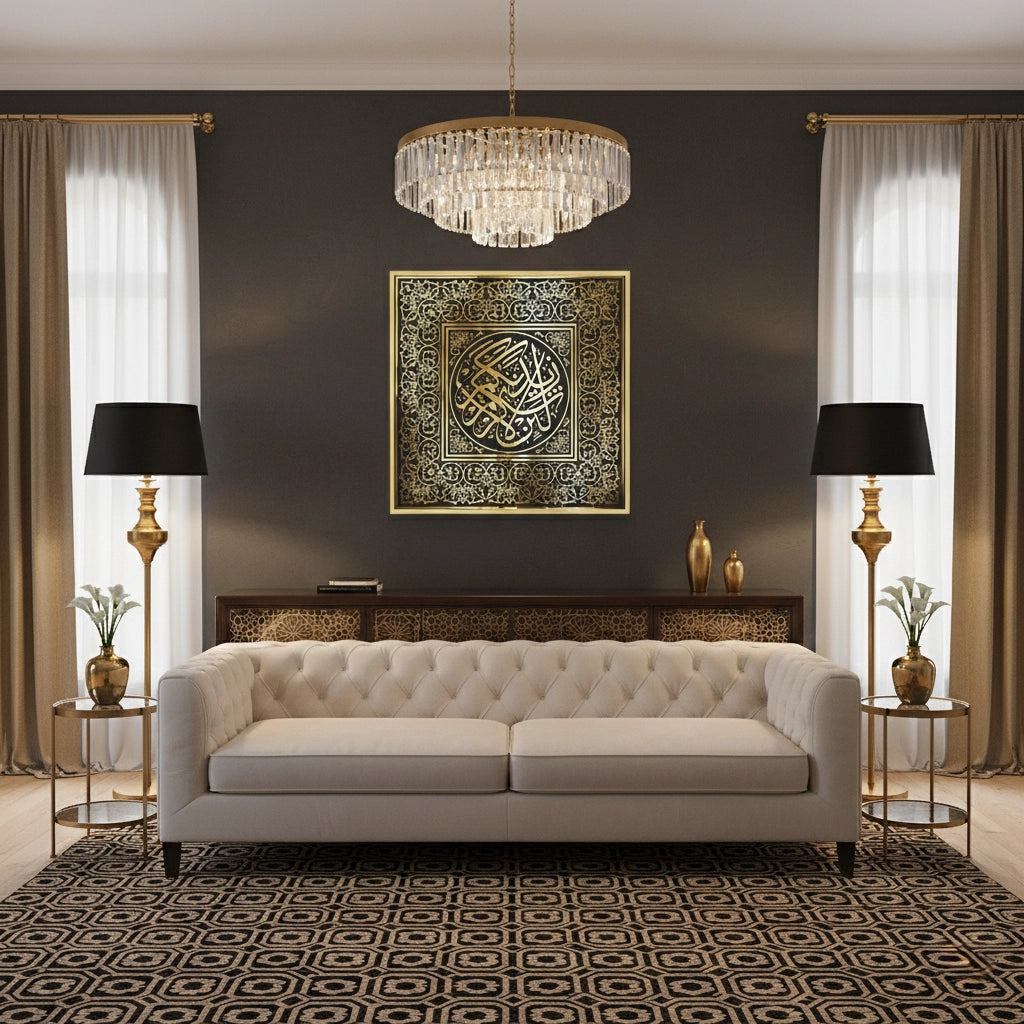 Elevate your space with the Imperial Thuluth from Jasmine Art’s Arabic Calligraphy collection. This masterful piece features an intricate Thuluth script medallion surrounded by a lavish golden Arabesque border. The shimmering metallic gold against a deep ebony backdrop evokes the grandeur of historic Islamic courts. Finished with our signature premium woven-canvas texture, this print offers exceptional tactile depth and a high-end gallery finish. A prestigious statement piece for a formal Majlis, a luxury hotel lobby, or a royal living room in Dubai.