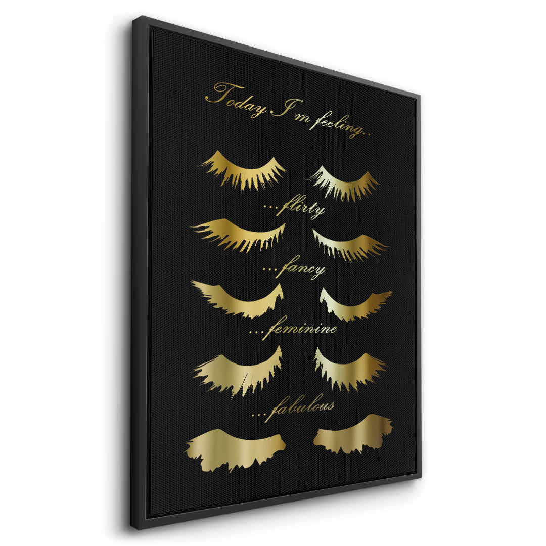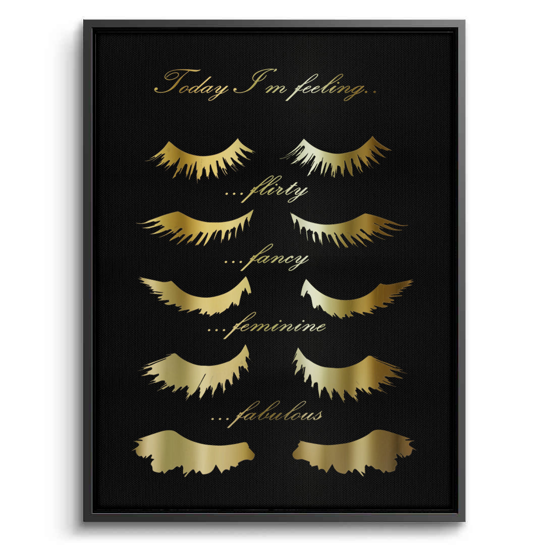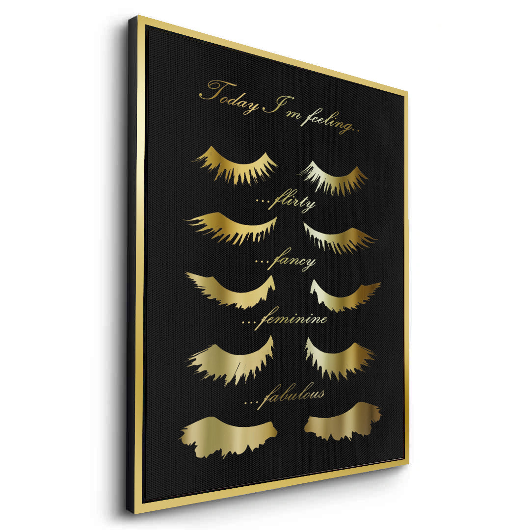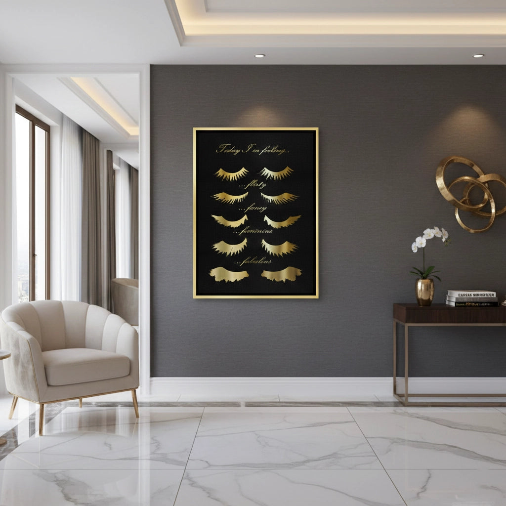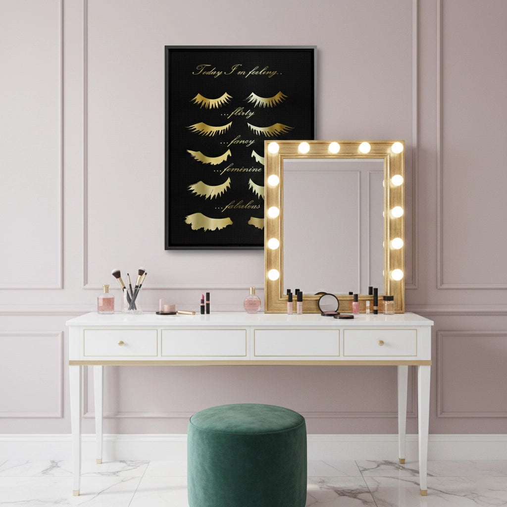 Celebrate your daily mood with the Today I'm Feeling typography art from Jasmine Art. This playful yet sophisticated piece features elegant golden script and stylized eyelash illustrations representing four fabulous moods: Flirty, Fancy, Feminine, and Fabulous. Set against a deep, textured black background, the metallic gold details create a stunning focal point for any beauty lover's space. Finished with our signature premium vertical texture, this print offers a luxurious tactile finish and gallery-quality depth. A perfect addition to a dressing room, vanity area, or a high-end beauty salon in Dubai.