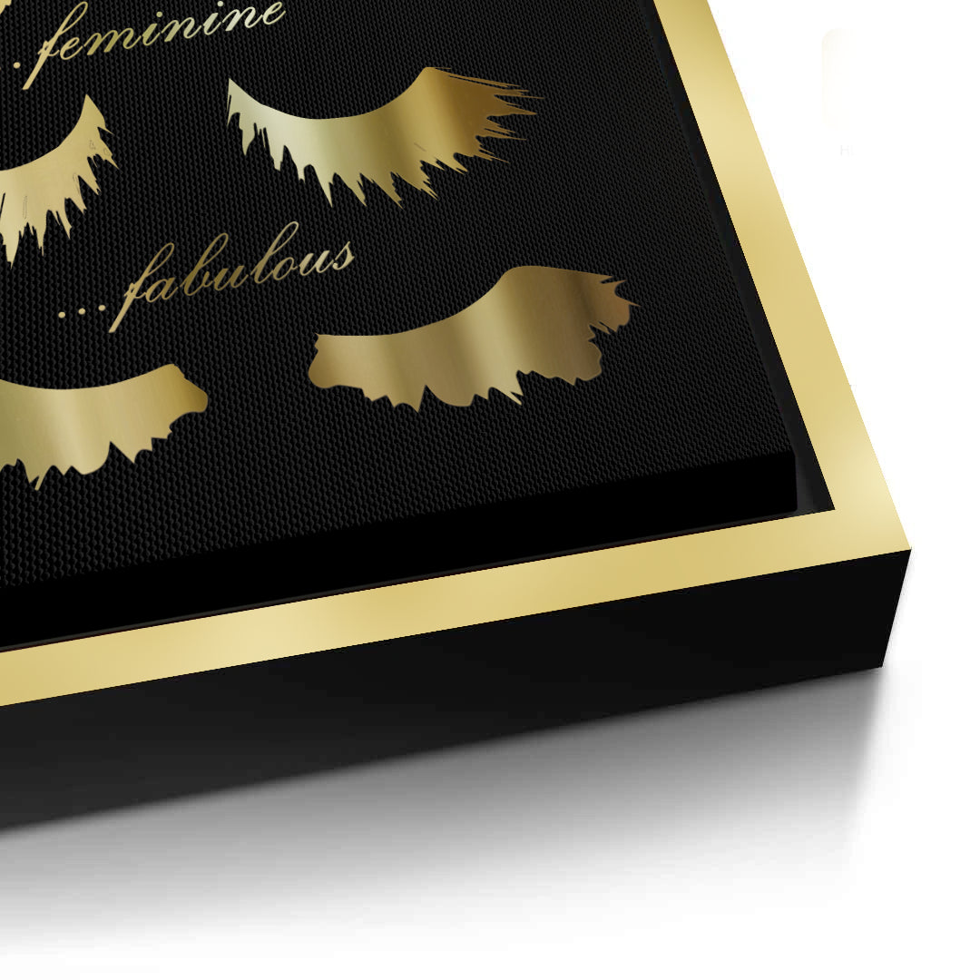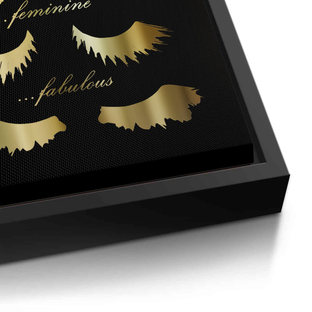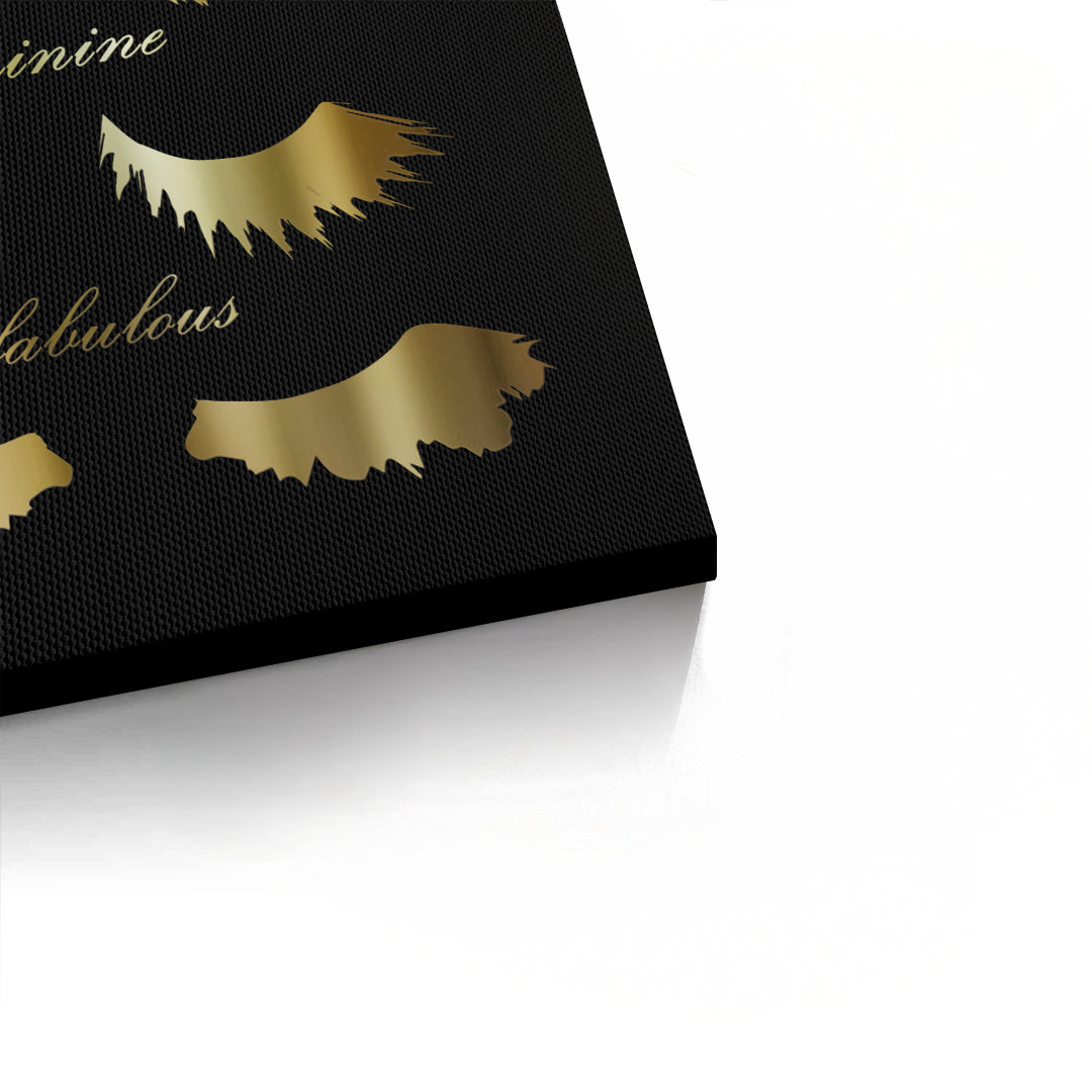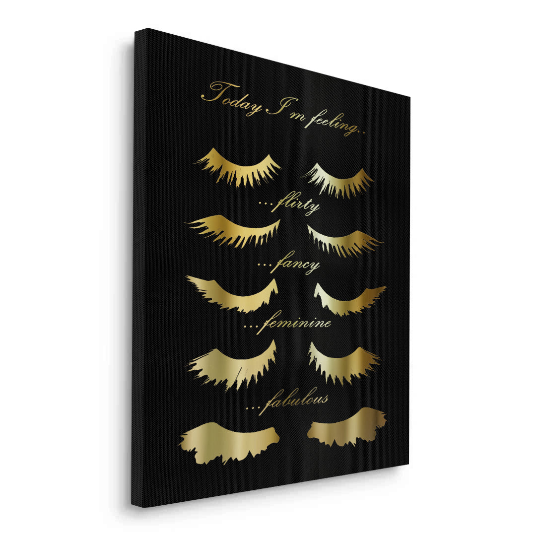 Celebrate your daily mood with the Today I'm Feeling typography art from Jasmine Art. This playful yet sophisticated piece features elegant golden script and stylized eyelash illustrations representing four fabulous moods: Flirty, Fancy, Feminine, and Fabulous. Set against a deep, textured black background, the metallic gold details create a stunning focal point for any beauty lover's space. Finished with our signature premium vertical texture, this print offers a luxurious tactile finish and gallery-quality depth. A perfect addition to a dressing room, vanity area, or a high-end beauty salon in Dubai.