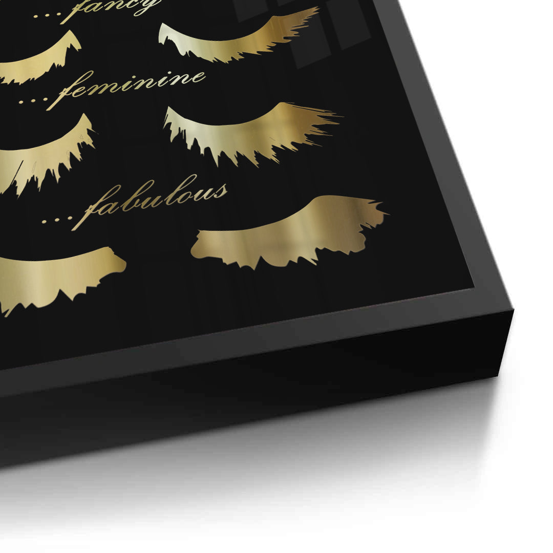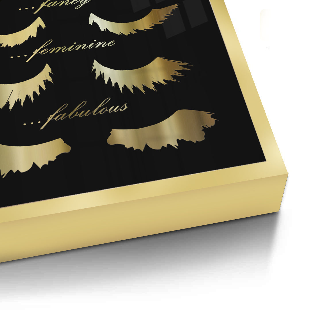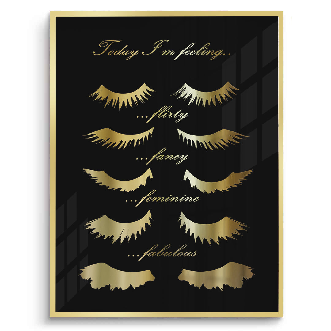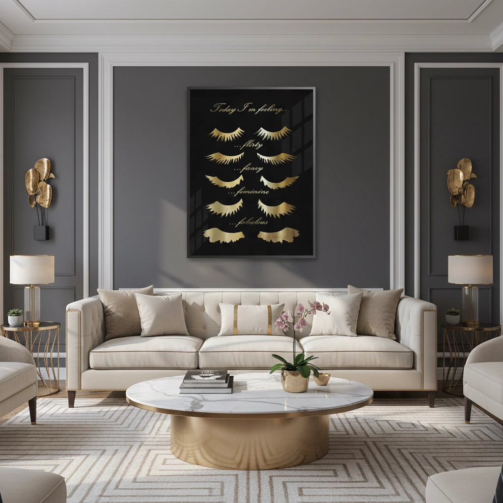 Celebrate your daily mood with the Today I'm Feeling typography art from Jasmine Art. This playful yet sophisticated piece features elegant golden script and stylized eyelash illustrations representing four fabulous moods: Flirty, Fancy, Feminine, and Fabulous. Set against a deep, textured black background, the metallic gold details create a stunning focal point for any beauty lover's space. Finished with our signature premium vertical texture, this print offers a luxurious tactile finish and gallery-quality depth. A perfect addition to a dressing room, vanity area, or a high-end beauty salon in Dubai.