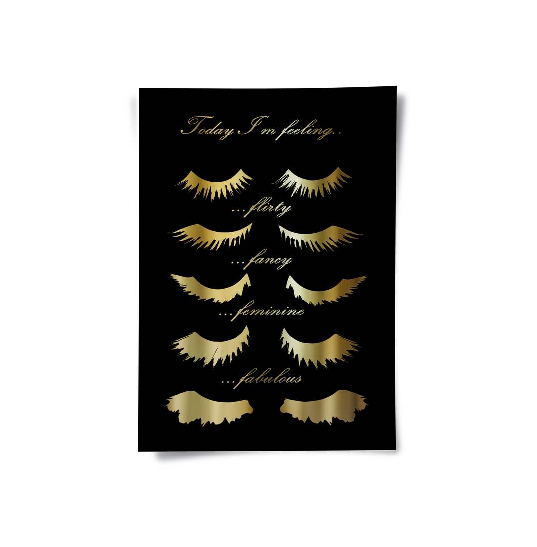 Celebrate your daily mood with the Today I'm Feeling typography art from Jasmine Art. This playful yet sophisticated piece features elegant golden script and stylized eyelash illustrations representing four fabulous moods: Flirty, Fancy, Feminine, and Fabulous. Set against a deep, textured black background, the metallic gold details create a stunning focal point for any beauty lover's space. Finished with our signature premium vertical texture, this print offers a luxurious tactile finish and gallery-quality depth. A perfect addition to a dressing room, vanity area, or a high-end beauty salon in Dubai.