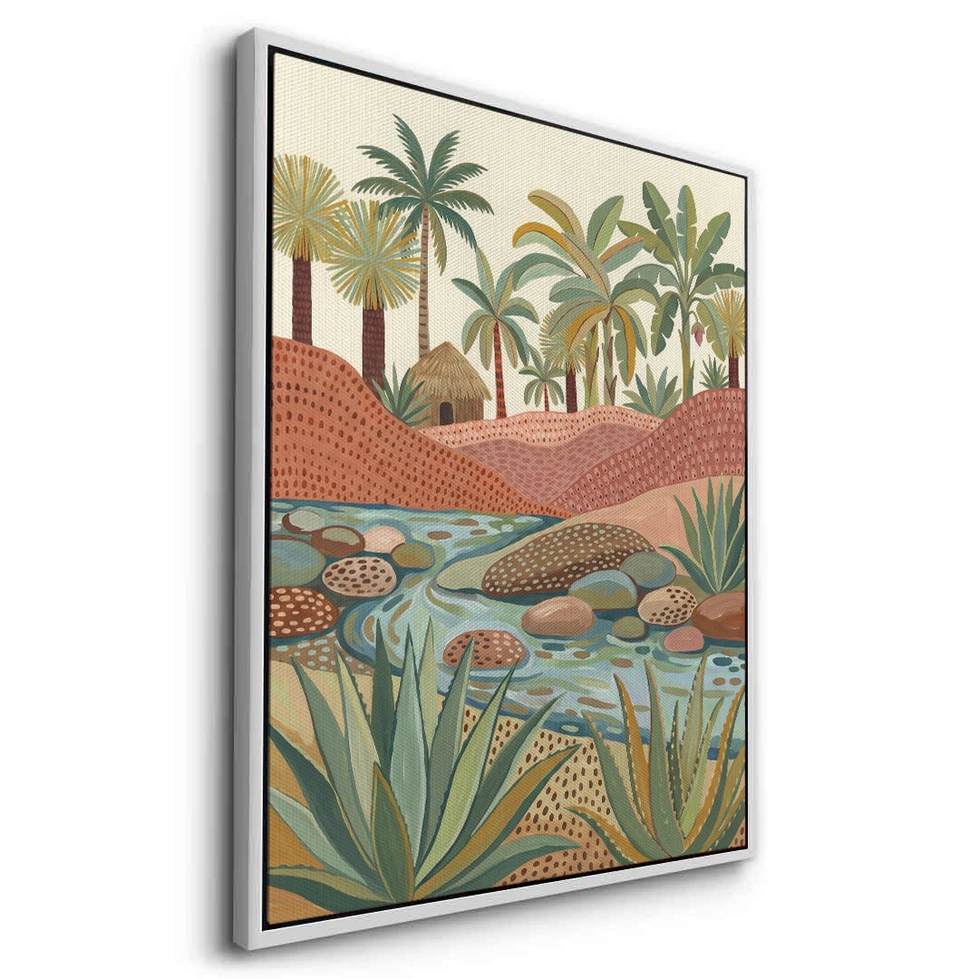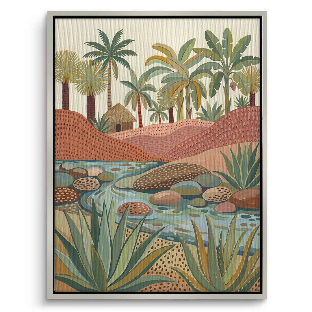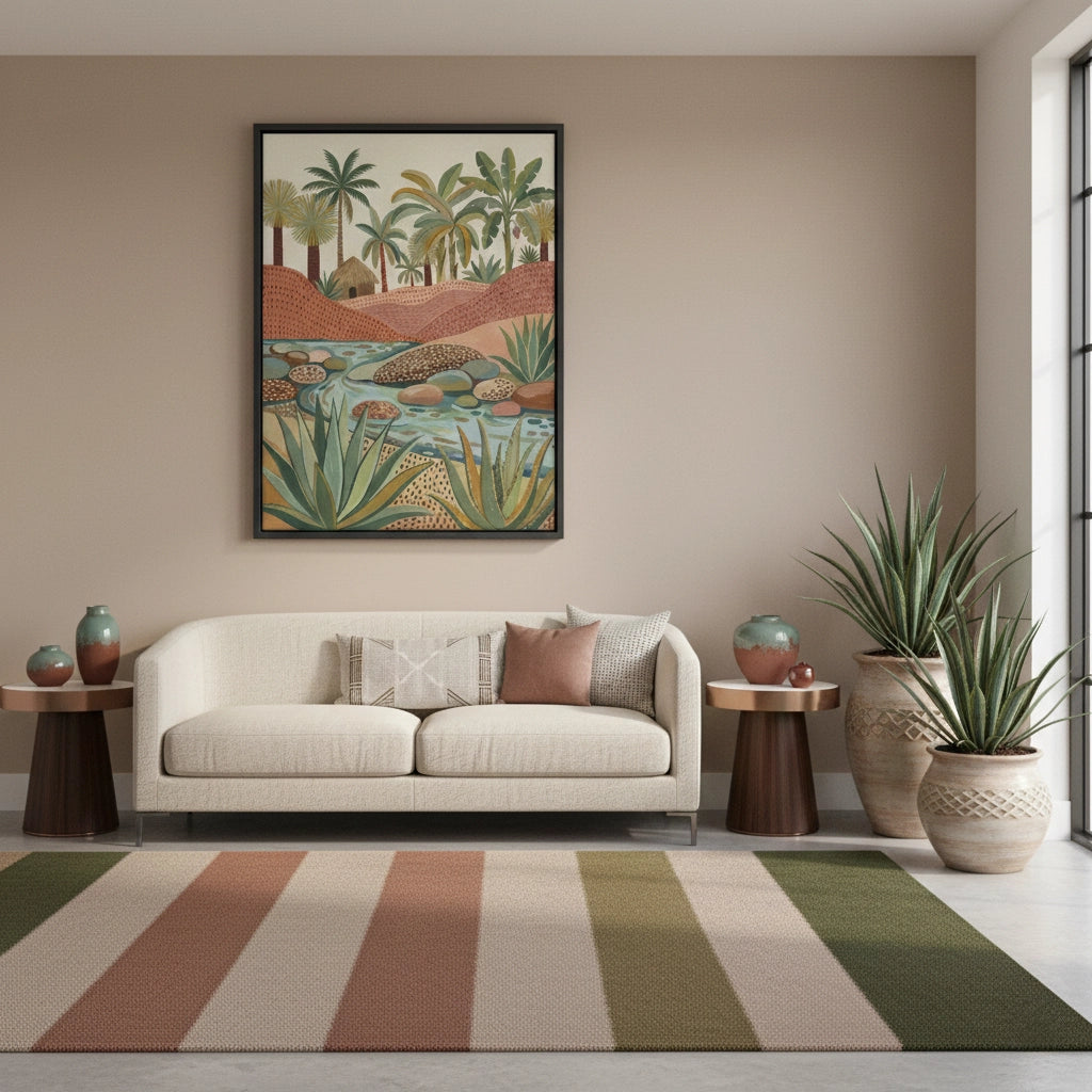 Escape to a serene paradise with the Tropical Botanicals from Jasmine Art’s Bohemian series. This intricately detailed illustration features a tranquil river winding through terracotta dunes, lush banana trees, and a charming rustic hut. The vibrant palette of sage green and warm earth tones brings the freshness of a tropical oasis to your walls. Finished with our signature premium vertical texture, this print offers exceptional tactile depth and a high-end gallery finish. A perfect artistic statement for a vibrant sunroom, a modern lounge, or a luxury villa in Dubai.
