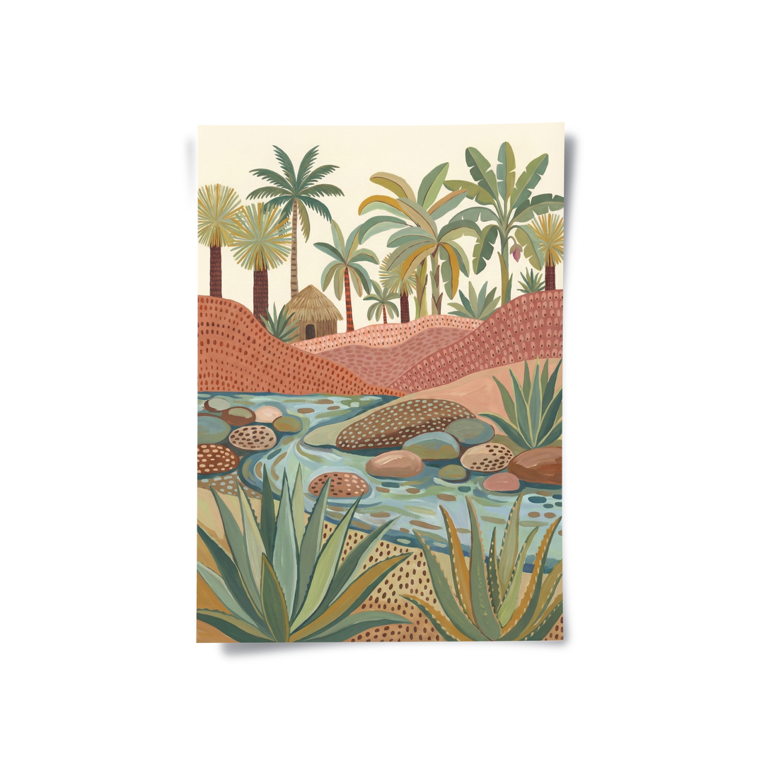 Escape to a serene paradise with the Tropical Botanicals from Jasmine Art’s Bohemian series. This intricately detailed illustration features a tranquil river winding through terracotta dunes, lush banana trees, and a charming rustic hut. The vibrant palette of sage green and warm earth tones brings the freshness of a tropical oasis to your walls. Finished with our signature premium vertical texture, this print offers exceptional tactile depth and a high-end gallery finish. A perfect artistic statement for a vibrant sunroom, a modern lounge, or a luxury villa in Dubai.