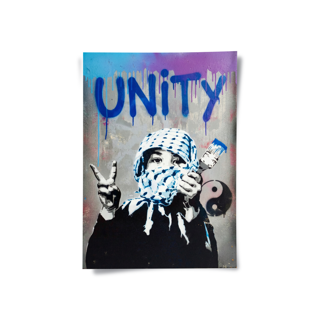 Embrace the spirit of harmony with the Unity & Peace Activist from Jasmine Art’s Banksy series. This powerful street-art piece features a young activist making a peace sign, set against a backdrop of dripping graffiti and universal symbols of balance. The striking contrast of vibrant blues and purples against a gritty urban texture makes it a soul-stirring focal point for any modern room. Finished with our signature premium vertical texture, this print offers exceptional tactile depth and a luxury gallery finish. An ideal statement piece for a contemporary lounge, a creative studio, or a home in Dubai that values meaningful art.