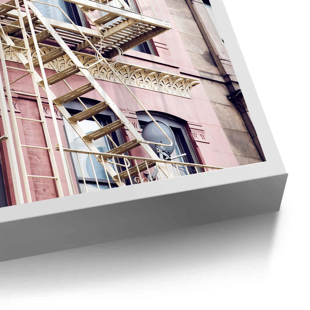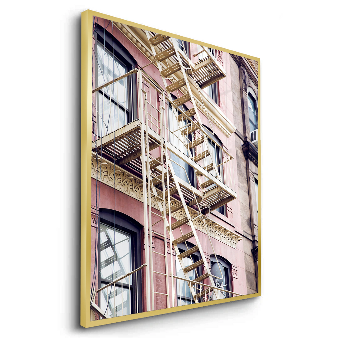 Embrace the rhythmic beauty of city life with the Urban Fire Escape art print. This captivating architectural photograph captures the iconic cream-colored metal fire escape set against a warm terracotta brick building. The intricate details of the vintage moldings and the dramatic angles of the iron stairs evoke a sense of urban nostalgia. Finished with our signature premium vertical texture, this print offers a high-end tactile finish that adds depth to the industrial composition. It is a perfect addition to a modern loft, a creative studio, or a contemporary apartment in Dubai.