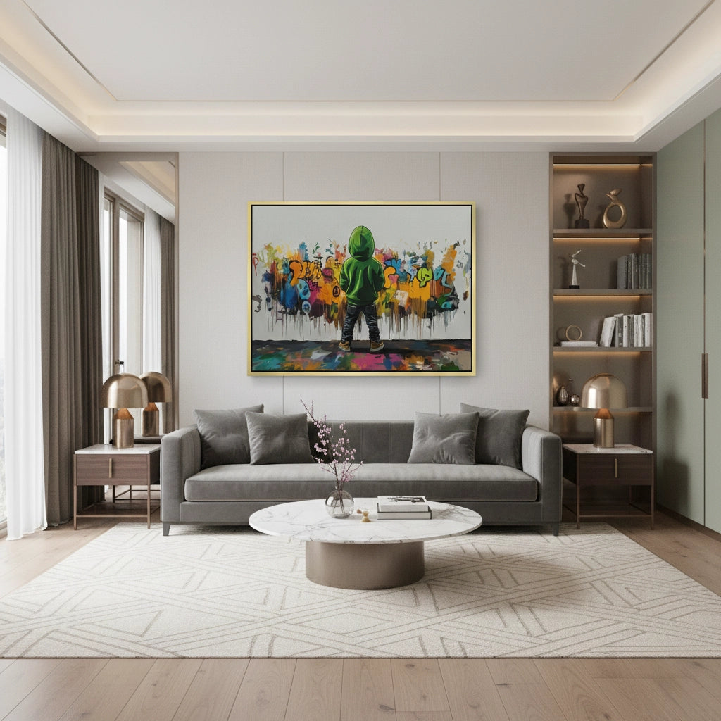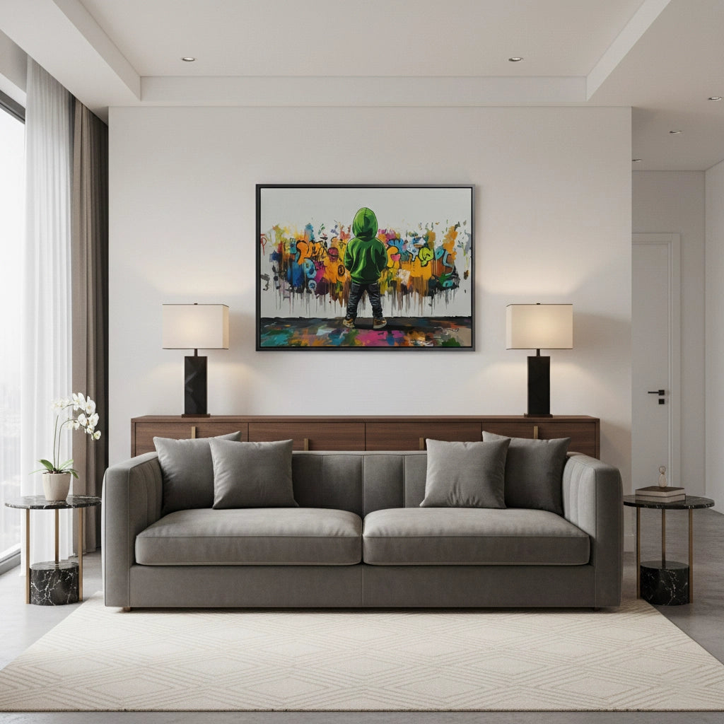 Infuse your space with the raw energy of the city with the Urban Graffiti Boy from Jasmine Art’s Banksy-inspired series. This dynamic piece features a young figure in a green hoodie standing before a vibrant explosion of street-style graffiti. The bold use of neon colors and dripping paint effects creates a high-impact visual statement. Finished with our signature premium vertical texture, this print elevates edgy urban culture into a luxury decorative masterpiece. A perfect bold addition for a teenager's room, a creative studio, or a contemporary loft in Dubai.