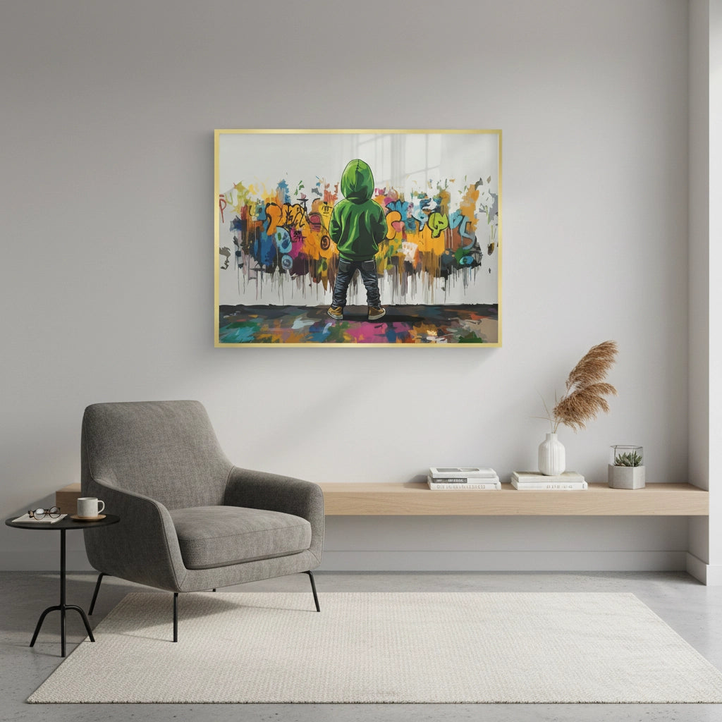 Infuse your space with the raw energy of the city with the Urban Graffiti Boy from Jasmine Art’s Banksy-inspired series. This dynamic piece features a young figure in a green hoodie standing before a vibrant explosion of street-style graffiti. The bold use of neon colors and dripping paint effects creates a high-impact visual statement. Finished with our signature premium vertical texture, this print elevates edgy urban culture into a luxury decorative masterpiece. A perfect bold addition for a teenager's room, a creative studio, or a contemporary loft in Dubai.
