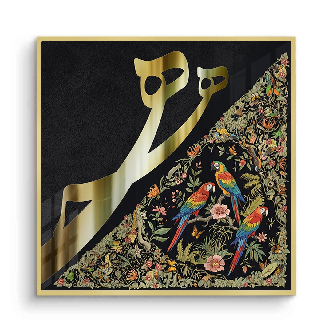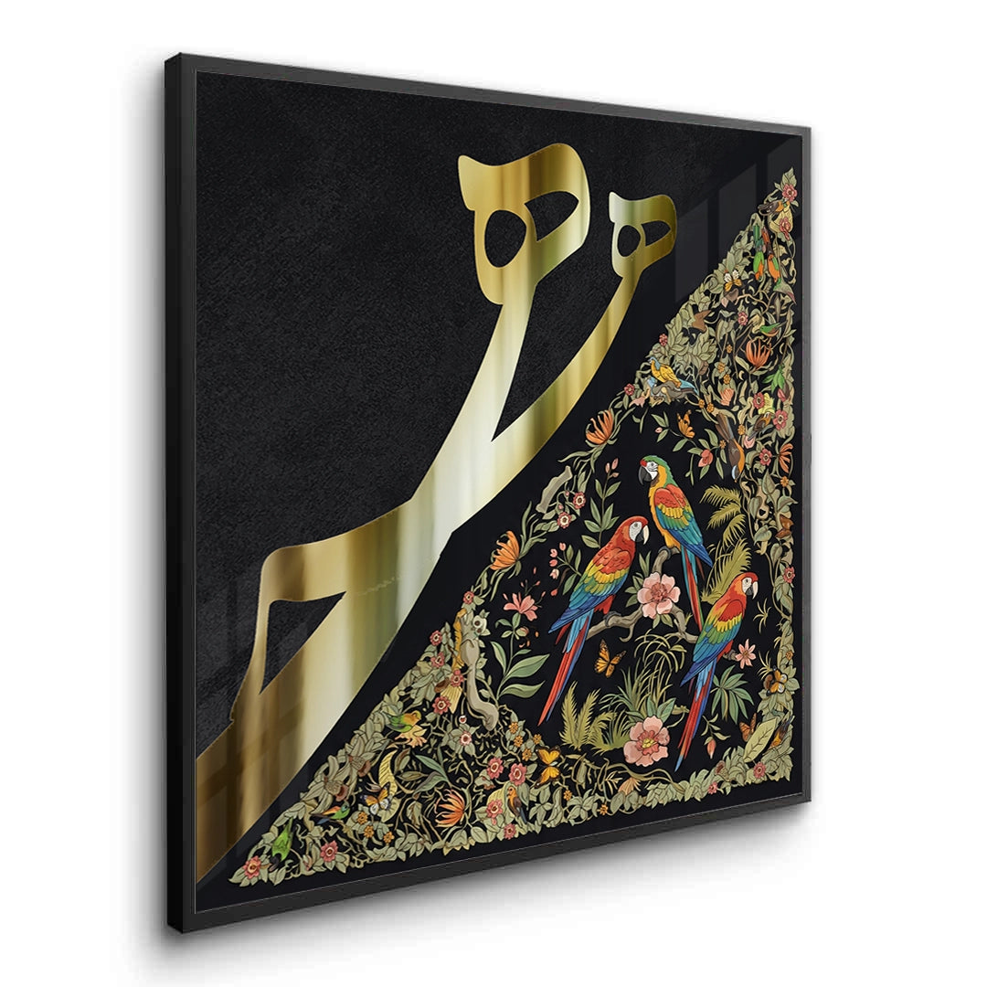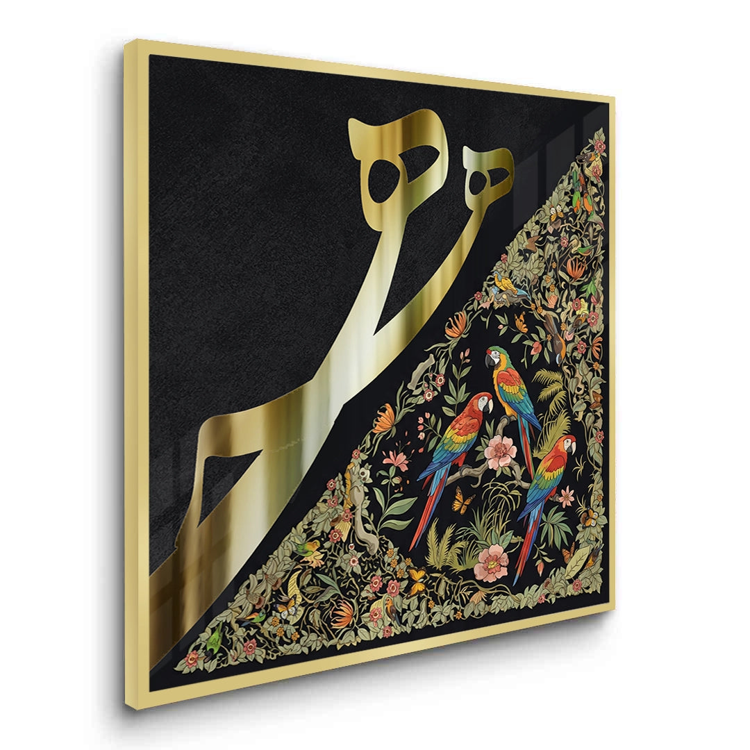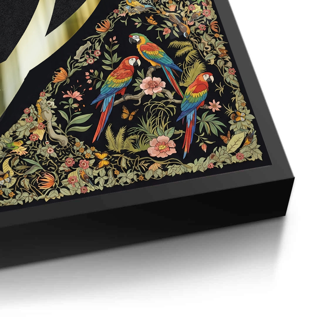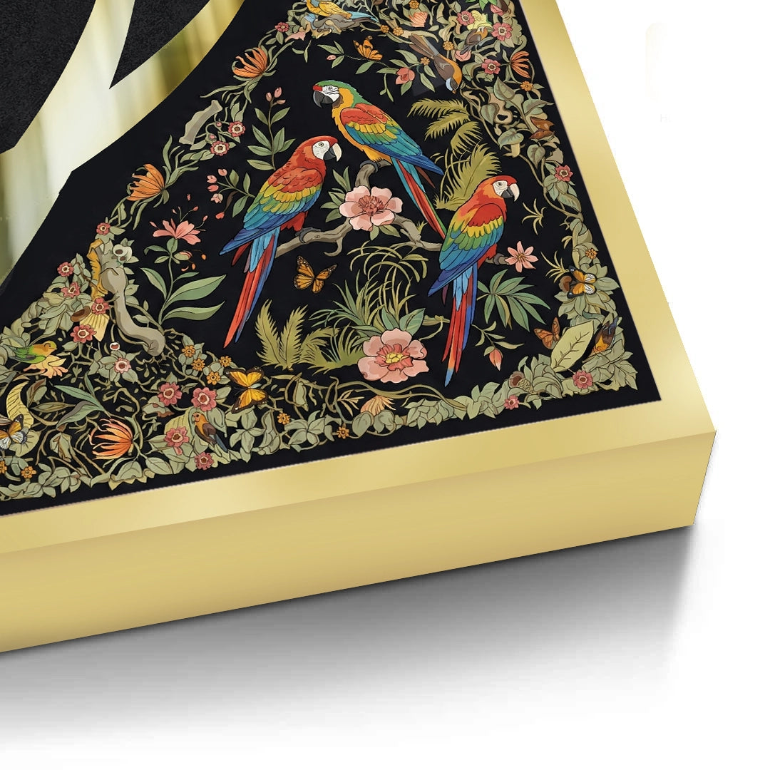 The opulent Vibrant Birds - Mughal Gold Split print is a striking fusion of geometric calligraphy and vibrant natural art. The canvas is dramatically divided: the left side showcases bold, metallic gold Arabic script against a deep black texture, while the right side bursts with a detailed, colourful Mughal-style jungle scene. The intricate section features vibrant macaws and lush floral patterns. This eclectic piece is perfect for adding a luxurious, artistic, and culturally rich statement to a modern majlis or drawing-room in Dubai.