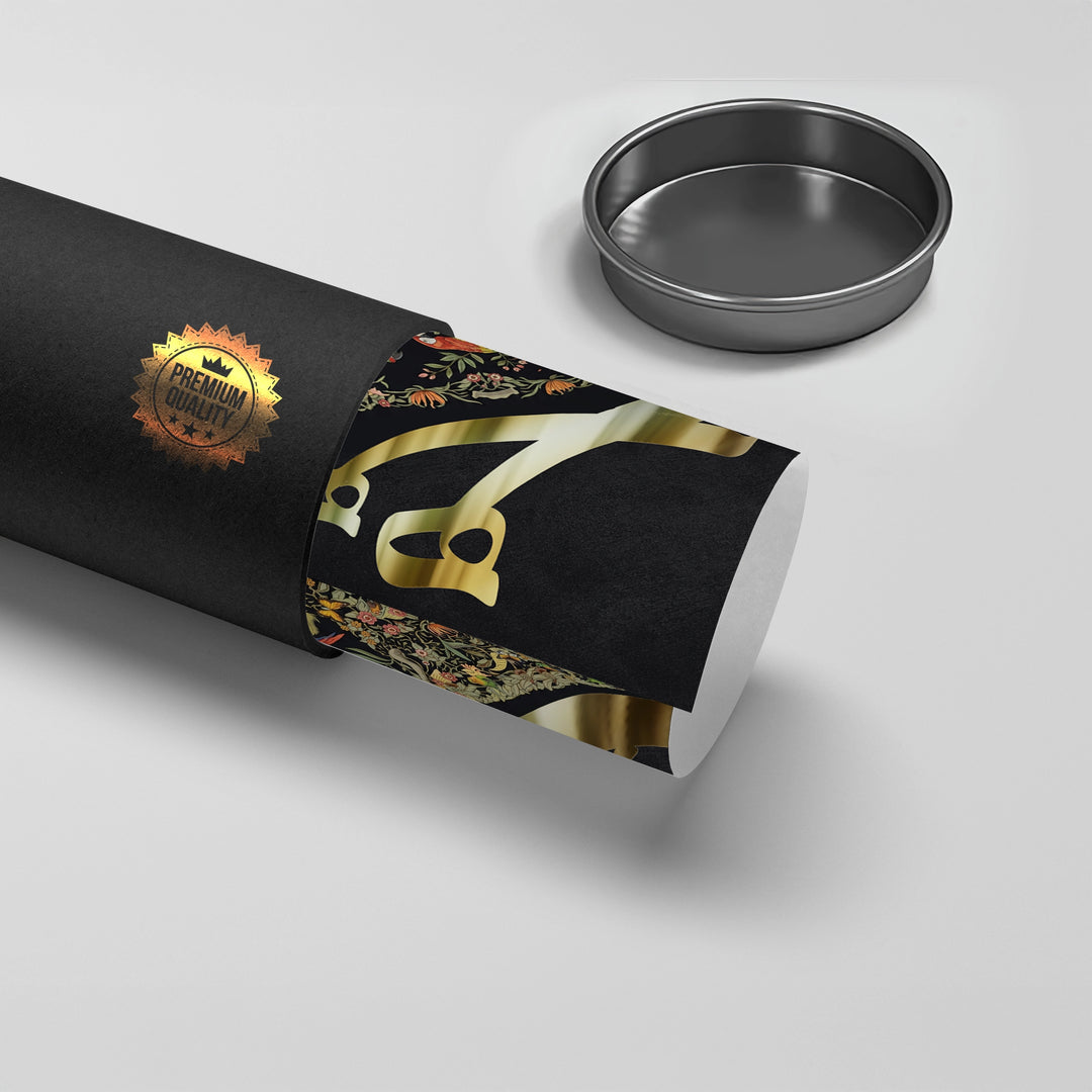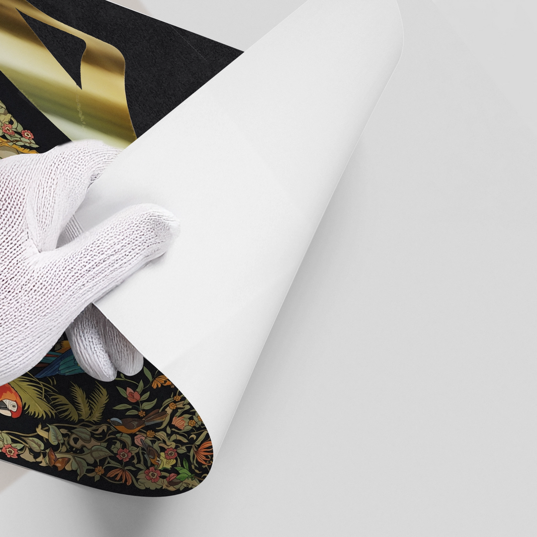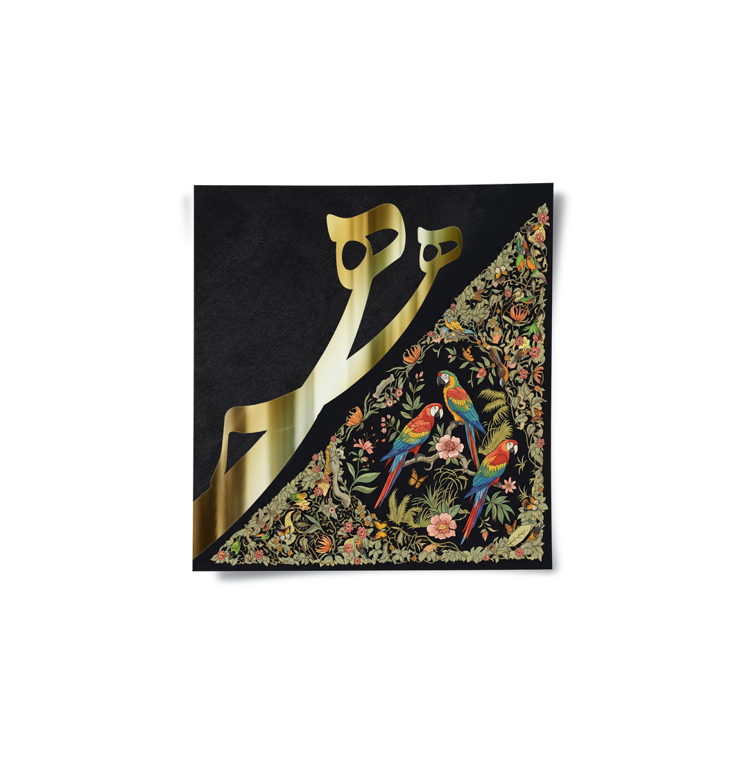 The opulent Vibrant Birds - Mughal Gold Split print is a striking fusion of geometric calligraphy and vibrant natural art. The canvas is dramatically divided: the left side showcases bold, metallic gold Arabic script against a deep black texture, while the right side bursts with a detailed, colourful Mughal-style jungle scene. The intricate section features vibrant macaws and lush floral patterns. This eclectic piece is perfect for adding a luxurious, artistic, and culturally rich statement to a modern majlis or drawing-room in Dubai.