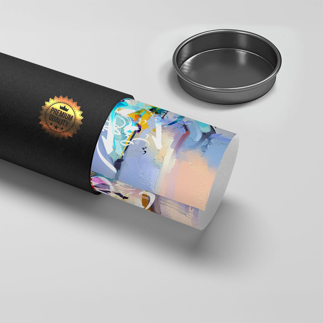 The explosive Vibrant Expression - Abstract Calligraphy print is a powerful, contemporary masterpiece that embodies artistic energy. This piece features dynamic, abstract brushwork in a rich palette of soft blues, lavender, and warm orange accents. Overlaid on this expressive background is flowing, stylized Arabic script in white and teal, merging cultural heritage with abstract expressionism. Ideal for adding a bold, artistic, and visually captivating focal point to a modern living room or creative space in Dubai.