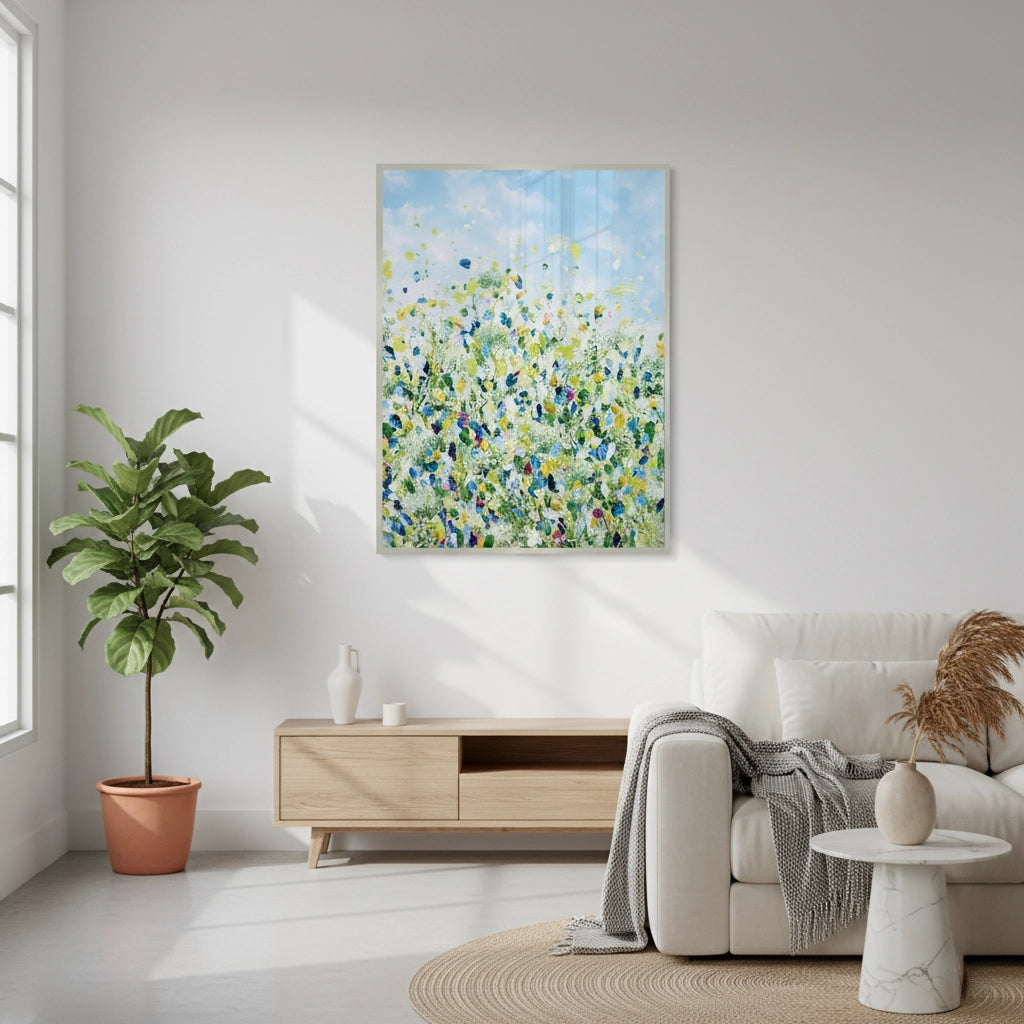 The joyous Vibrant Impressionist print captures the energetic beauty of a sunlit wildflower field. This canvas features a rich tapestry of colors, using thick, dynamic brushstrokes in shades of bright yellow, vivid blue, and fresh green. This modern interpretation of Impressionism instantly brightens any room, bringing the texture and vitality of an outdoor scene indoors. It is an uplifting, colorful piece perfect for adding artistic flair and summer energy to a living space or gallery wall in Dubai.