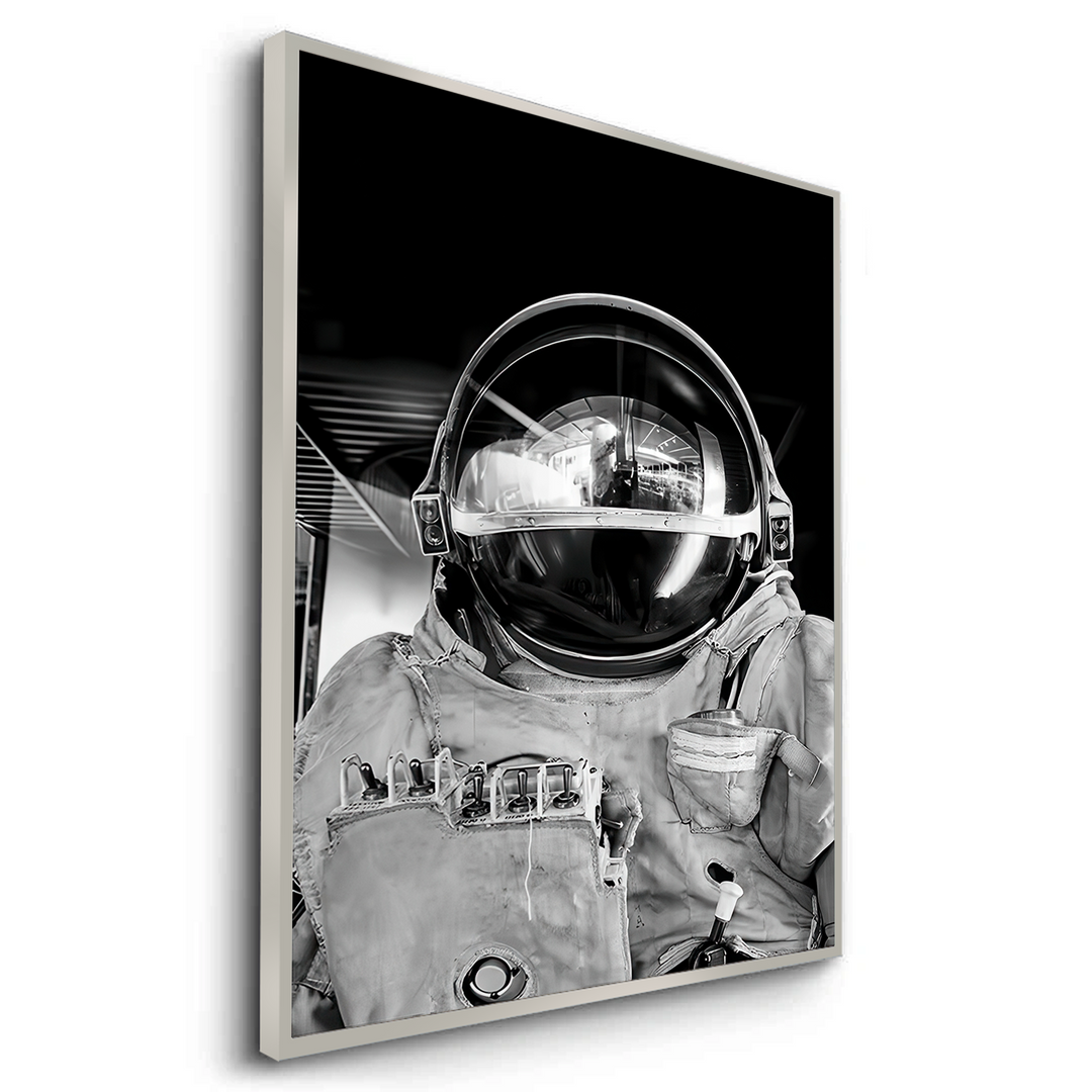 The powerful Vintage Astronaut print is a striking and inspiring piece for any future space explorer's room. This monochrome photograph captures the dramatic close-up of an astronaut, with the helmet visor reflecting the world around them. The timeless black and white aesthetic and realistic detail provide a sophisticated yet exciting focal point. It is perfect for adding a bold, educational, and motivational Sci-Fi touch to a modern playroom or bedroom in Dubai.