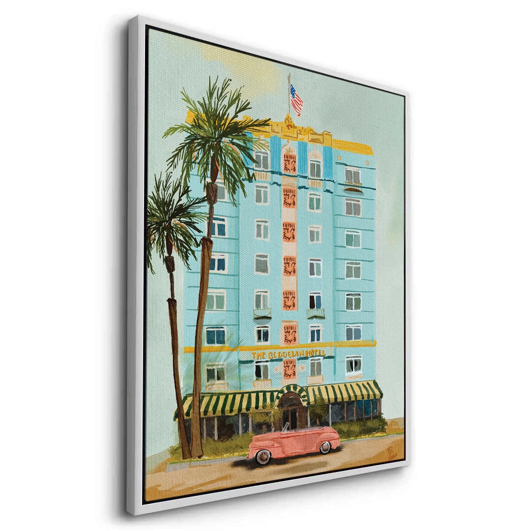 Channel the vibrant energy of Ocean Drive with the Vintage Miami Beach art print. This playful yet sophisticated illustration celebrates the iconic Art Deco architecture of Miami, featuring a majestic teal-blue hotel adorned with pastel accents. The scene is completed with a classic pink vintage car and tropical palm trees, evoking the glamorous retro summer vibes of Florida. Finished with our signature vertical pinstripe texture, this hand-painted style artwork adds a pop of color and artistic flair to any space. It is a fantastic choice for a modern living room, a creative studio, or a vibrant coastal interior in Dubai.