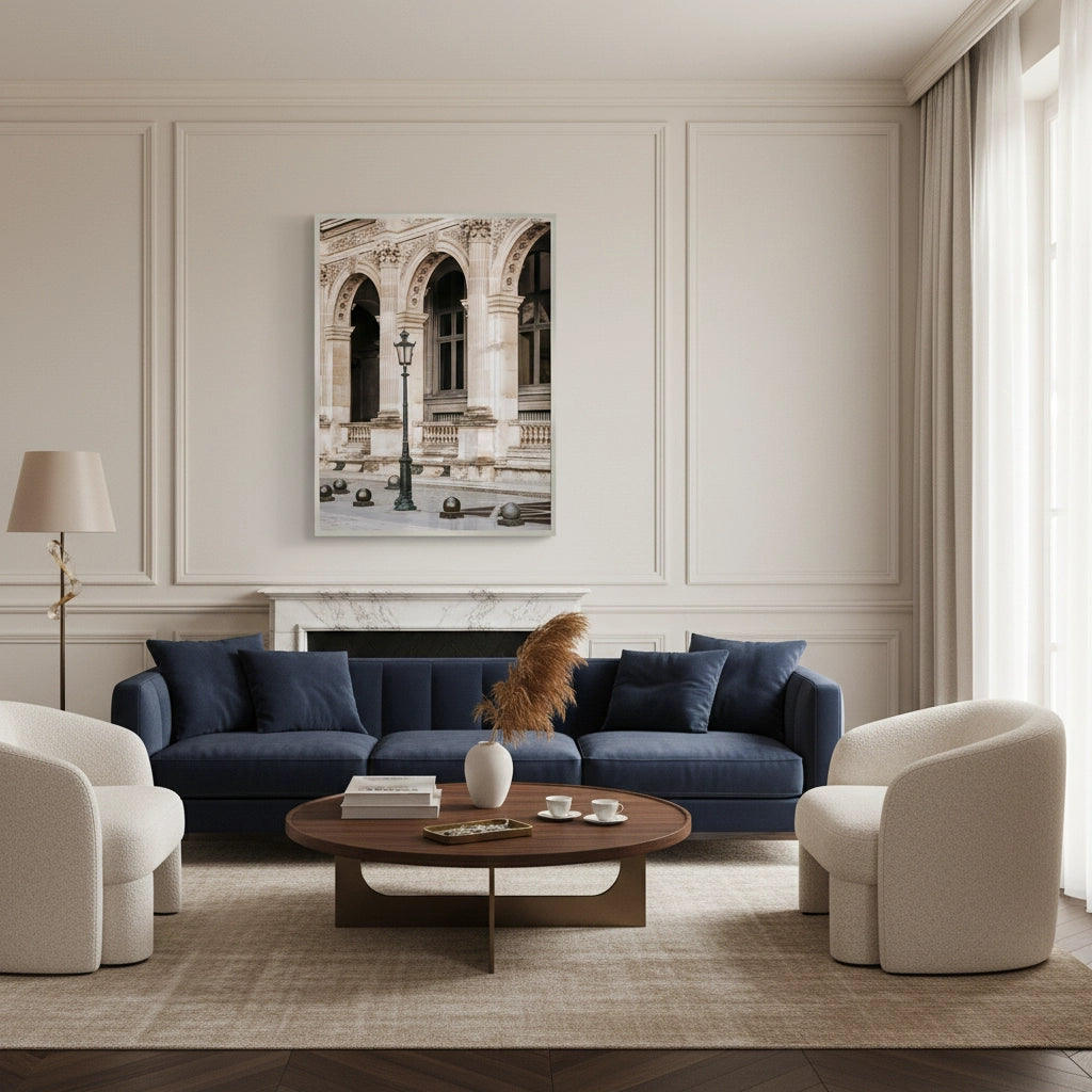 Transport your space to the streets of Europe with the Vintage Parisian - Classic European Architecture Art print. This elegant piece captures the timeless beauty of a Parisian facade, featuring grand stone arches, ornate Corinthian columns, and a vintage wrought-iron street lamp. Rendered in a warm palette of beige, cream, and sand tones, the artwork features a subtle textured finish that enhances its nostalgic, fine-art appeal. This sophisticated print brings a sense of romance, history, and architectural grandeur to any interior. It is an ideal addition for creating a chic, classic, and globally inspired atmosphere in a bedroom, study, or living area in Dubai.