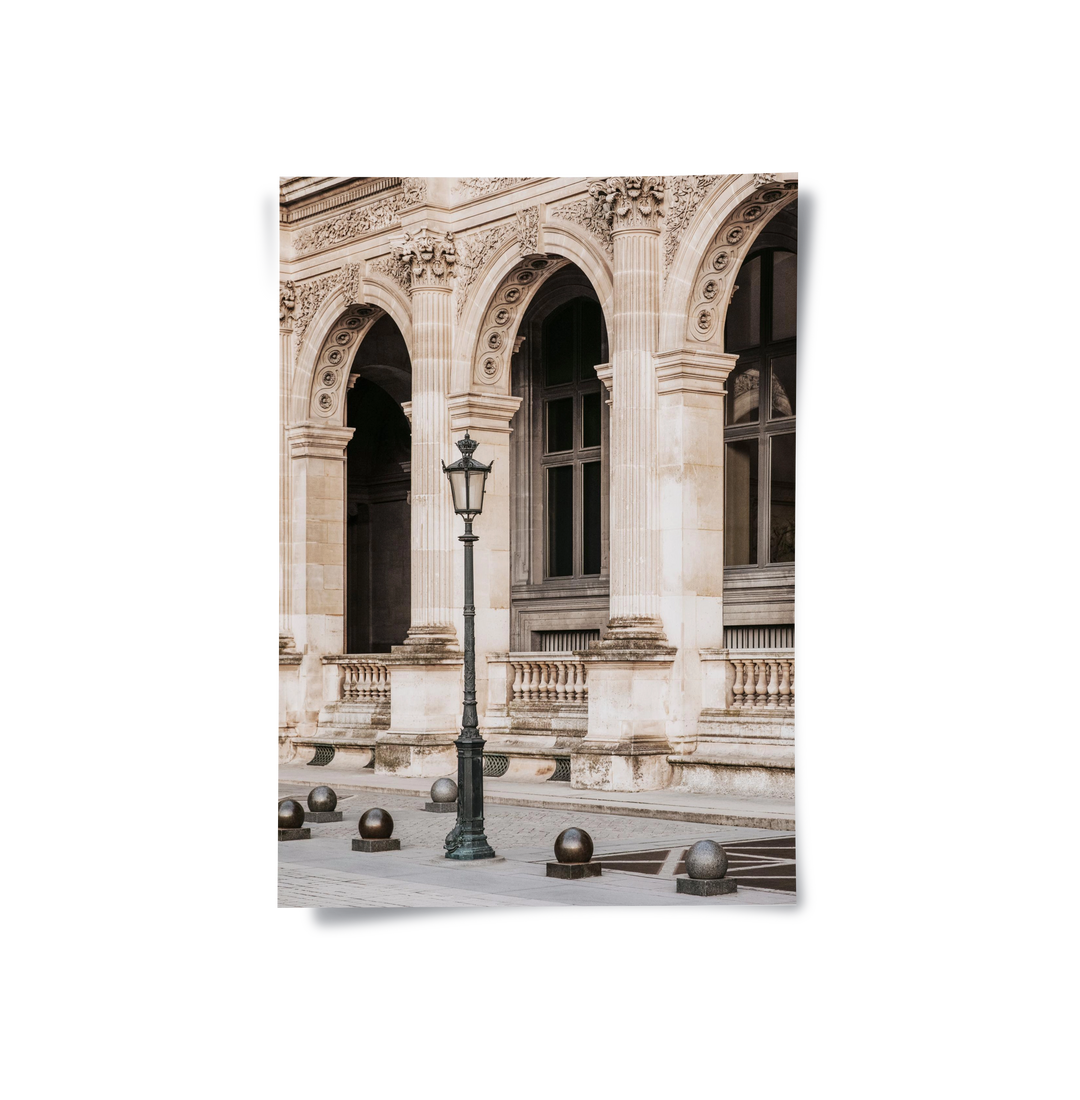 Transport your space to the streets of Europe with the Vintage Parisian - Classic European Architecture Art print. This elegant piece captures the timeless beauty of a Parisian facade, featuring grand stone arches, ornate Corinthian columns, and a vintage wrought-iron street lamp. Rendered in a warm palette of beige, cream, and sand tones, the artwork features a subtle textured finish that enhances its nostalgic, fine-art appeal. This sophisticated print brings a sense of romance, history, and architectural grandeur to any interior. It is an ideal addition for creating a chic, classic, and globally inspired atmosphere in a bedroom, study, or living area in Dubai.