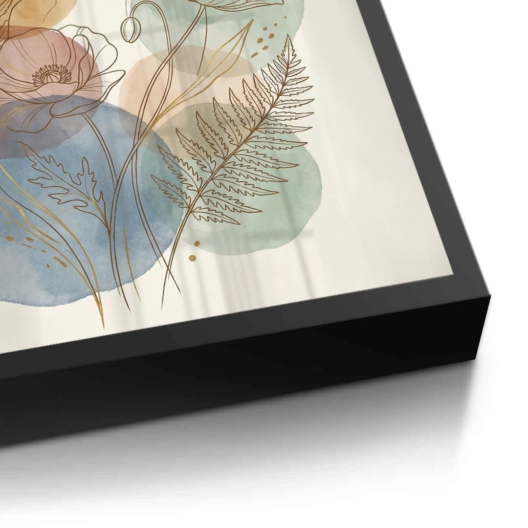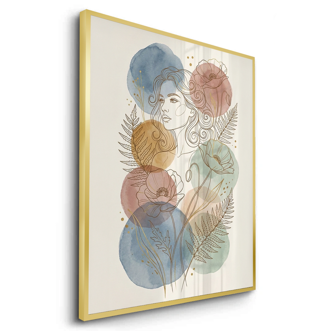 Elevate your interior with the ethereal beauty of Floral Muse from Jasmine Art’s Bohemian series. This stunning print features a delicate female portrait layered with soft watercolor shapes and intricate gold-line botanical sketches. The muted palette of rose, blue, and sage brings a poetic and tranquil energy to any contemporary space. Finished with our signature premium vertical texture, this print provides exceptional tactile depth and a high-end gallery finish. A perfect artistic centerpiece for a luxury bedroom, a chic lounge, or a modern studio in Dubai.