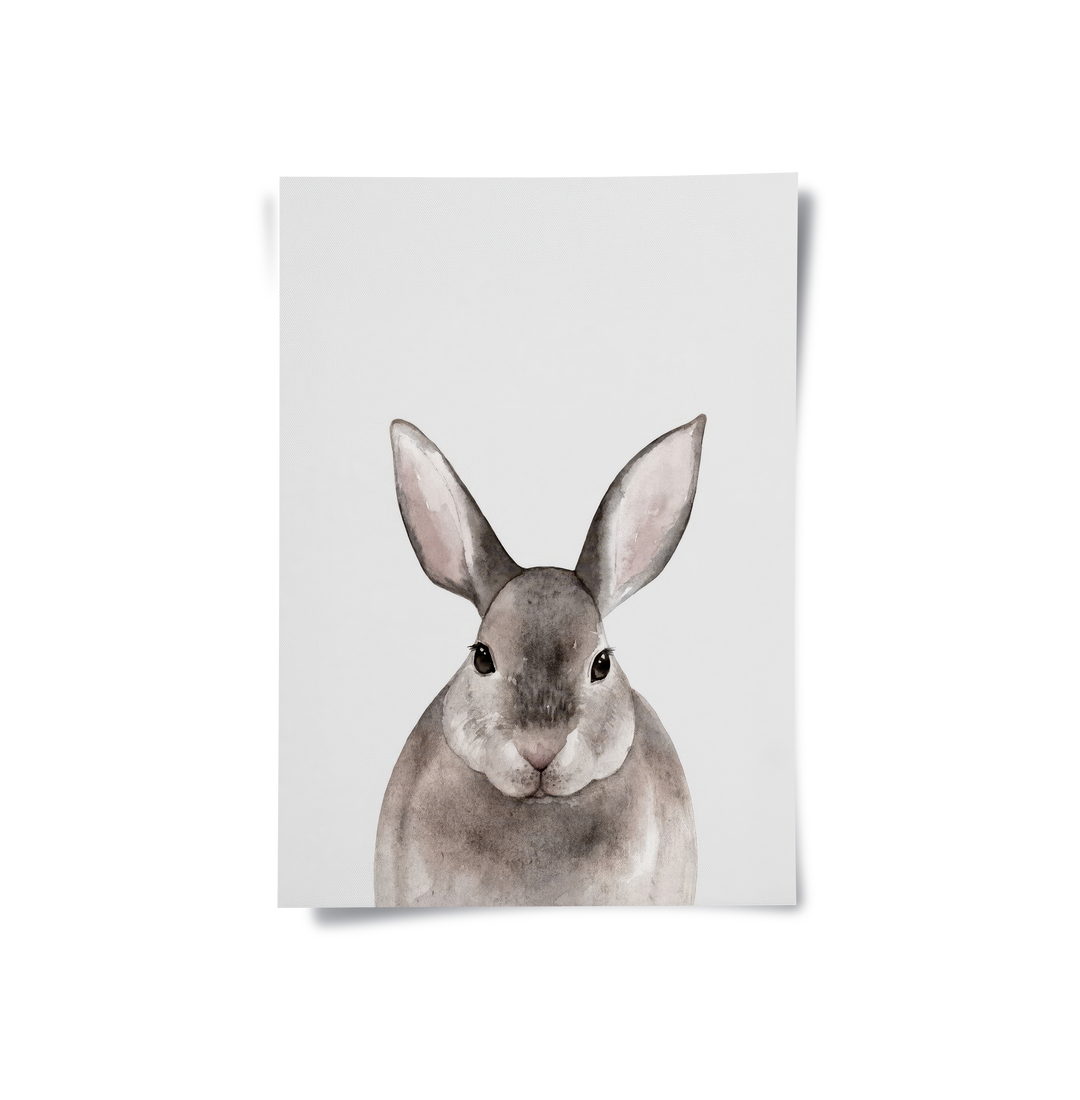 The gentle Watercolor Rabbit print is an enchanting portrait perfect for calming and charming any nursery or child’s room. This piece features a fluffy rabbit rendered in soft, muted grey and brown watercolor washes. The rabbit's soulful expression and tall ears give it an instantly lovable personality. The neutral palette ensures it blends seamlessly with any decor, adding a sweet, classic, and comforting animal touch to a home in Dubai.