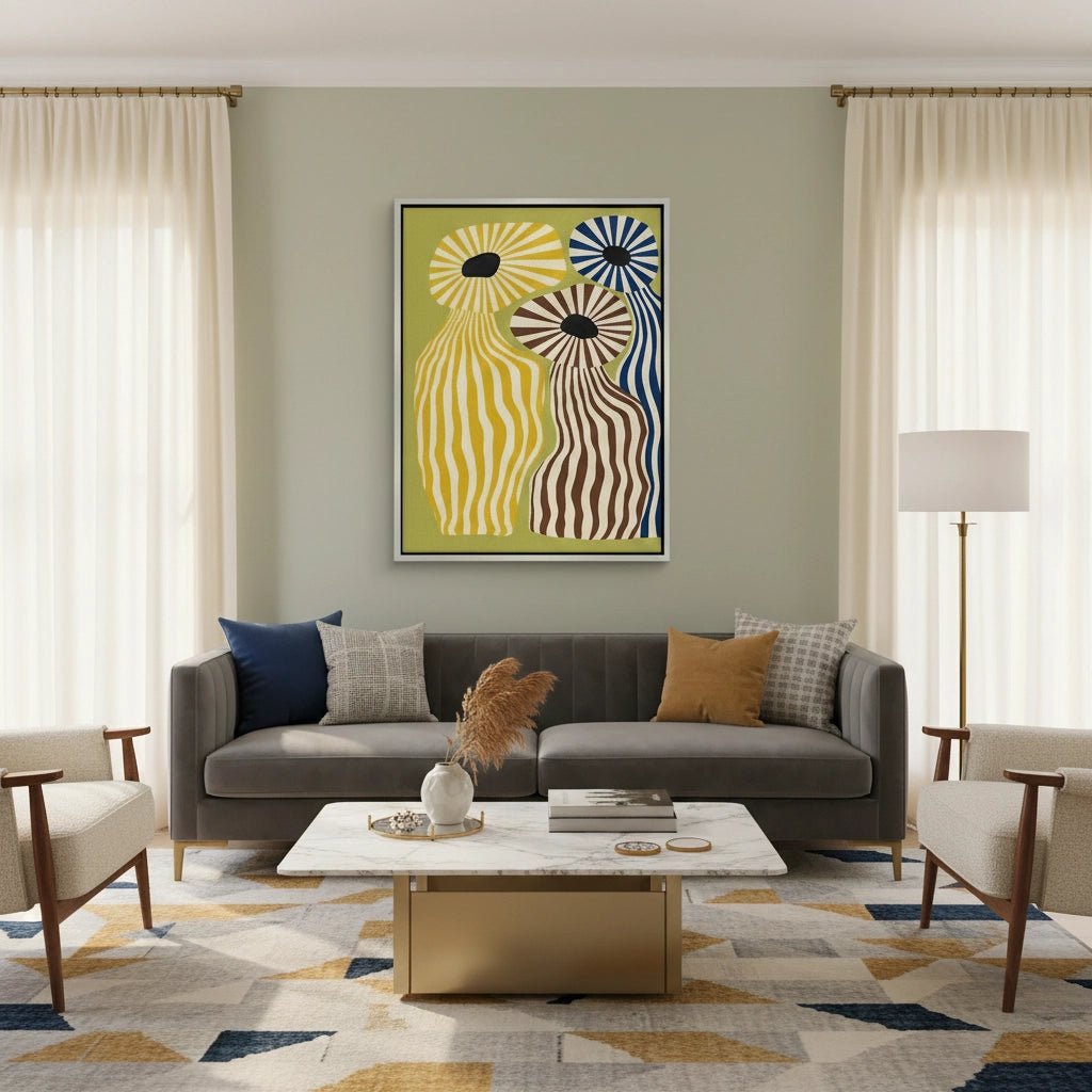 Infuse your home with a playful, artistic energy with the Wavy Botanical Silhouettes from Jasmine Art’s Bohemian series. This striking print features three abstract floral forms adorned with rhythmic stripes in mustard, indigo, and chocolate brown against a vibrant olive backdrop. Its dynamic graphic style and sunburst patterns bring a modern, eclectic focal point to any contemporary space. Finished with our signature premium vertical texture, this print offers exceptional tactile depth and a high-end gallery finish. A perfect statement piece for a creative studio, a lively lounge, or a modern office in Dubai.