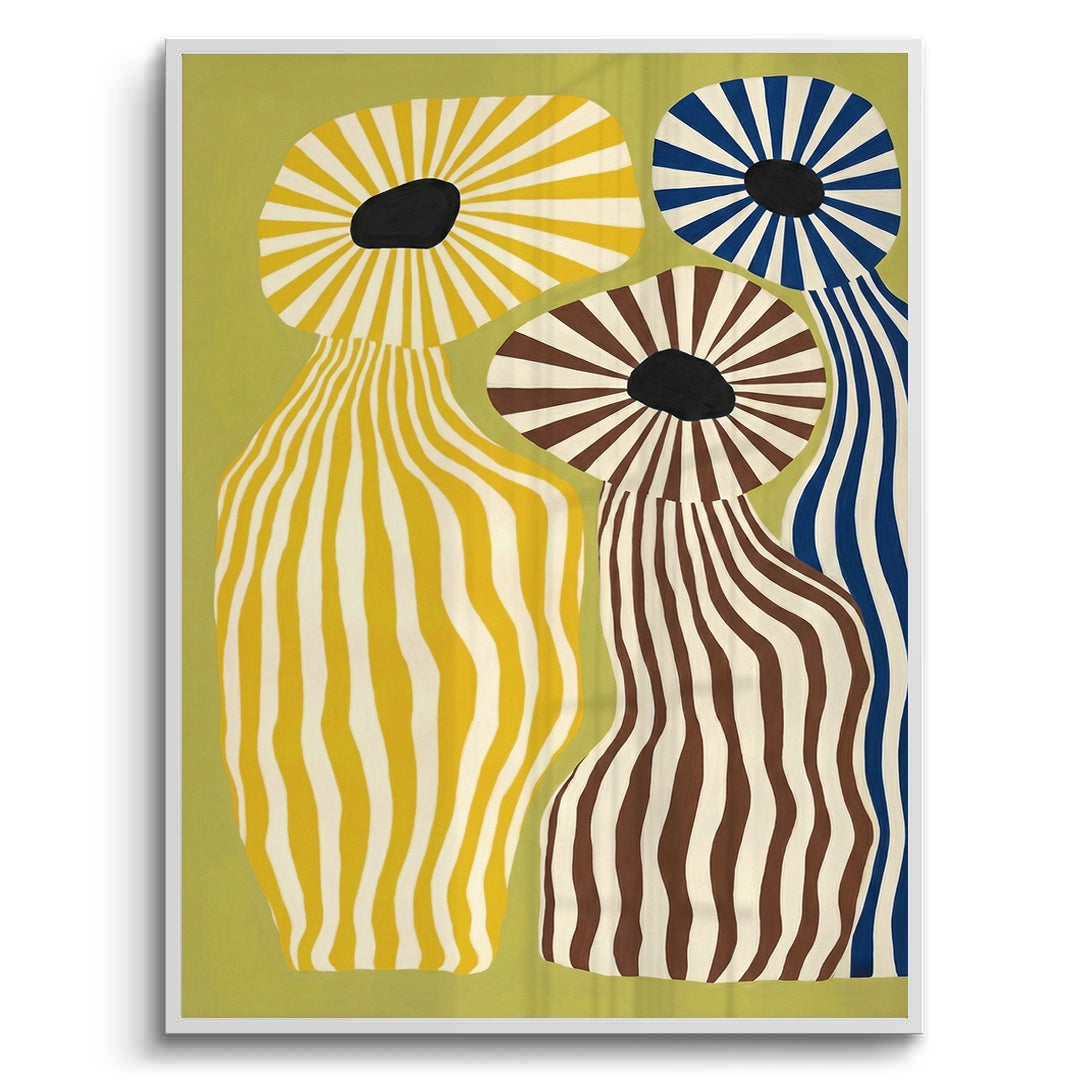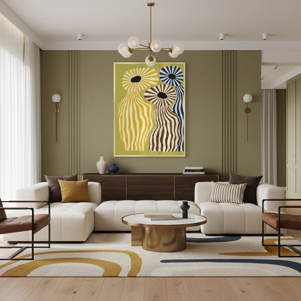 Infuse your home with a playful, artistic energy with the Wavy Botanical Silhouettes from Jasmine Art’s Bohemian series. This striking print features three abstract floral forms adorned with rhythmic stripes in mustard, indigo, and chocolate brown against a vibrant olive backdrop. Its dynamic graphic style and sunburst patterns bring a modern, eclectic focal point to any contemporary space. Finished with our signature premium vertical texture, this print offers exceptional tactile depth and a high-end gallery finish. A perfect statement piece for a creative studio, a lively lounge, or a modern office in Dubai.