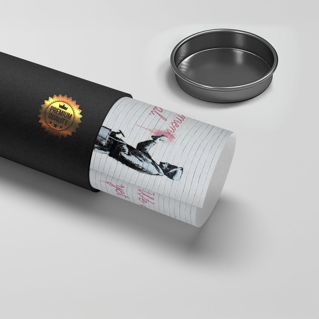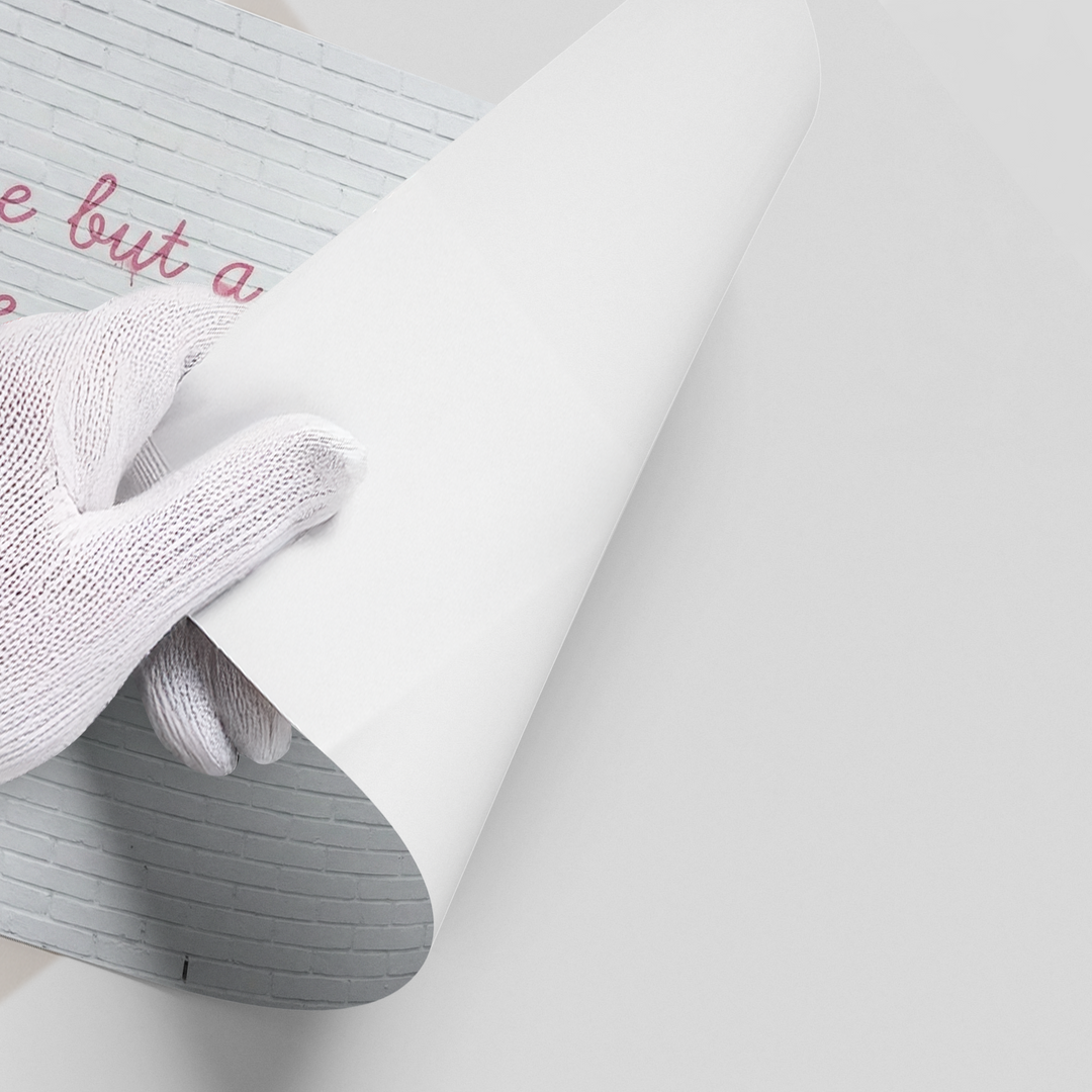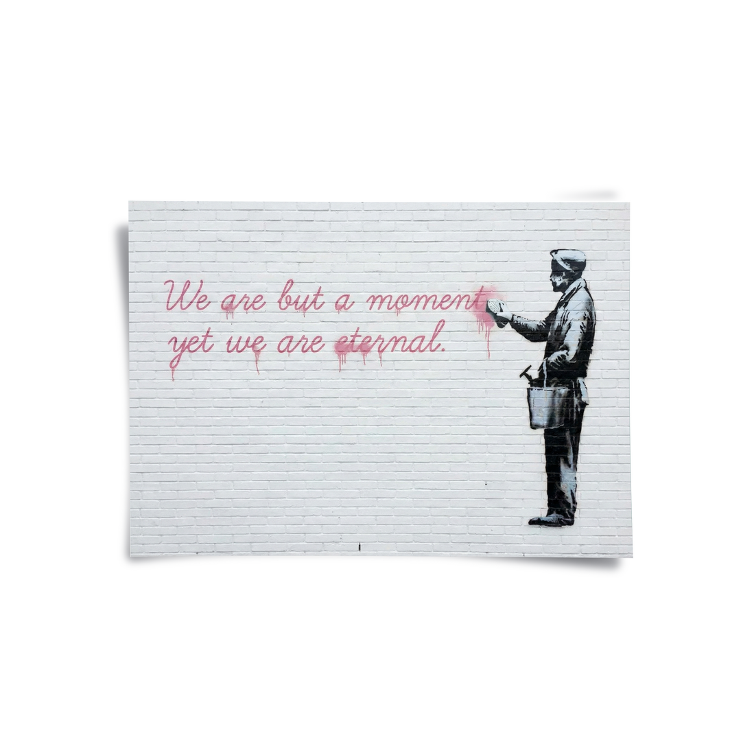 Inspire your space with the profound message of We Are But a Moment from Jasmine Art’s Banksy series. This striking street-art print captures a stencil painter mid-stroke, lettering a poetic reminder of life's fleeting yet eternal nature against a realistic brick backdrop. The delicate pink dripping paint against the gritty urban stencil creates a perfect balance of edge and elegance. Finished with our signature premium vertical texture, this artwork provides exceptional tactile depth and a high-end gallery finish. A thought-provoking statement piece for a minimalist study, a modern hallway, or a creative office in Dubai.