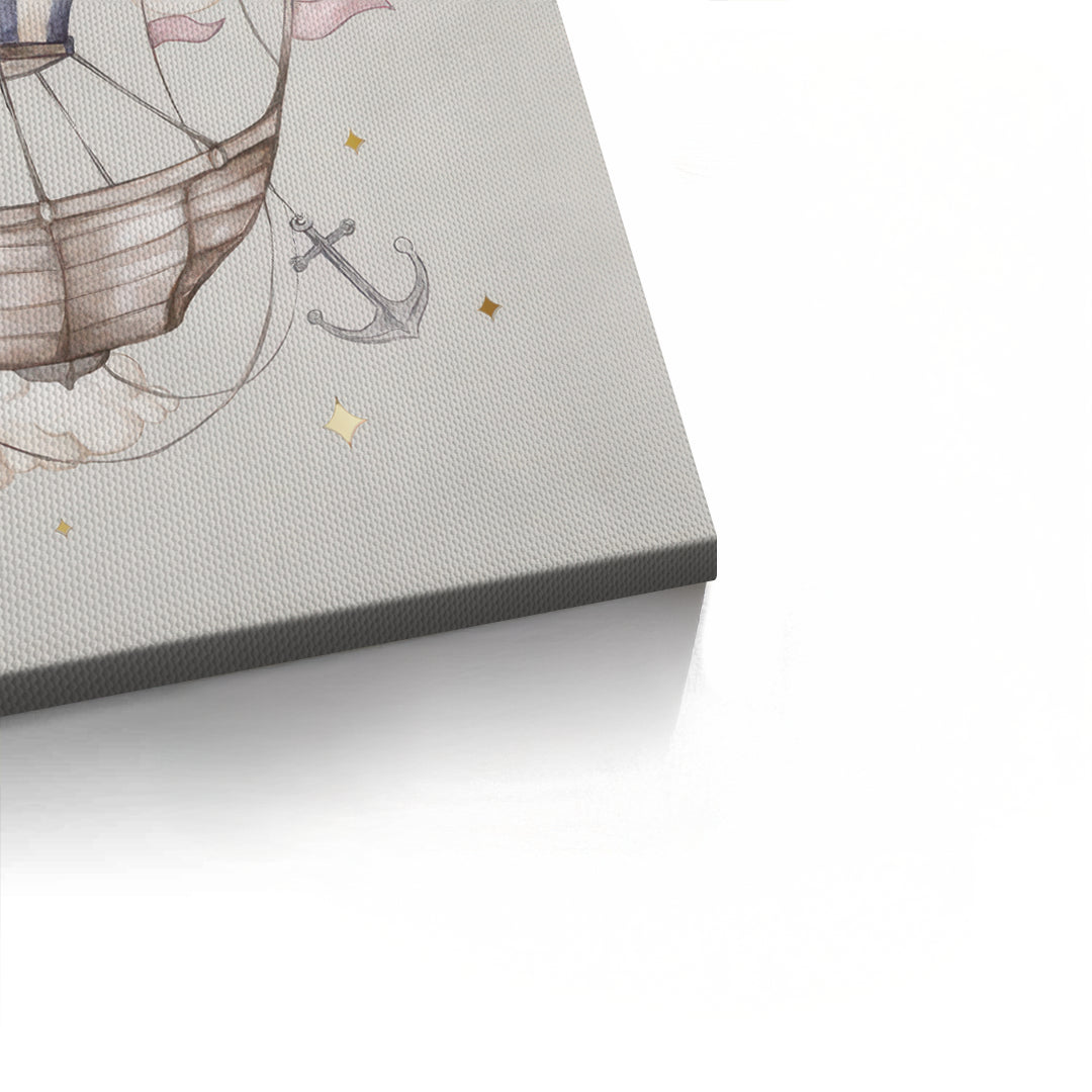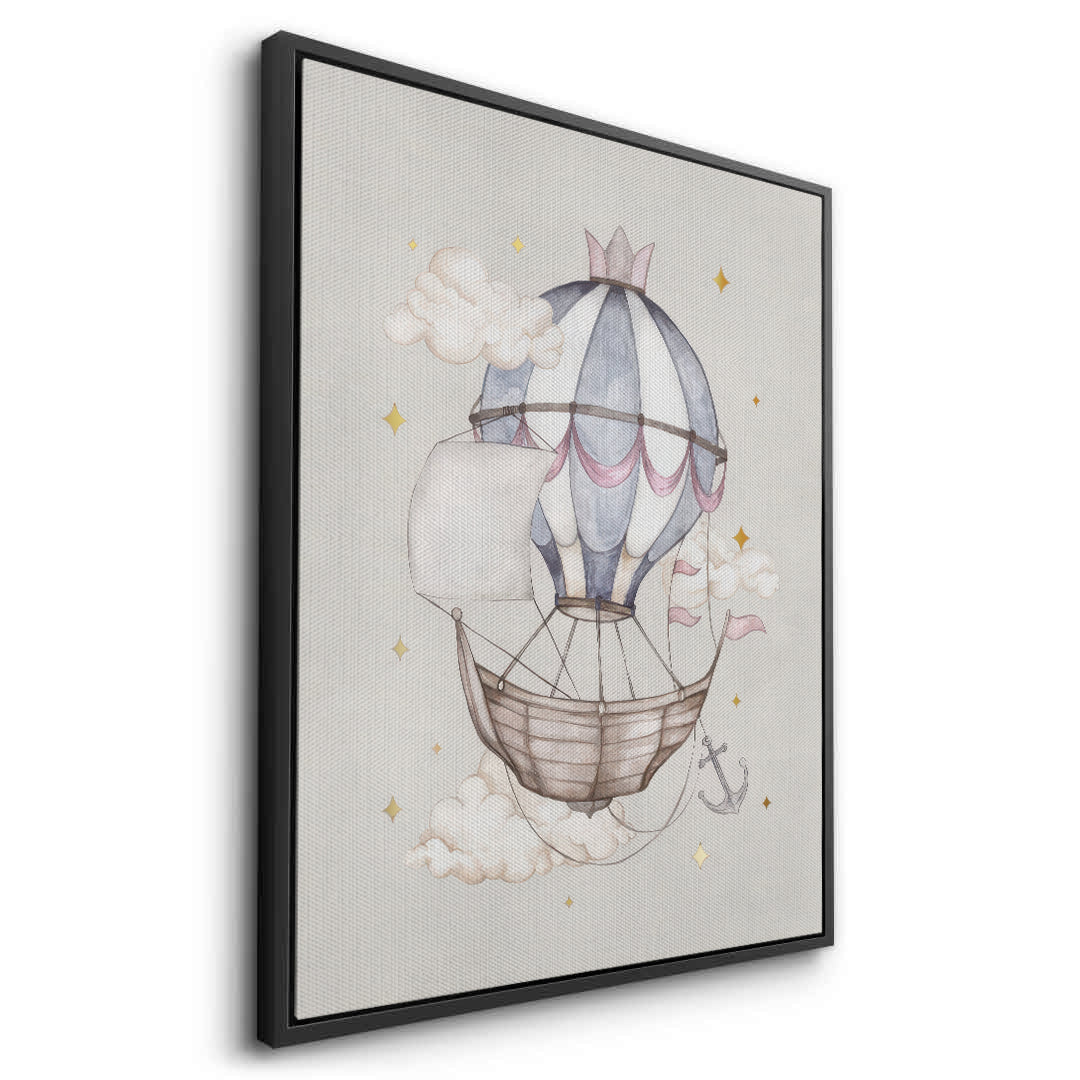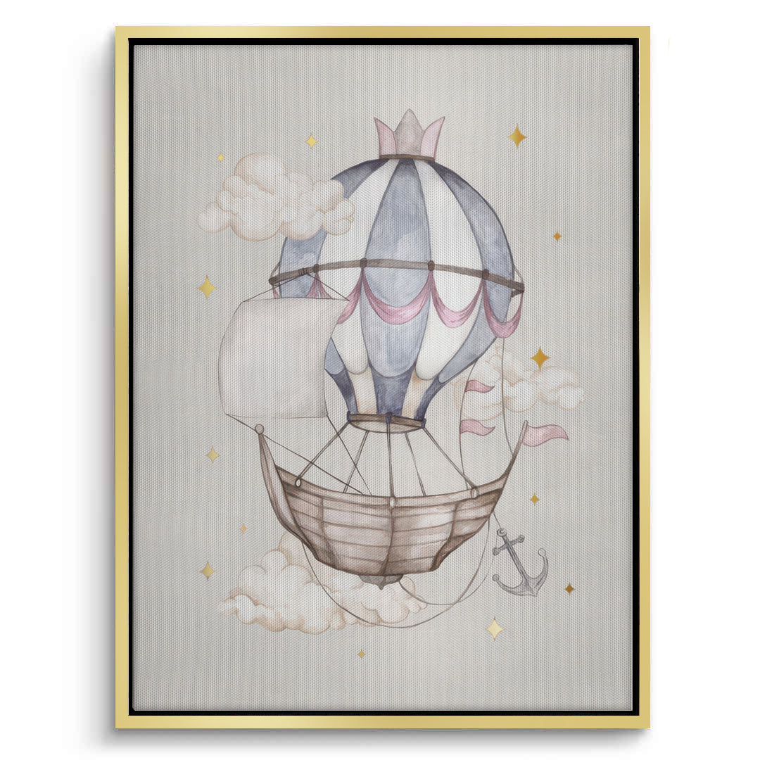 The enchanting Whimsical Royal Hot Air Balloon print invites your child into a world of lofty adventure and fairy-tale dreams. This intricate watercolor illustration features a crowned, vintage hot air balloon with a ship-like basket, soaring amongst soft clouds. The artwork is accented by shimmering gold foil stars, adding a touch of magic and luxury. With its muted, sophisticated palette, this piece is ideal for adding a royal, dreamy, and imaginative adventure theme to a nursery or child’s room in Dubai.