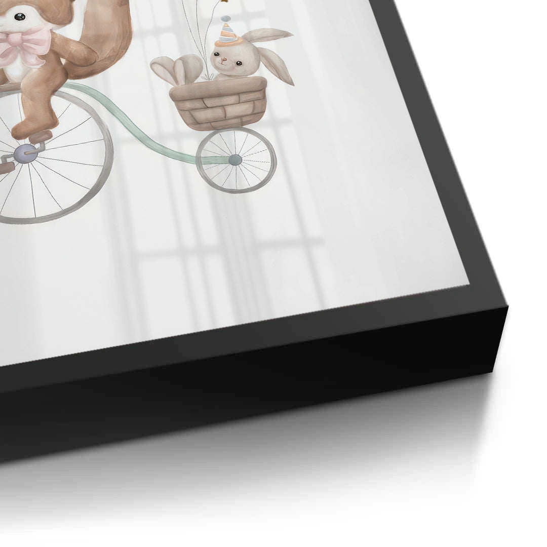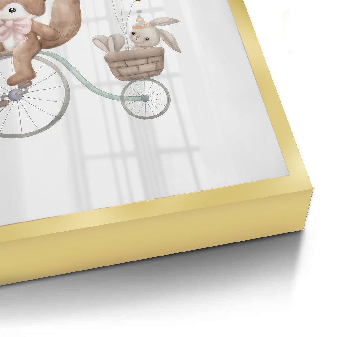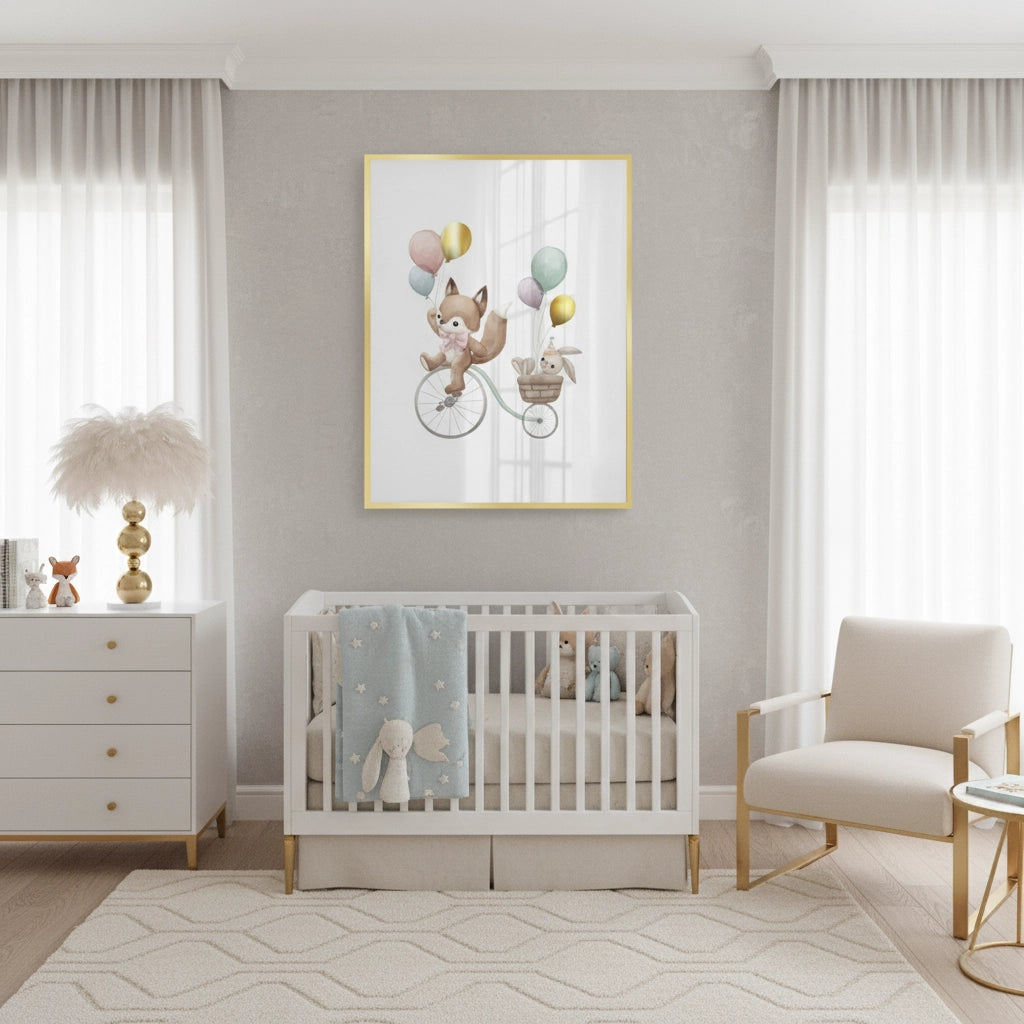 The absolutely enchanting Whimsical Woodland Friends print captures a joyous journey between a fox on a bicycle and a bunny riding in the basket. This delightful scene is elevated by the inclusion of shimmering metallic gold balloons, adding a touch of playful luxury to the whimsical charm. It's an ideal piece of statement art for a nursery or playroom in your Dubai home.