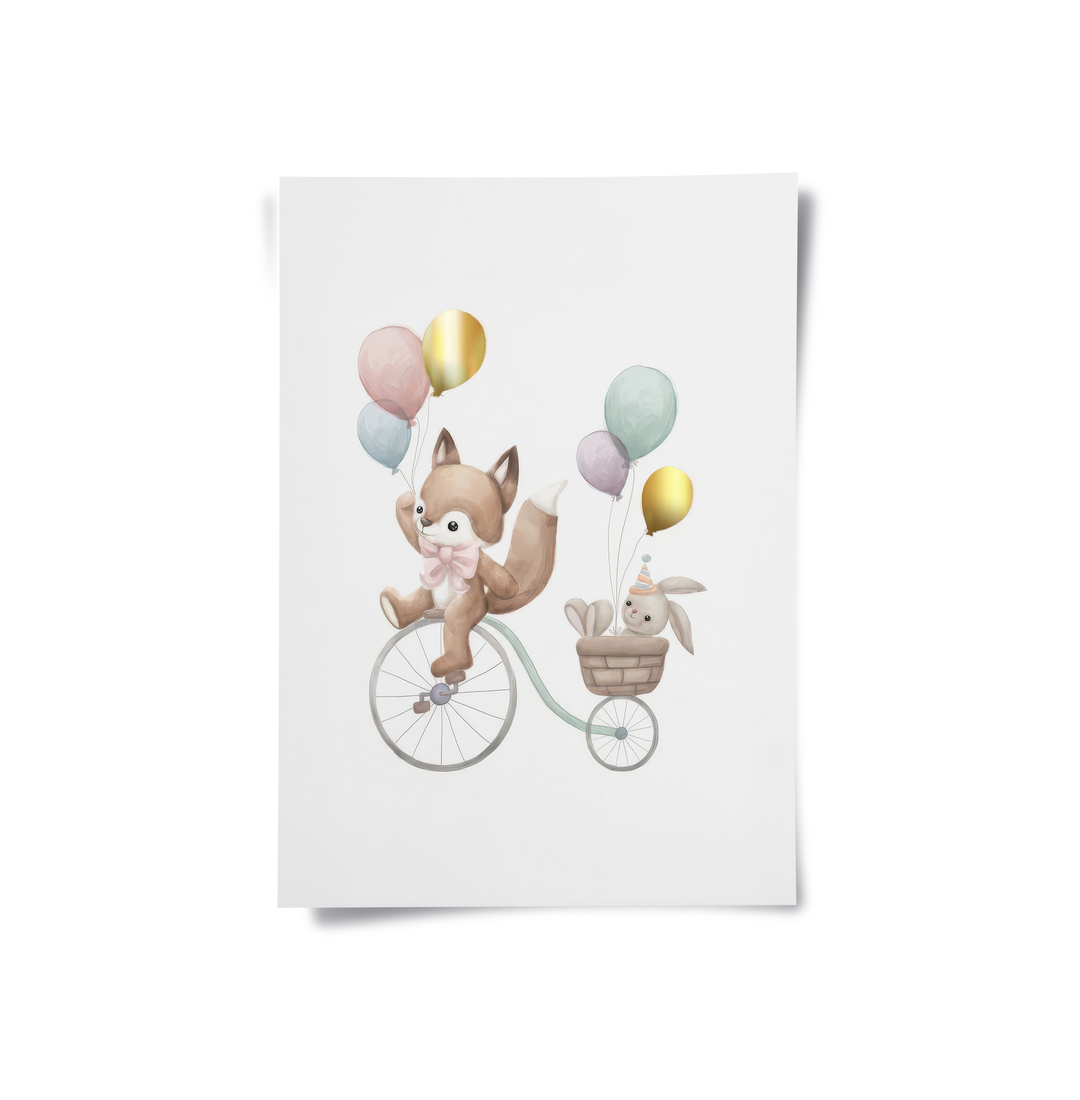The absolutely enchanting Whimsical Woodland Friends print captures a joyous journey between a fox on a bicycle and a bunny riding in the basket. This delightful scene is elevated by the inclusion of shimmering metallic gold balloons, adding a touch of playful luxury to the whimsical charm. It's an ideal piece of statement art for a nursery or playroom in your Dubai home.