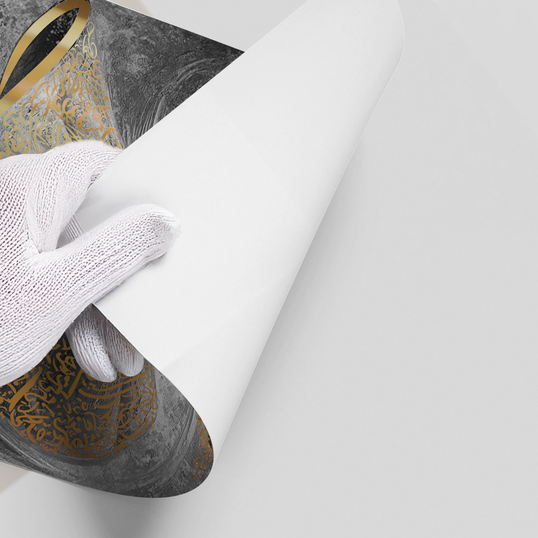 The transcendent Whirling Dervish - Gold Sufi Art print is a powerful expression of spiritual ecstasy and Rumi's philosophy. The artwork features a Sufi Dervish in a meditative, whirling dance, with the entire figure meticulously formed from intricate metallic gold Arabic calligraphy. The dense script captures the dynamic, flowing motion of the Sema. Set against a dramatic monochromatic, textured abstract background, this piece adds a deeply spiritual, artistic, and luxurious focal point. Ideal for contemplative spaces, studios, or upscale homes in Dubai.