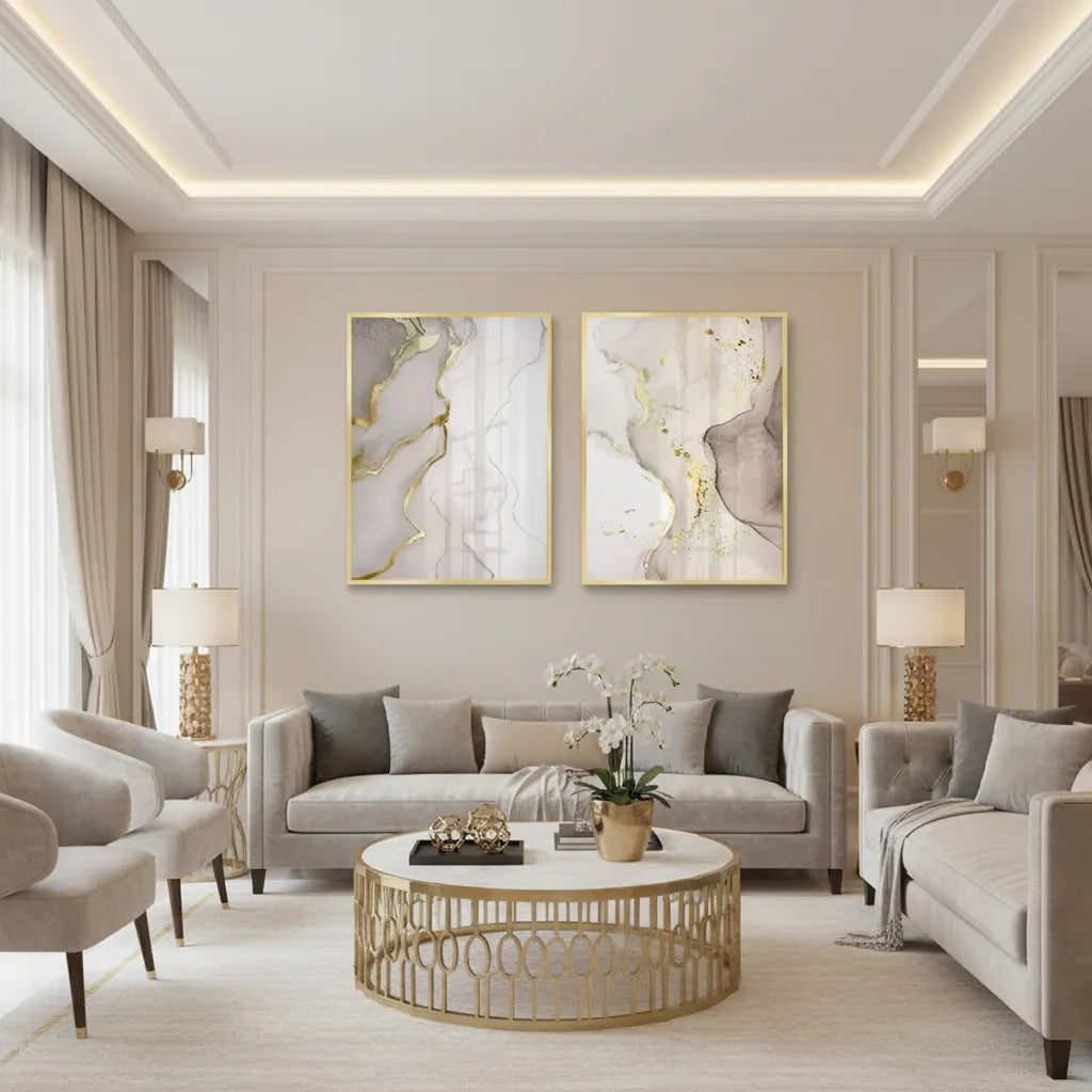 This beautiful two-piece set is defined by its subtlety and calming presence. The soft texture and 'whispering' gold shimmer create a peaceful, luxurious atmosphere. It is the perfect choice for the master bedroom or any intimate area where tranquil elegance is desired.