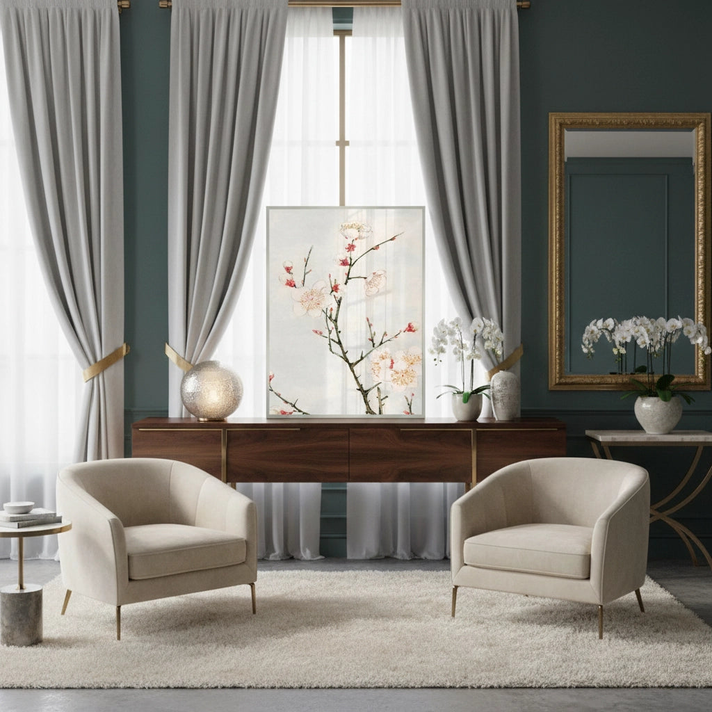 Embrace the serenity of nature with the White Plum Blossoms from Jasmine Art’s Bohemian series. This exquisite print captures the delicate grace of snowy white blossoms and red buds on a slender branch against a cool, airy backdrop. Its minimalist East Asian-inspired aesthetic brings a sense of peace and timeless elegance to any modern living space. Finished with our signature premium vertical texture, this print provides exceptional tactile depth and a high-end gallery finish. A perfect zen-inspired accent for a serene bedroom, a light-filled lounge, or a professional office in Dubai.